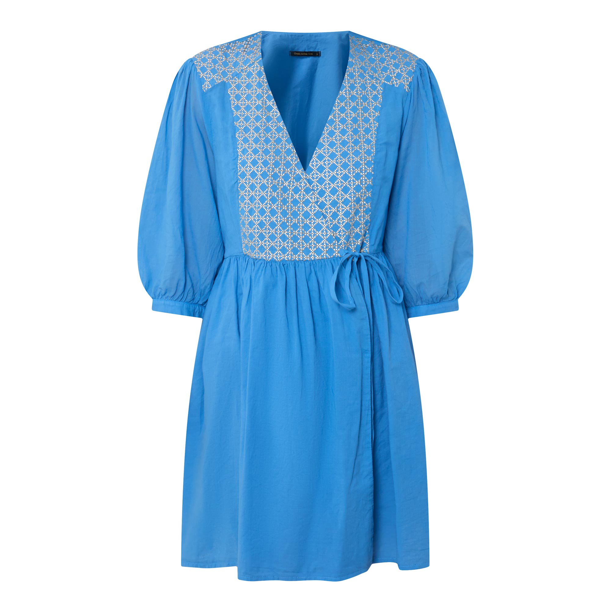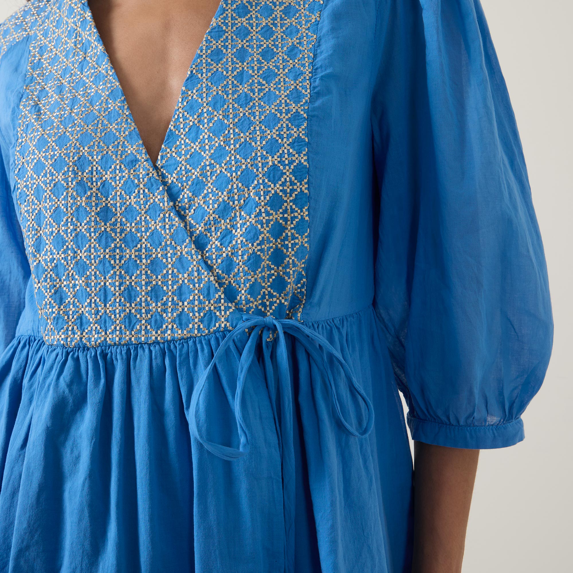 - V-neckline, pleated shoulders, half length sleeves, bound cuffs, wrap-style front, side tie fastening, fitted through the waist, flared skirt, embroidered design along the bodice and across the shoulders, mini length
