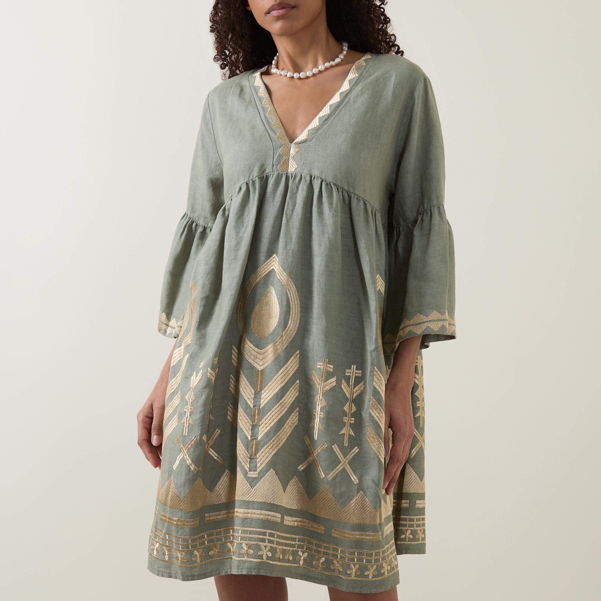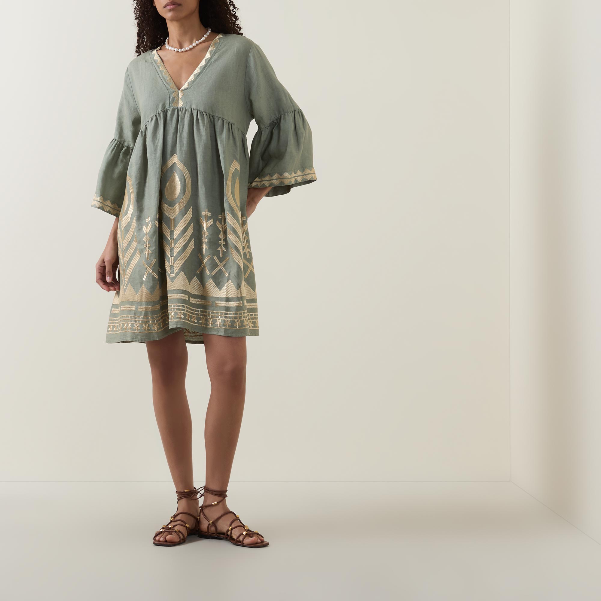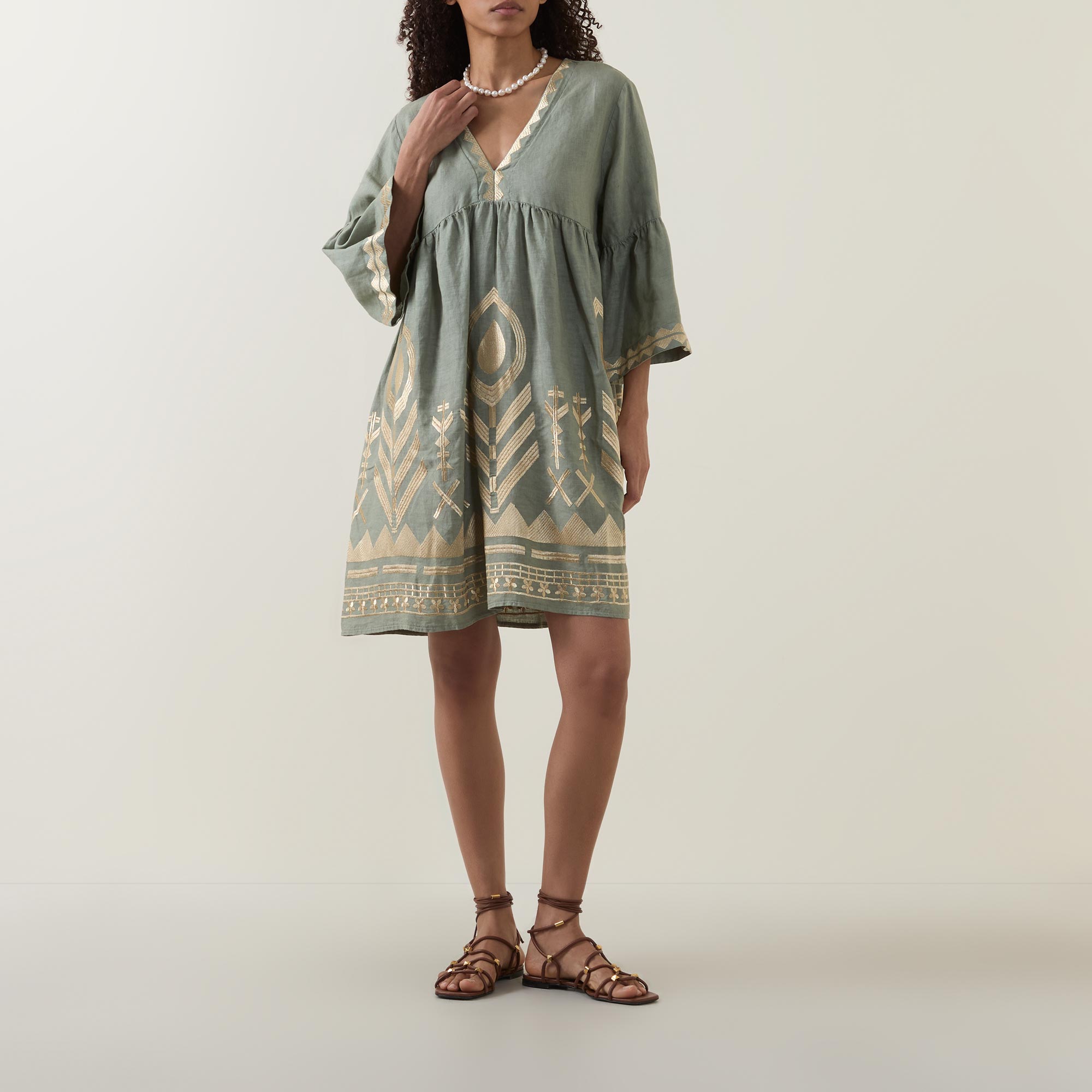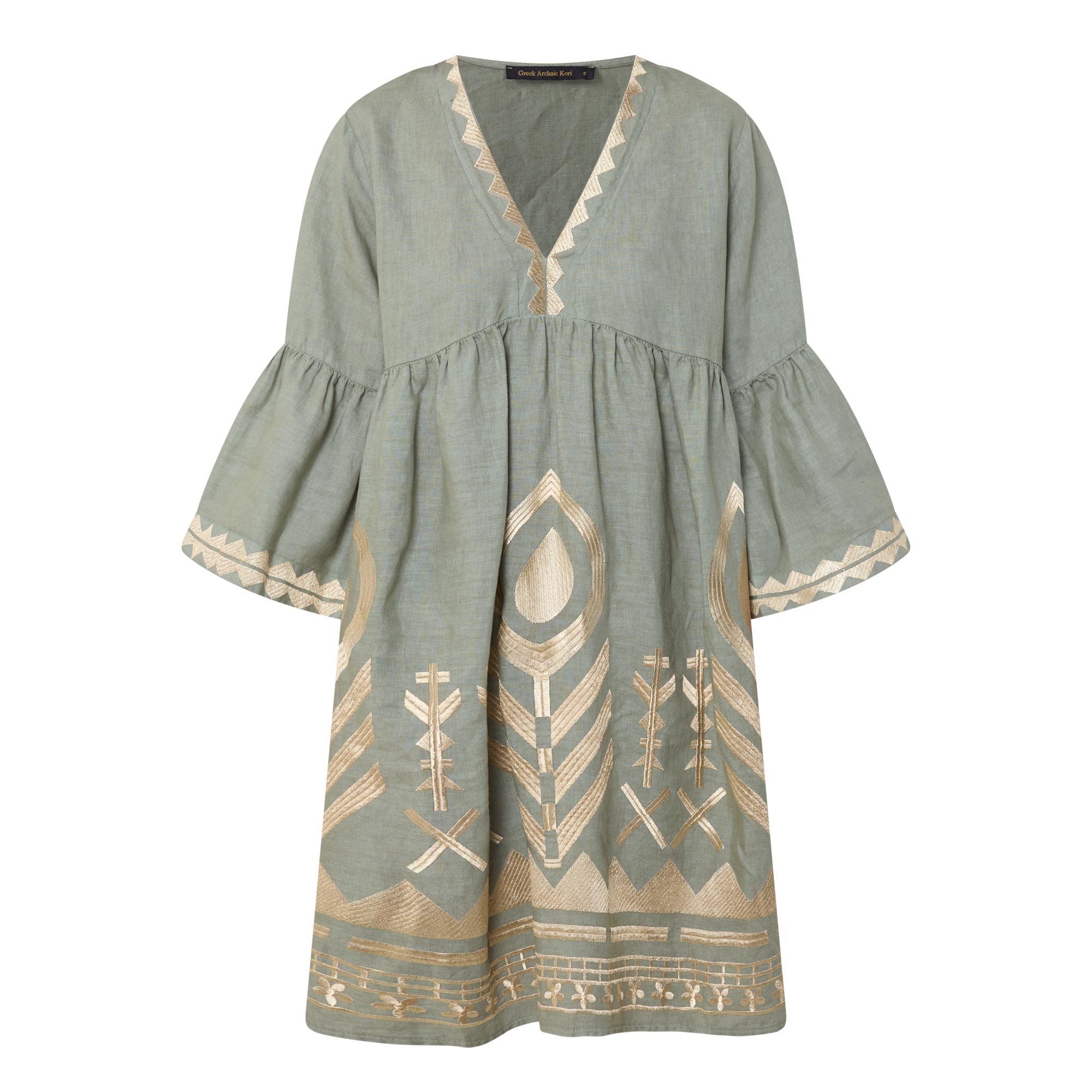GREEK ARCHAIC KORI Feather Embroidered Linen Mini Dress