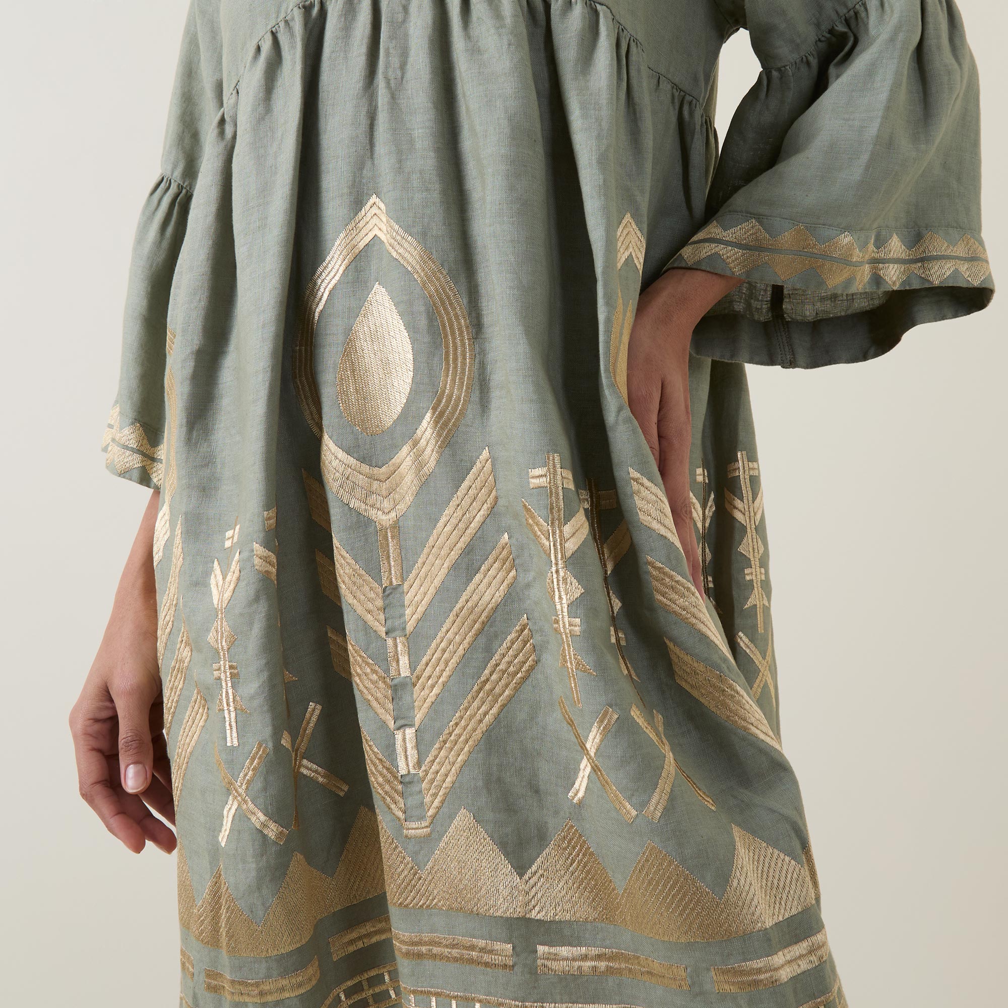 • V-neckline, dropped shoulders, half length sleeves, flared cuffs, slightly fitted through the waist, flared skirt, embroidered detailing throughout, pull-on style, mini length