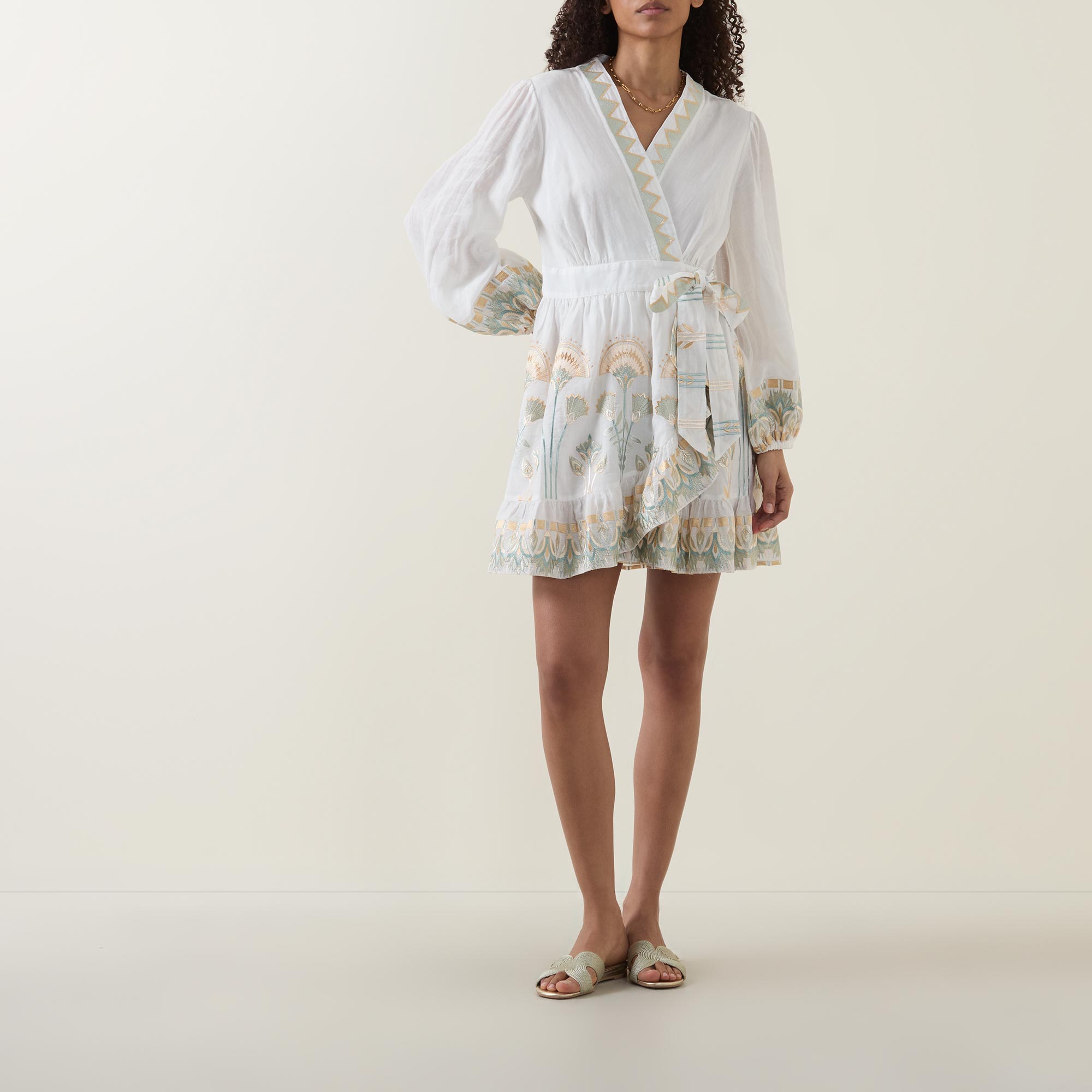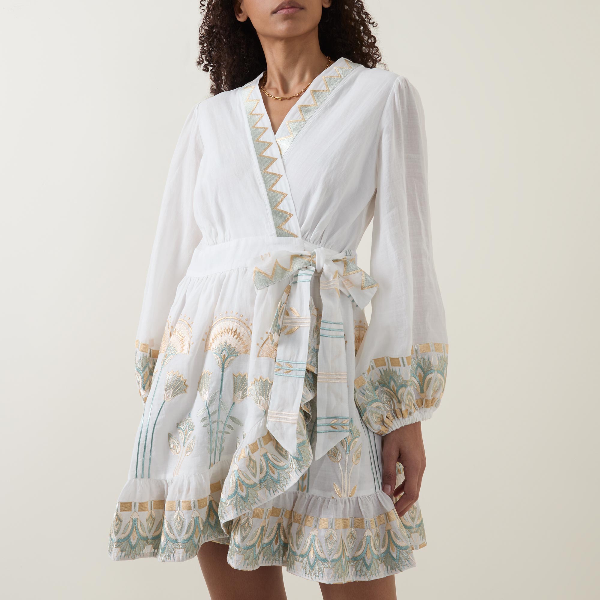 - V-neckline, pleated shoulders, long blouson sleeves, elasticated cuffs, wrap-style front, matching belt fastening, fitted through the waist, flared hem, embroidered design, mini length