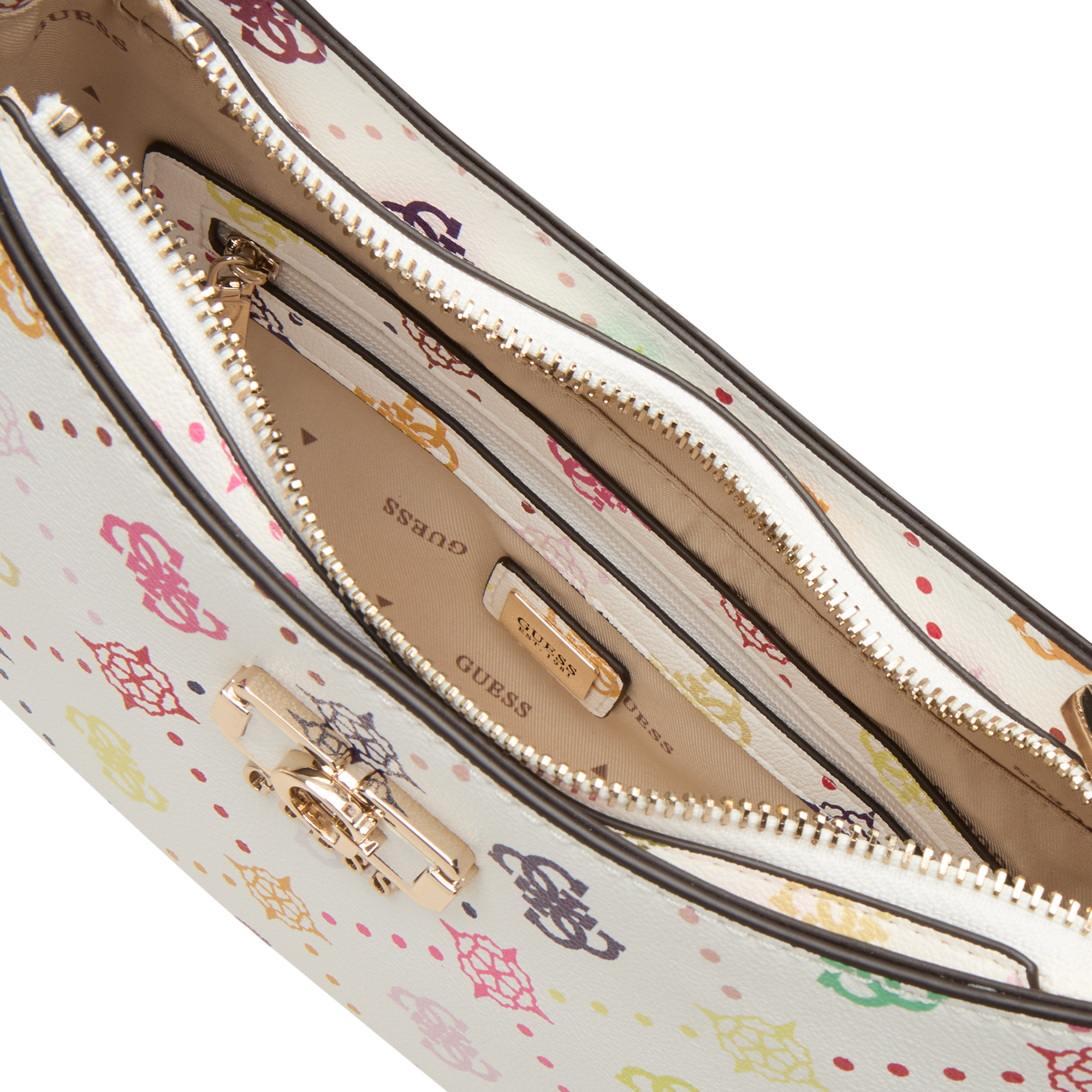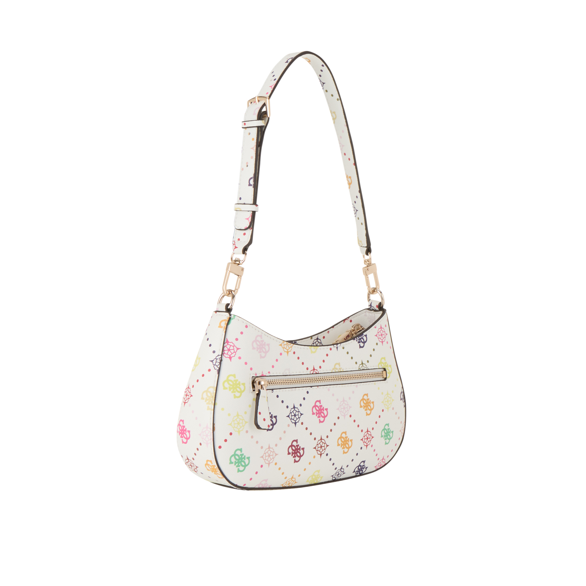 - Adjustable shoulder strap, all-over logo print, curved silhouette, gold-toned hardware, metal monogram, rear zip compartment, top zip compartment