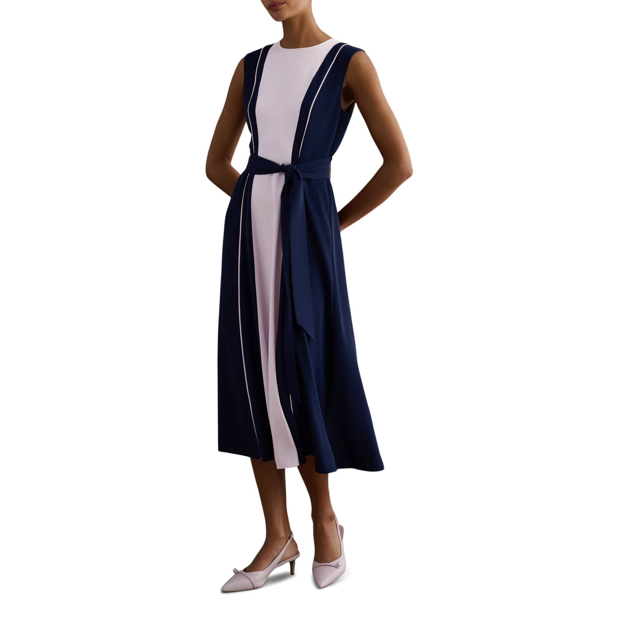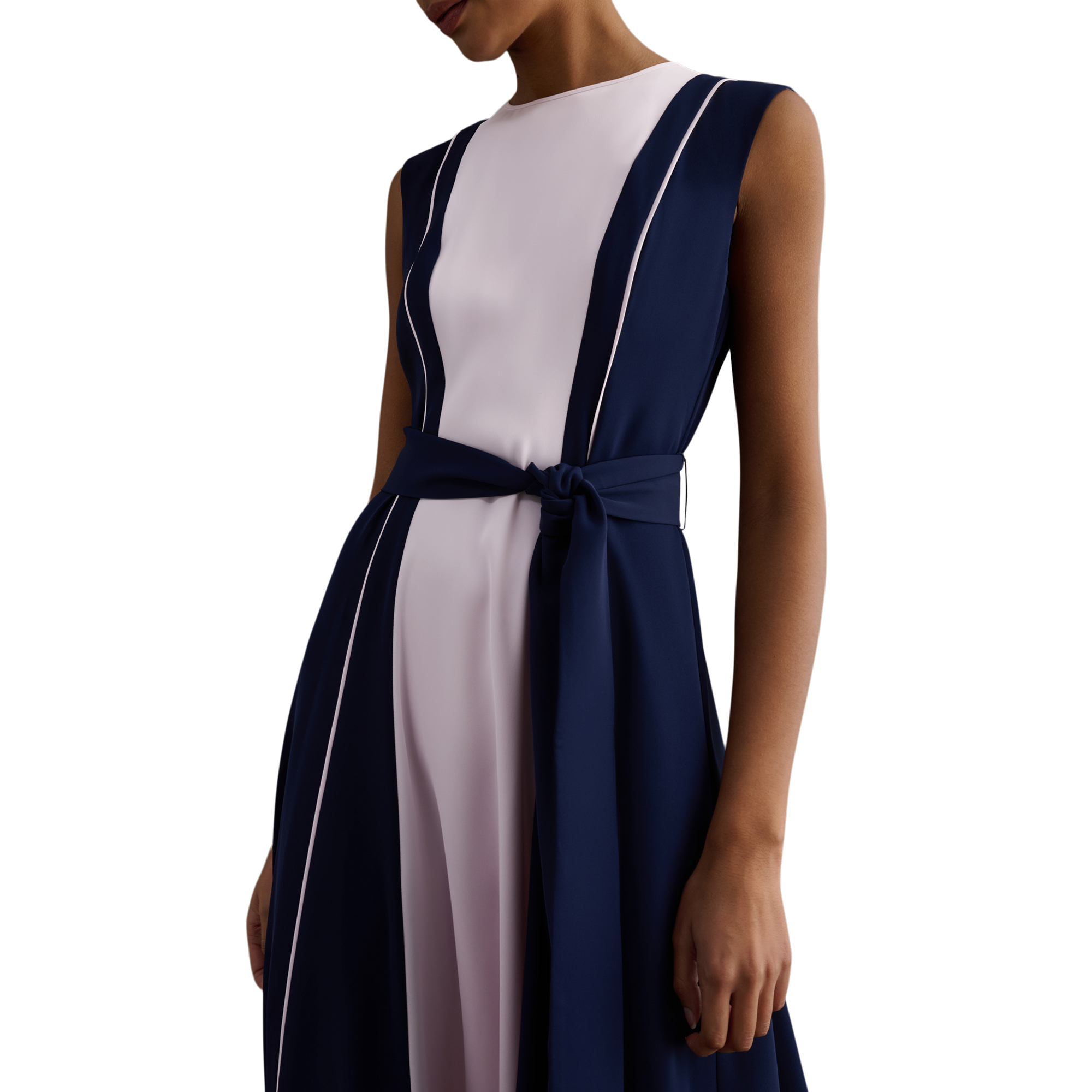 • Colour-block design, panelling, fit-and-flare shape, tie-waist, sleeveless cut, piped trim detail, crew neckline, midi length, short grown-on sleeves, zip and hook and eye fastening, woven, fully lined
