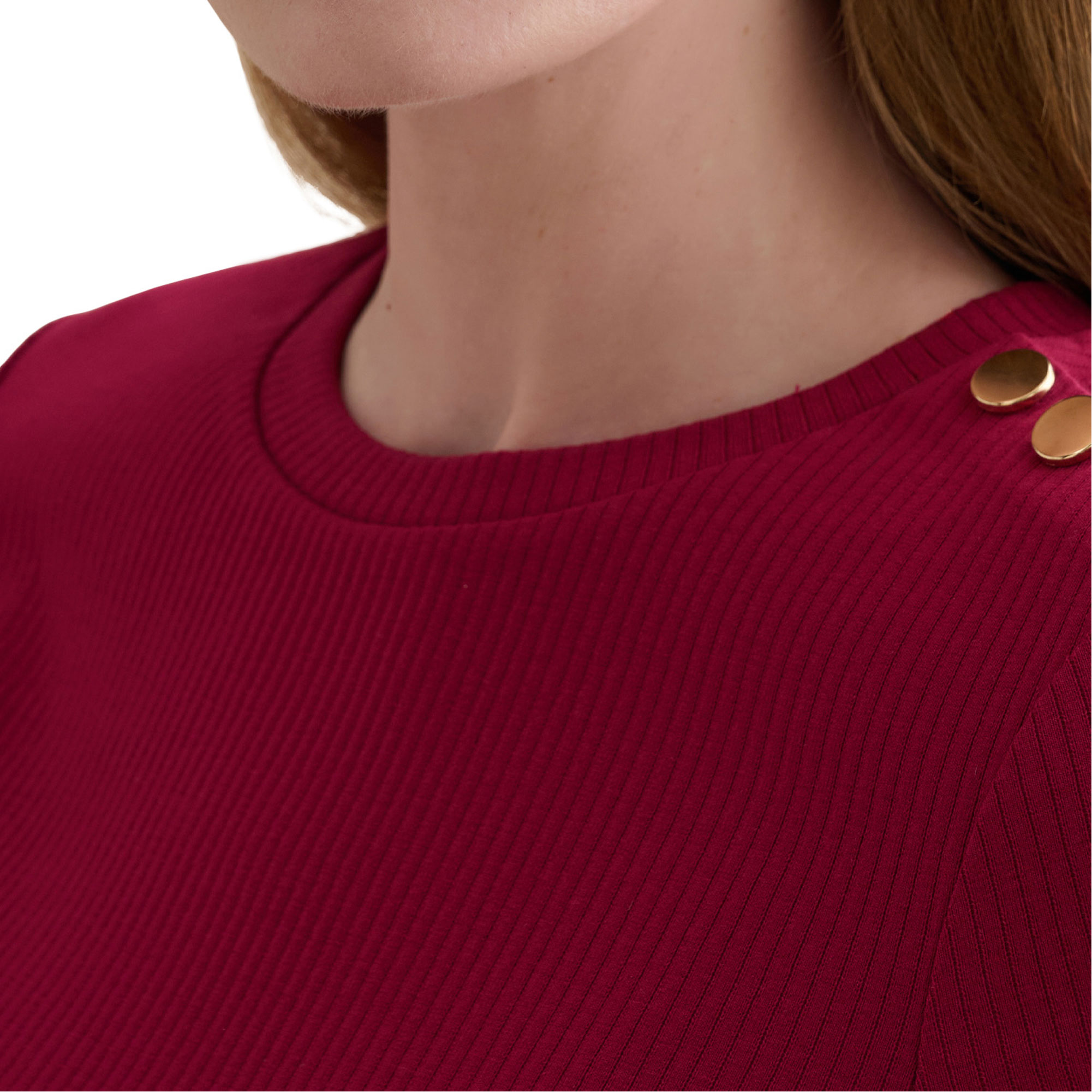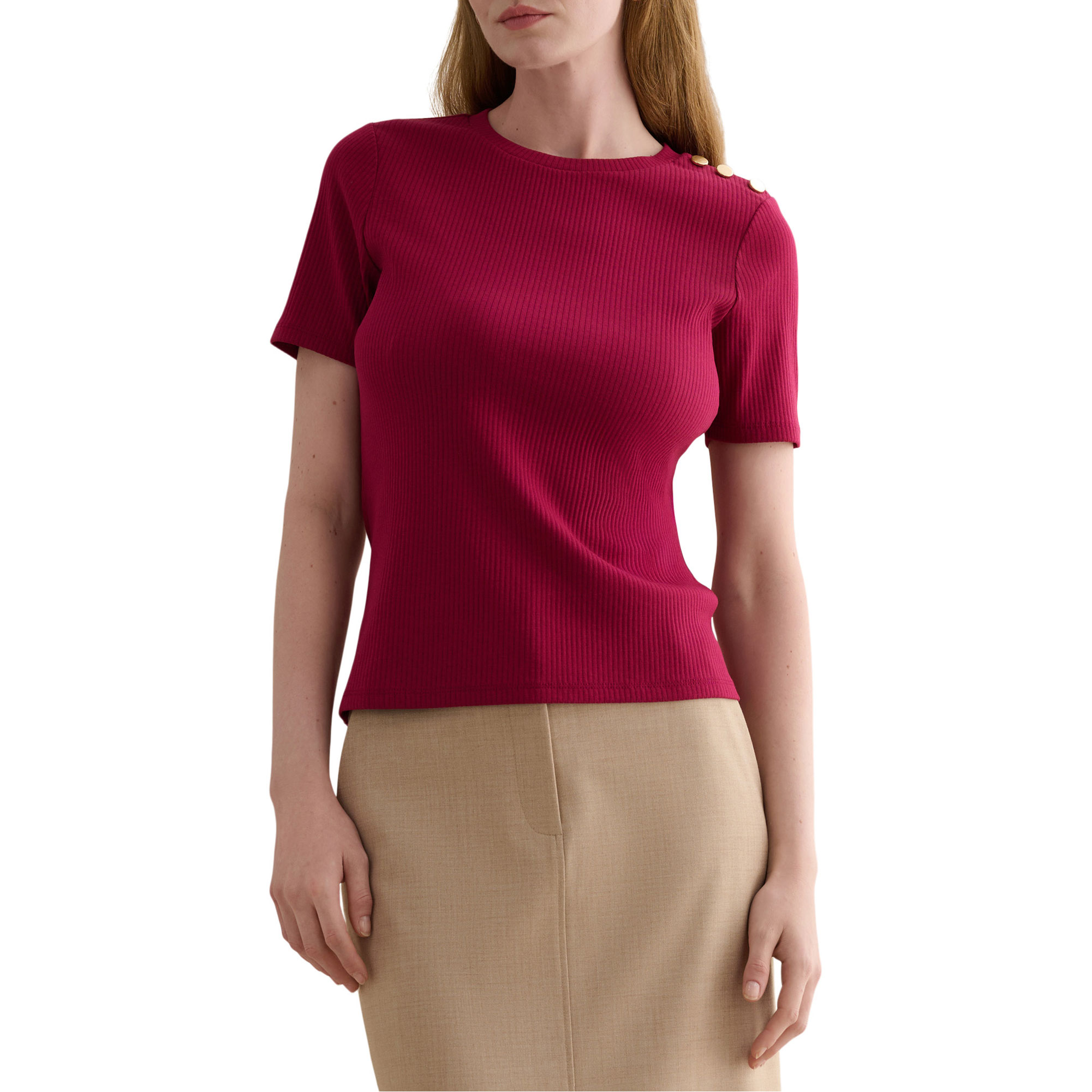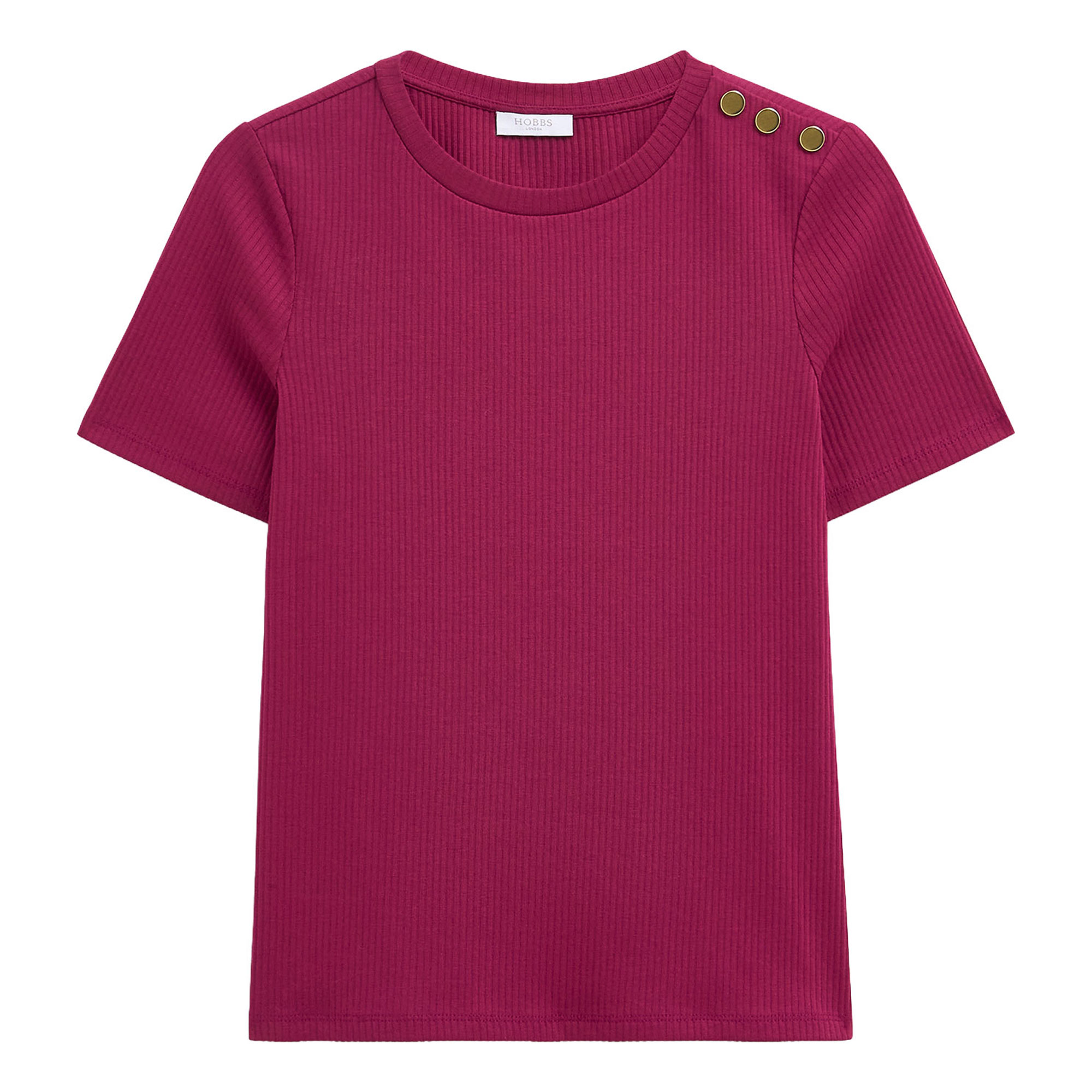 • Ribbed finish, gold-tone shoulder buttons, short sleeve, round neckline, jersey fabric