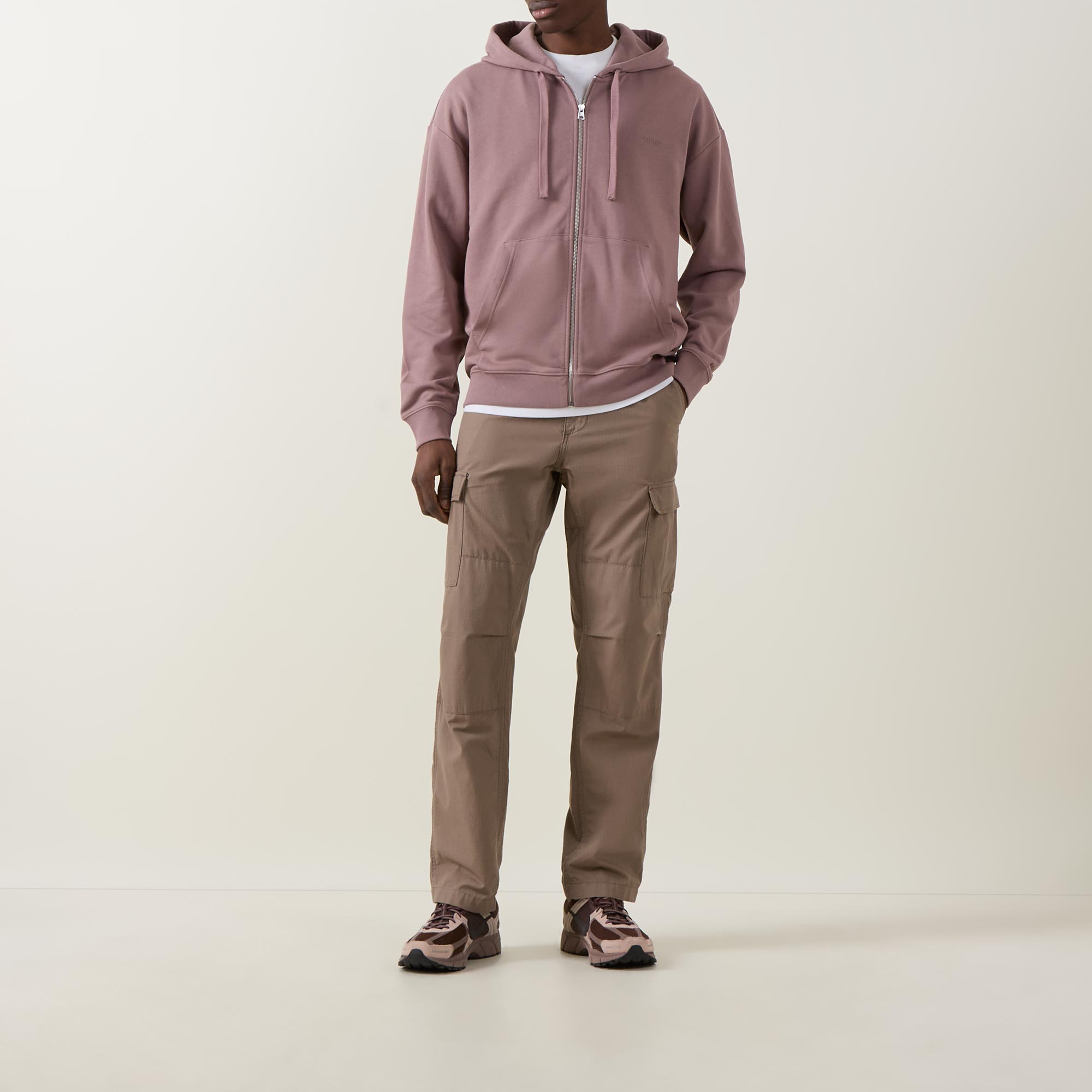 - Hood with drawstring adjustable fit, side entry pockets, long sleeves, dropped shoulders, ribbed trims, zip fastening, logo details