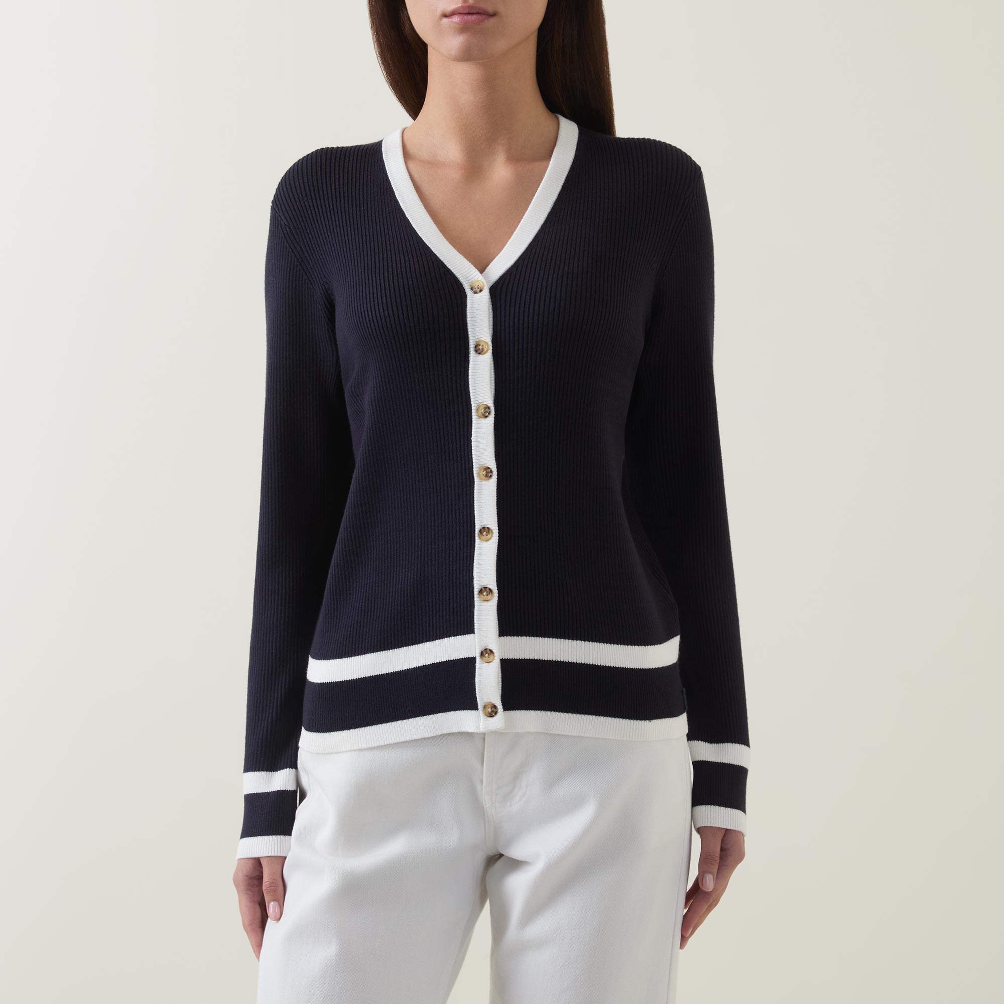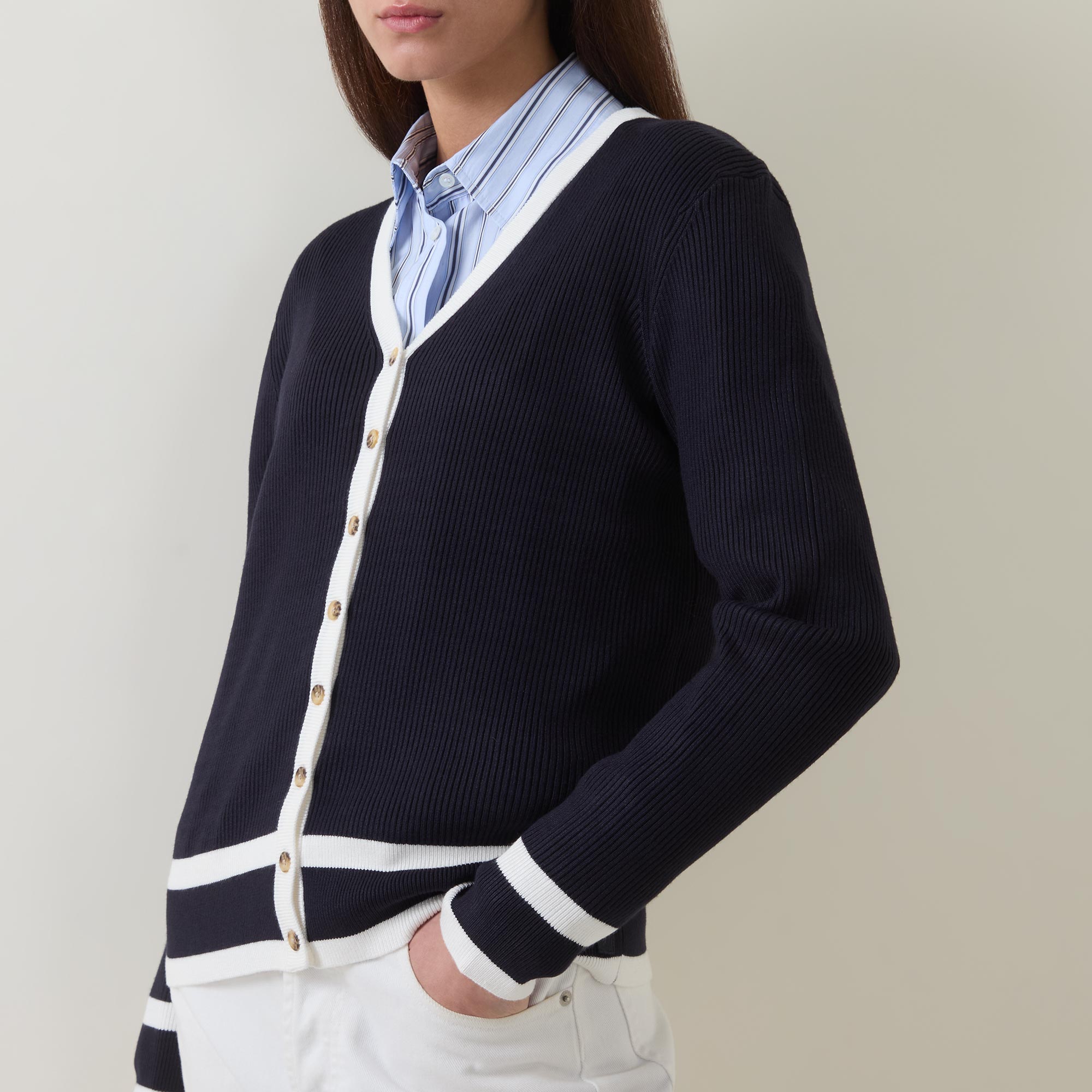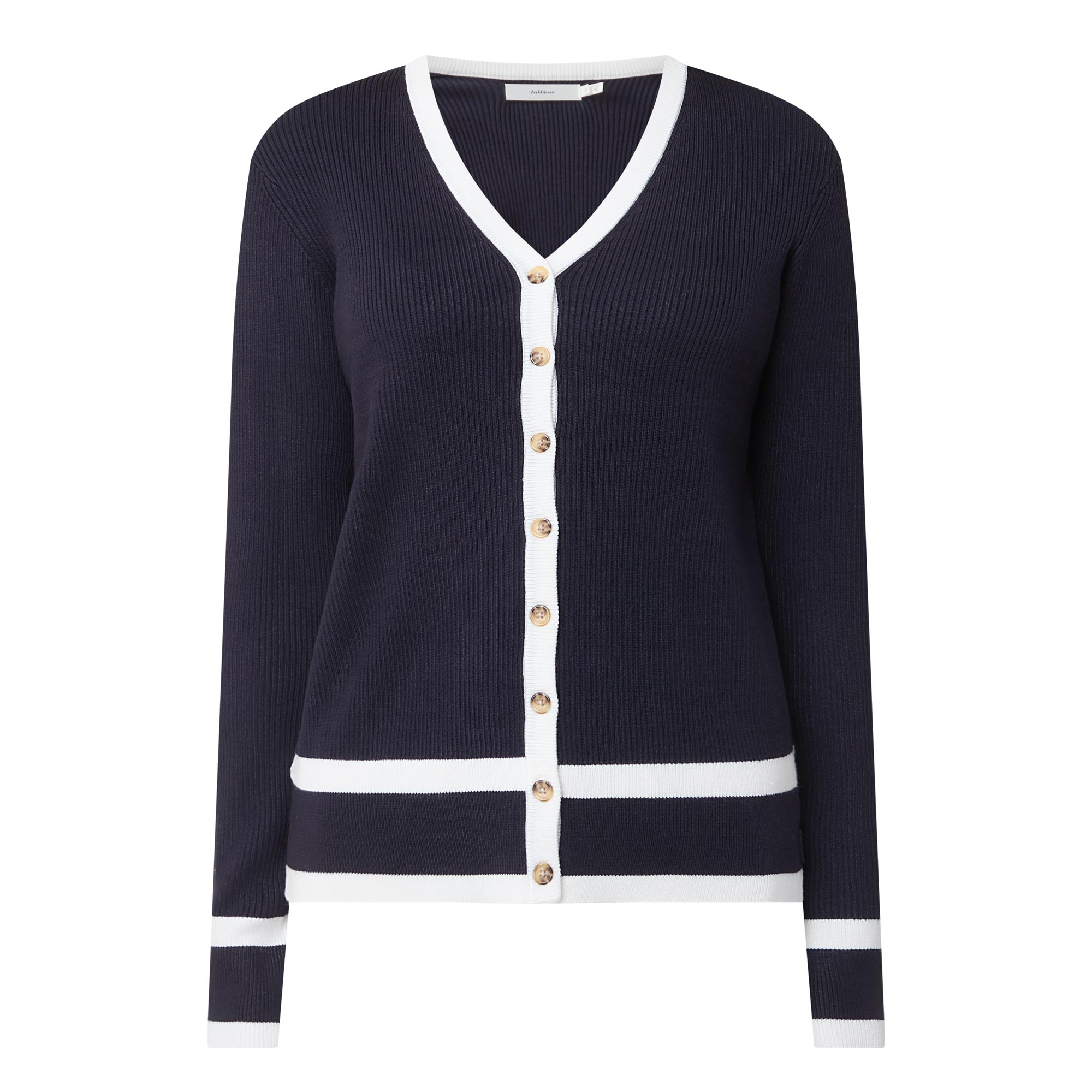 - V-neckline, long sleeves, ribbed trims, knit structure, stripe details, full button fastening