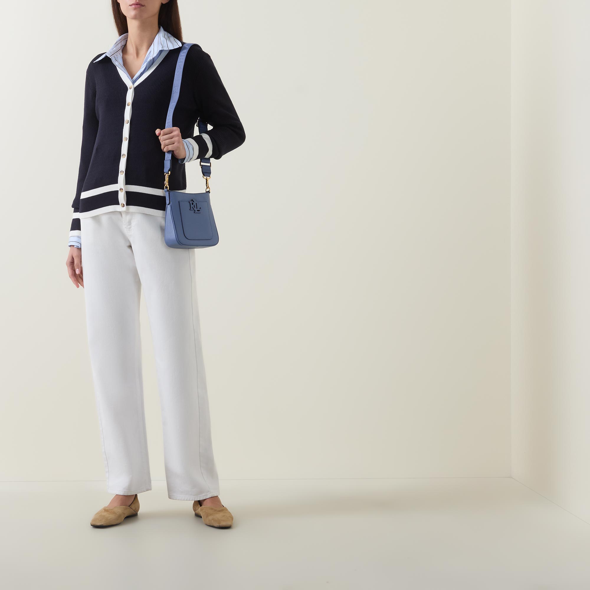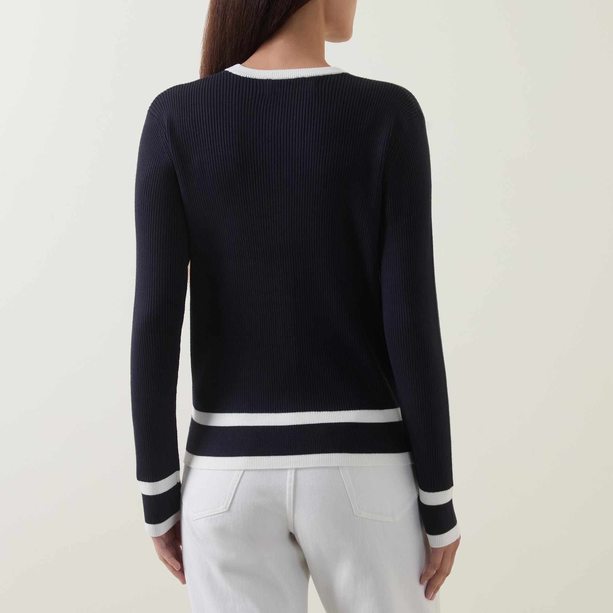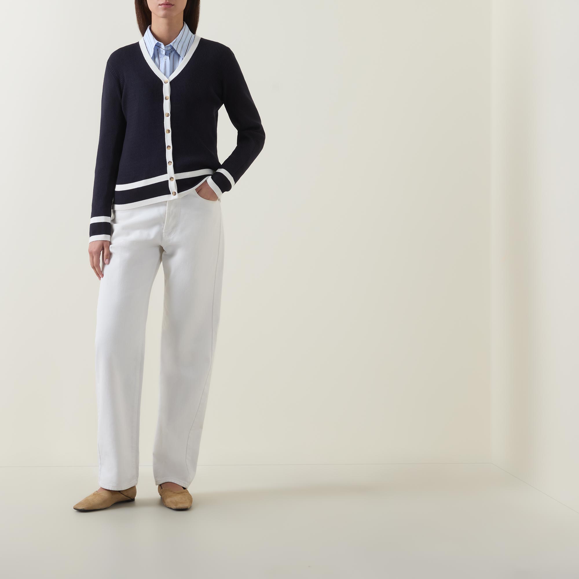 - V-neckline, long sleeves, ribbed trims, knit structure, stripe details, full button fastening