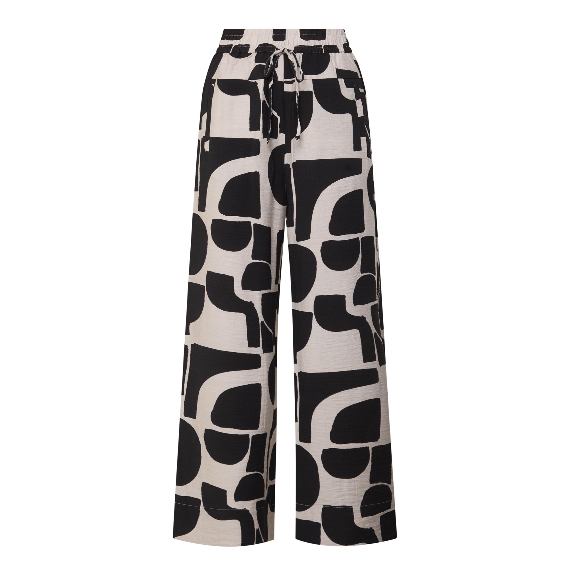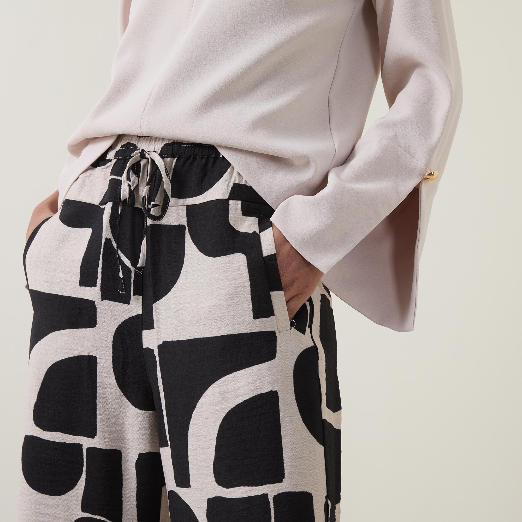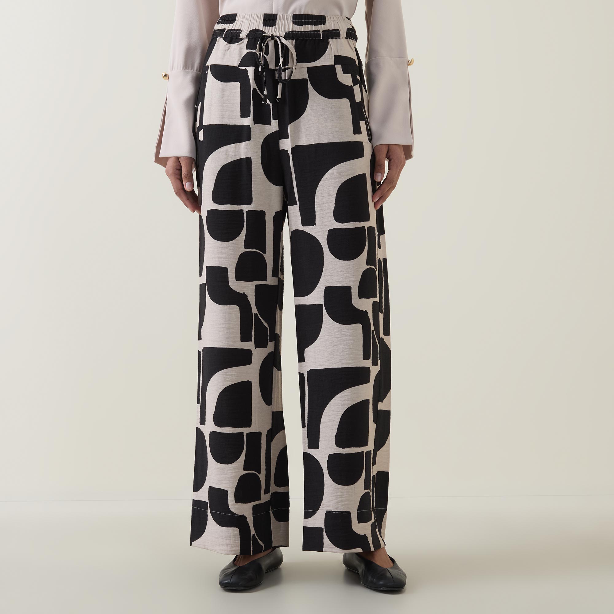 • High-rise, wide-leg, full length, elasticated waistband, adjustable drawstring fastening, two side entry pockets, one rear patch pocket, clean hems, two-tone pattern, lightweight