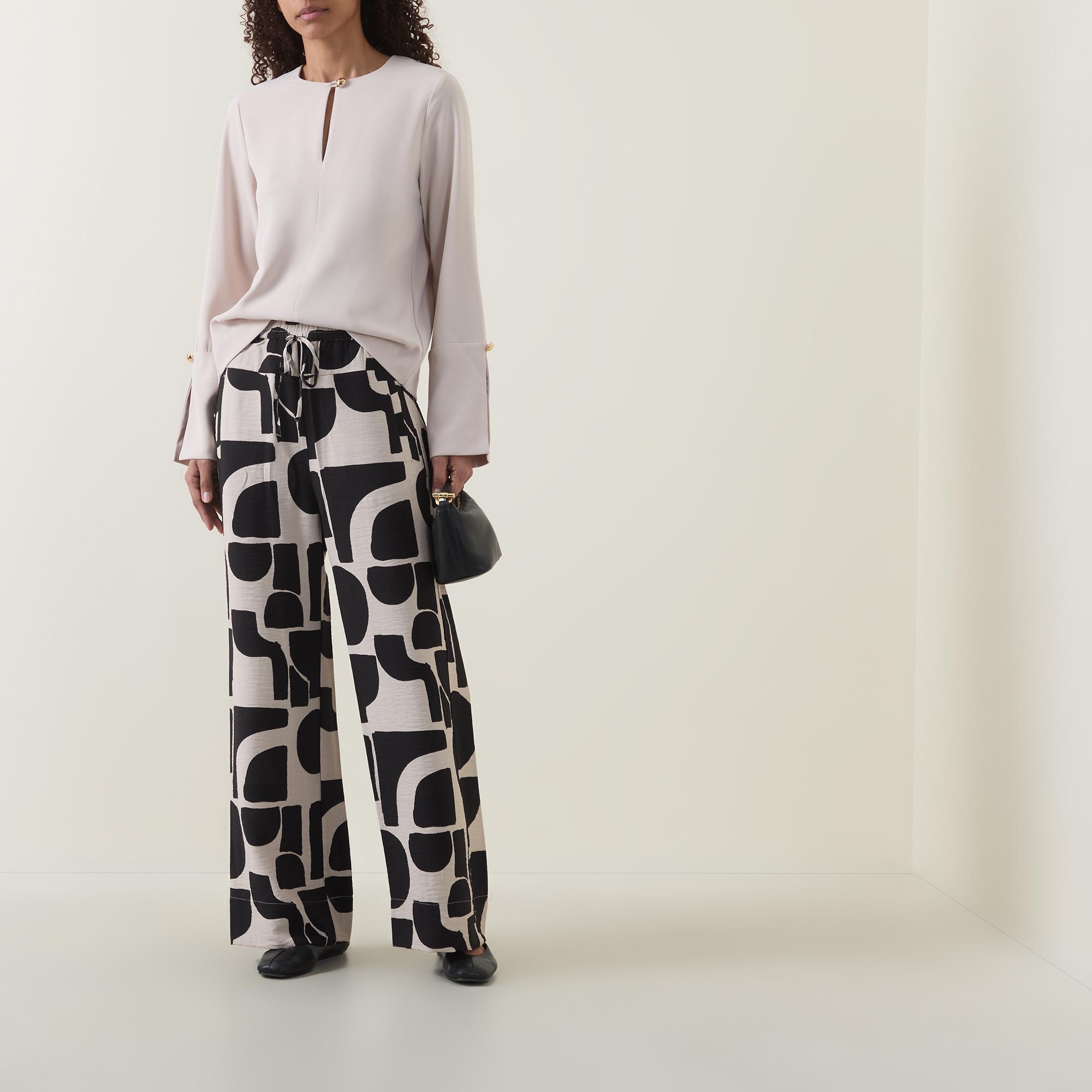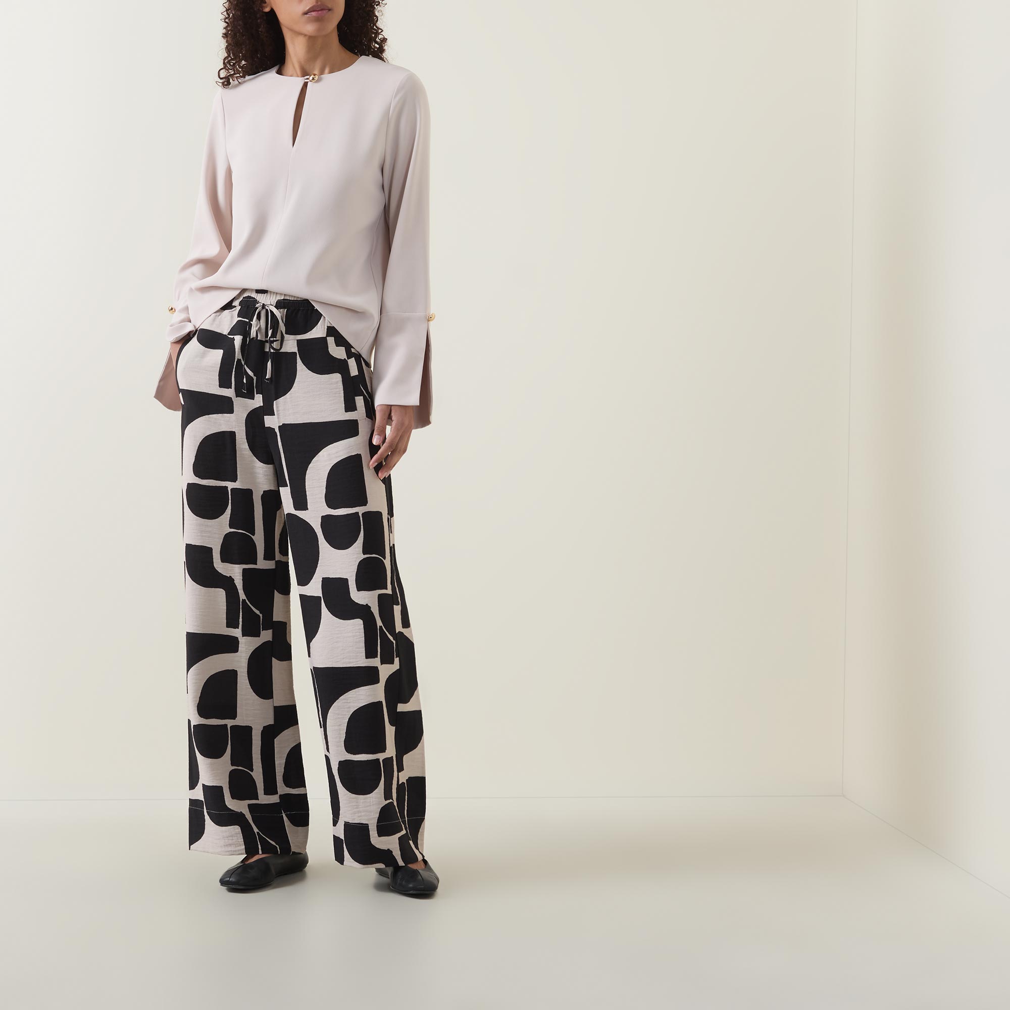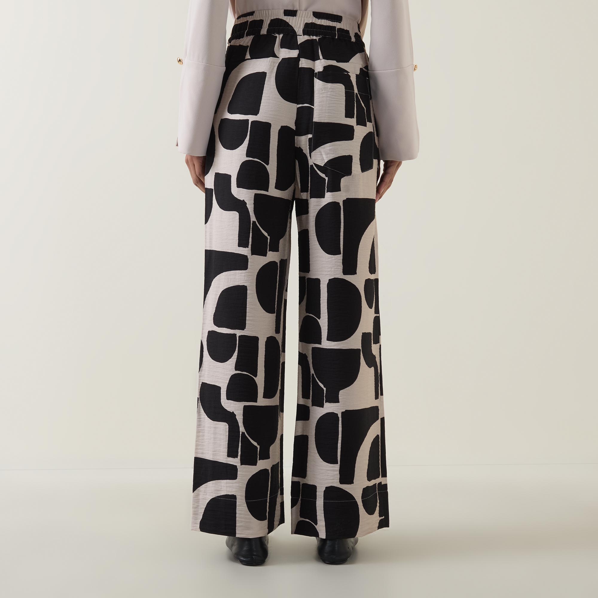 • High-rise, wide-leg, full length, elasticated waistband, adjustable drawstring fastening, two side entry pockets, one rear patch pocket, clean hems, two-tone pattern, lightweight