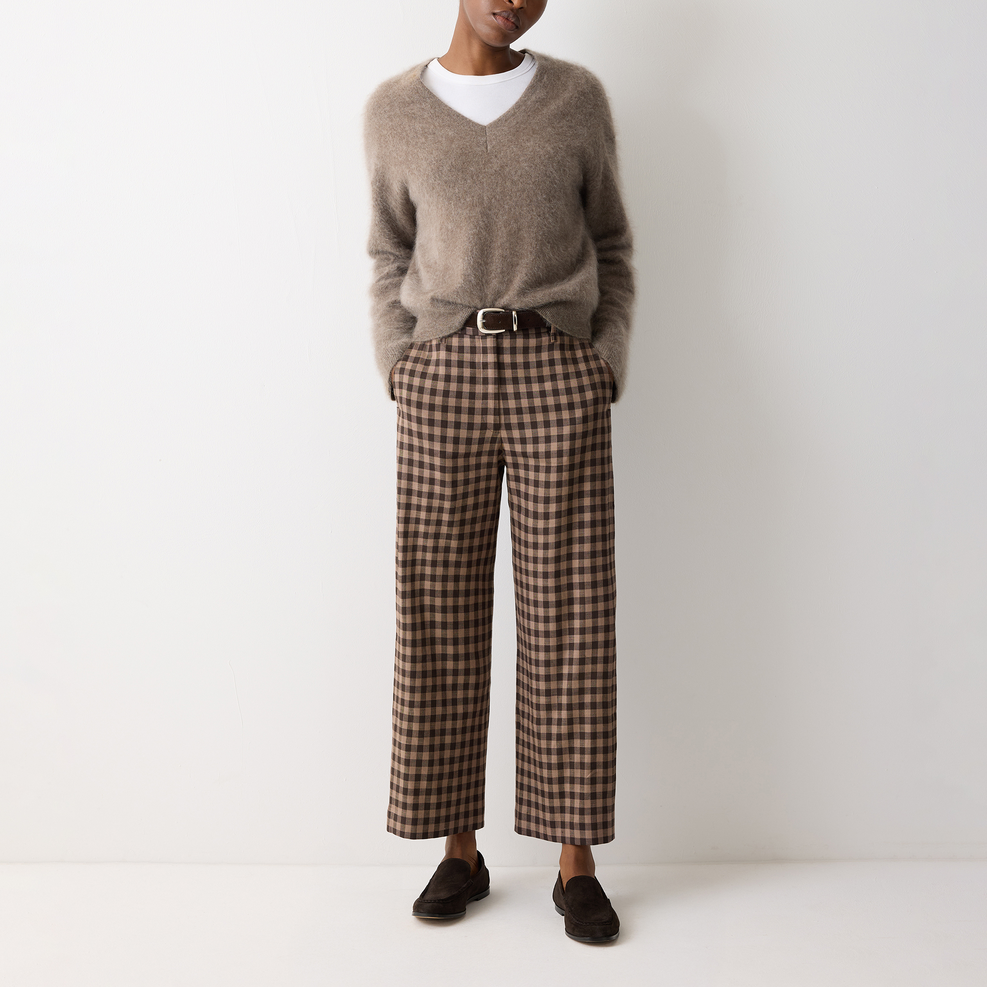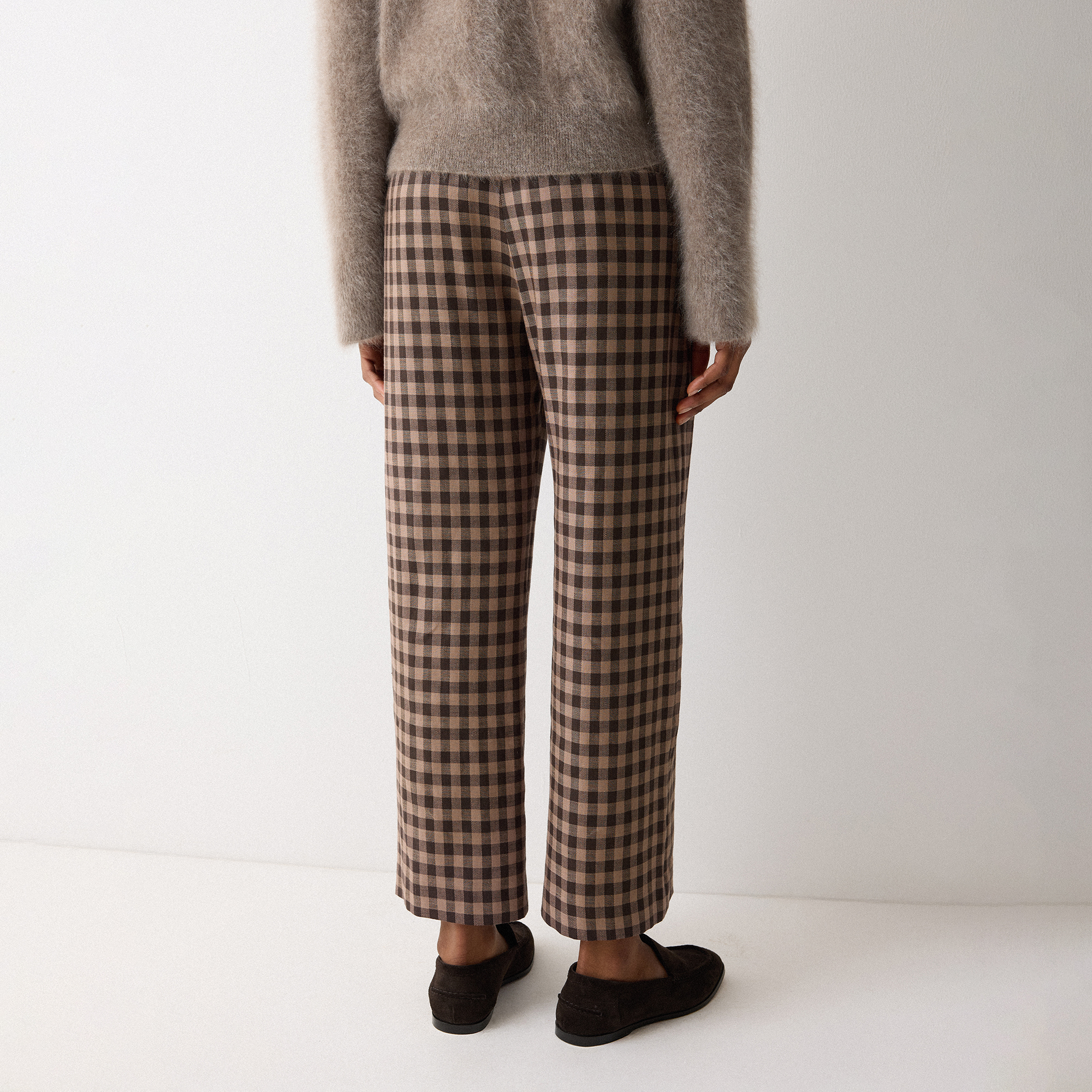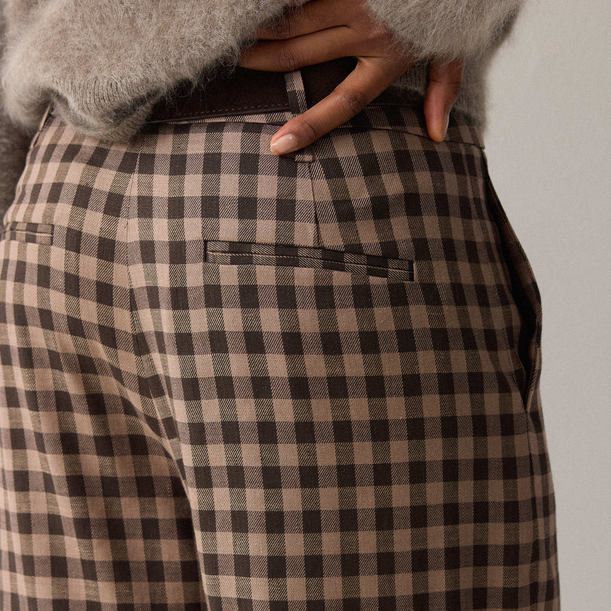 - Straight leg, cropped leg, belt loops, hook and bar fastening, classic check pattern