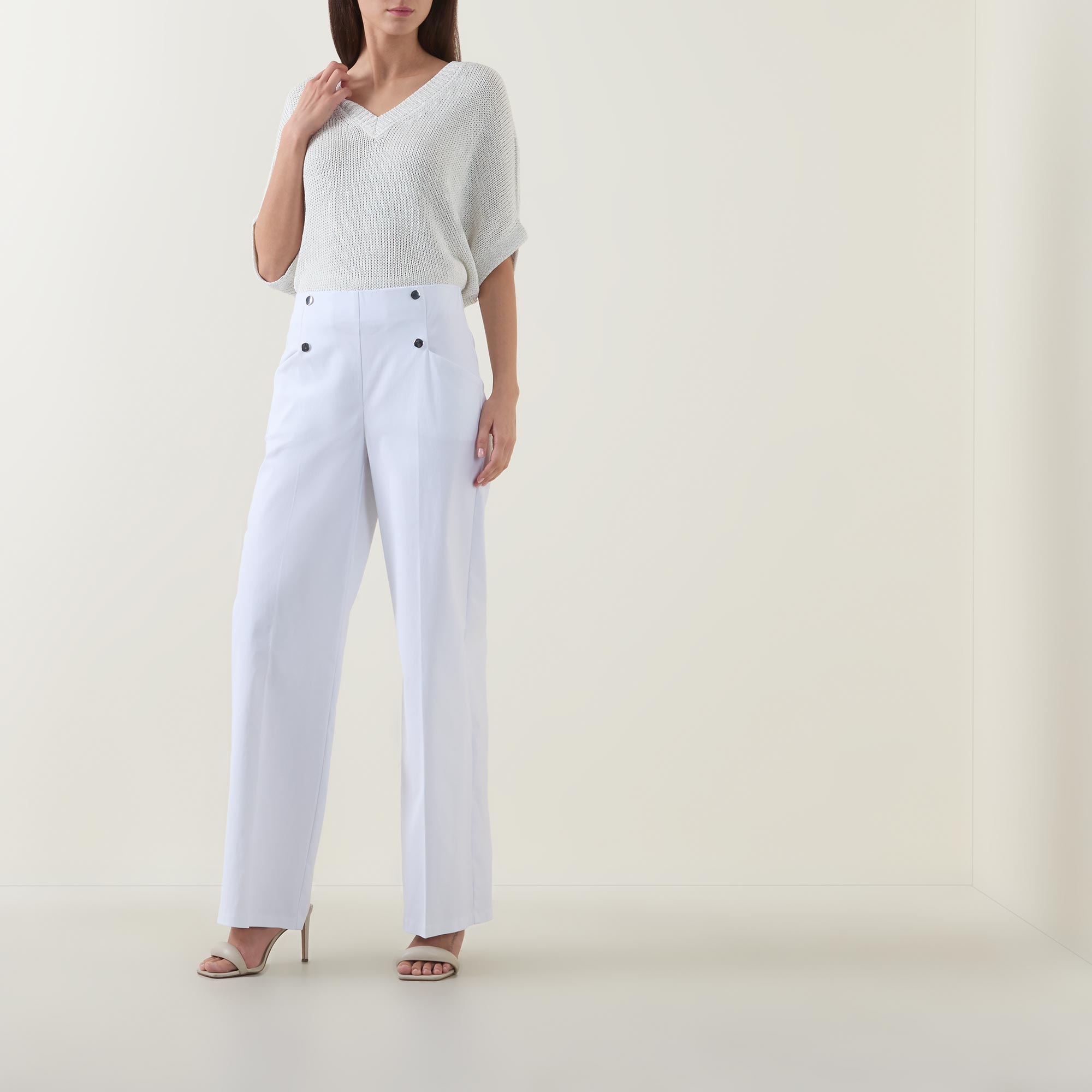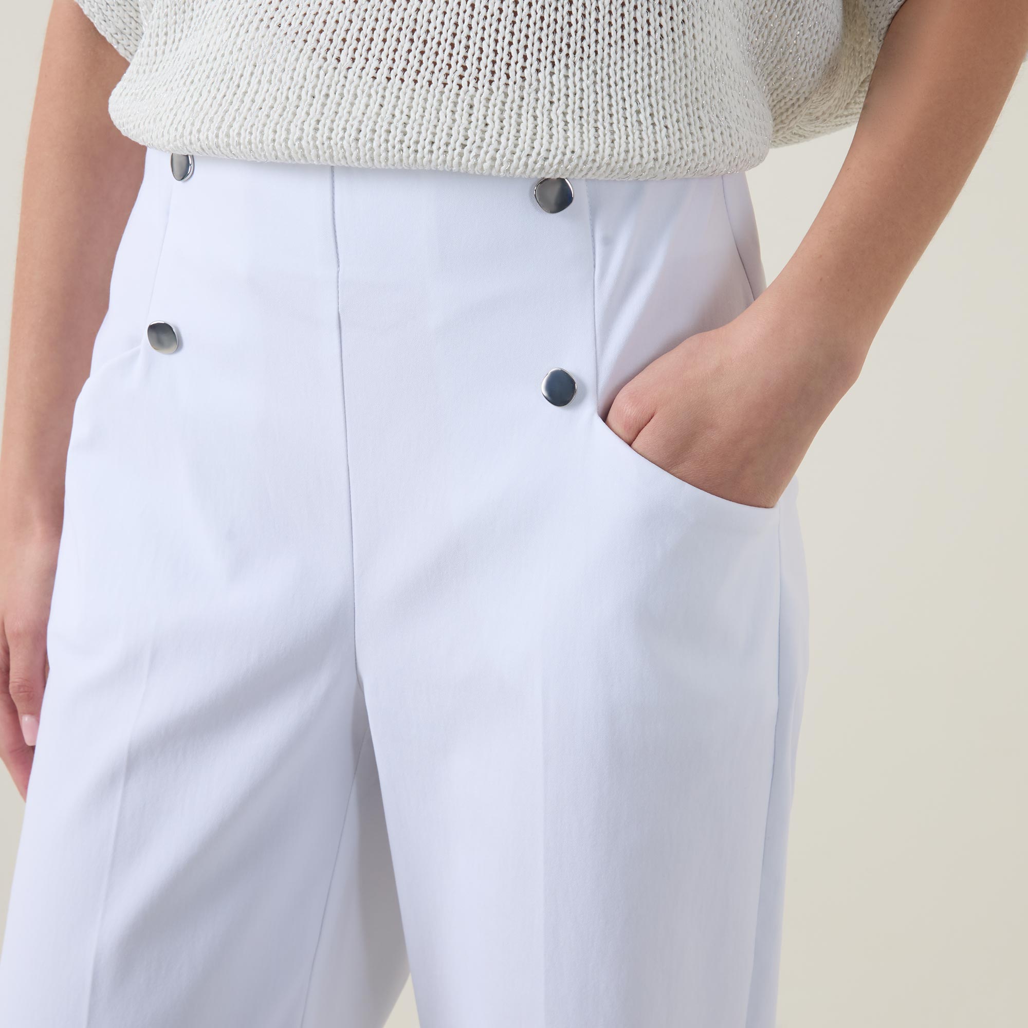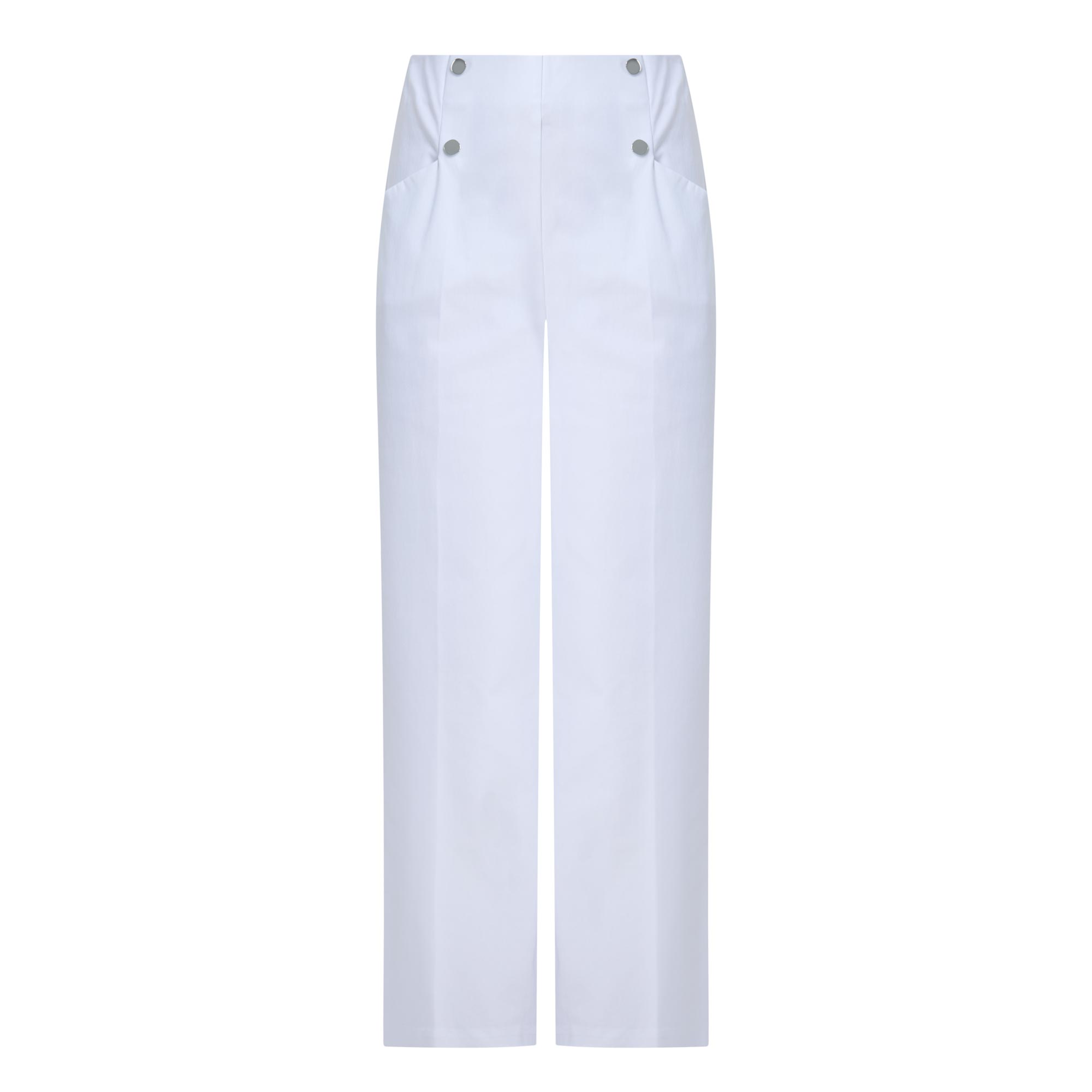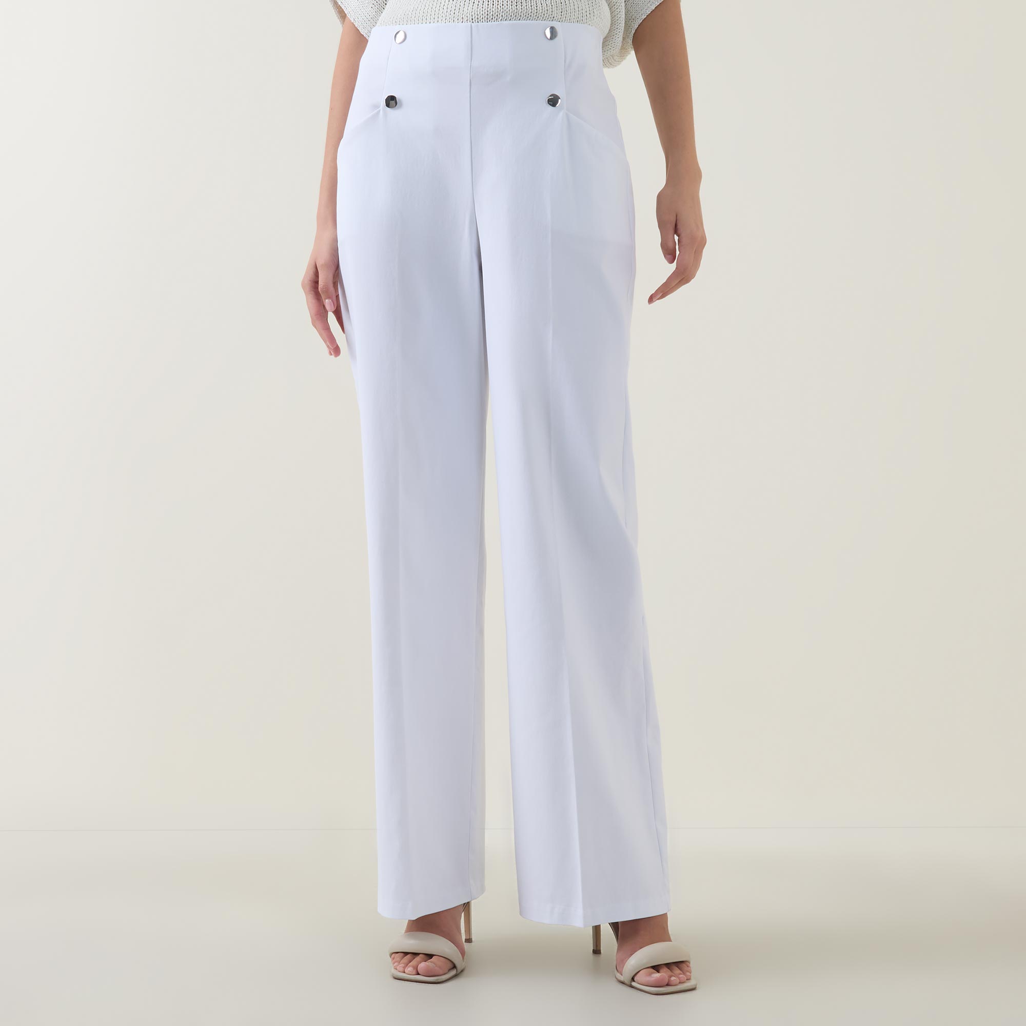 - Mid-rise, straight-leg, full-length, flat front, silver-tone mock button detailing, clean hems, pressed creases