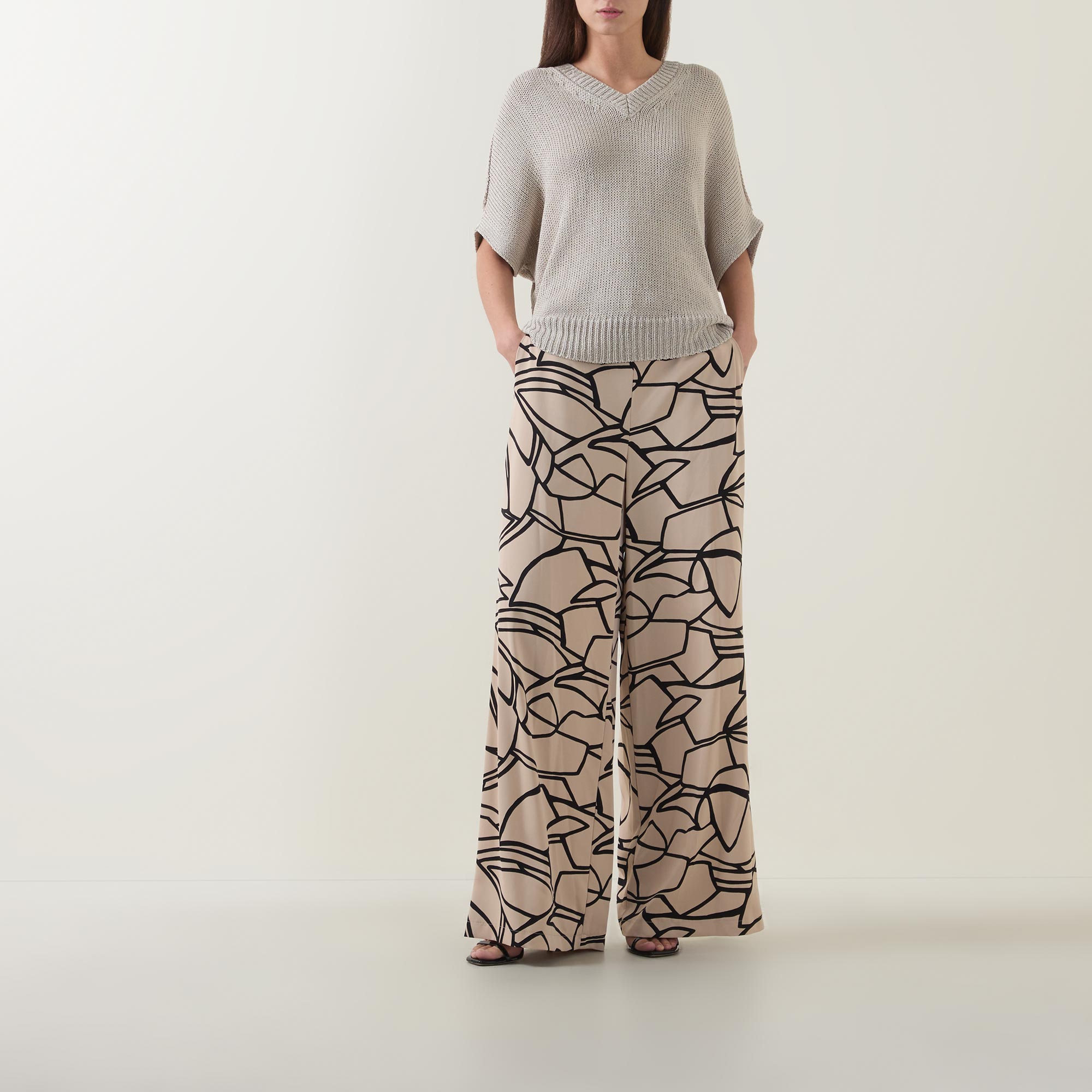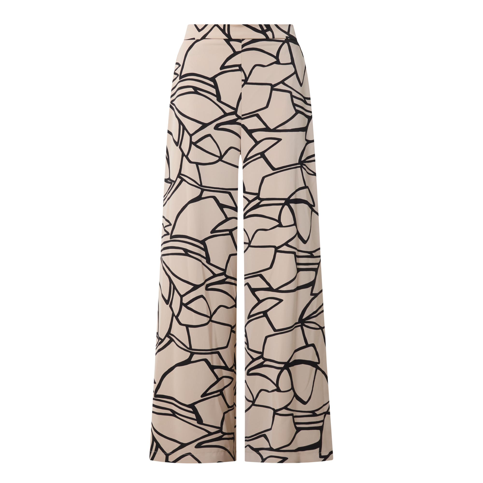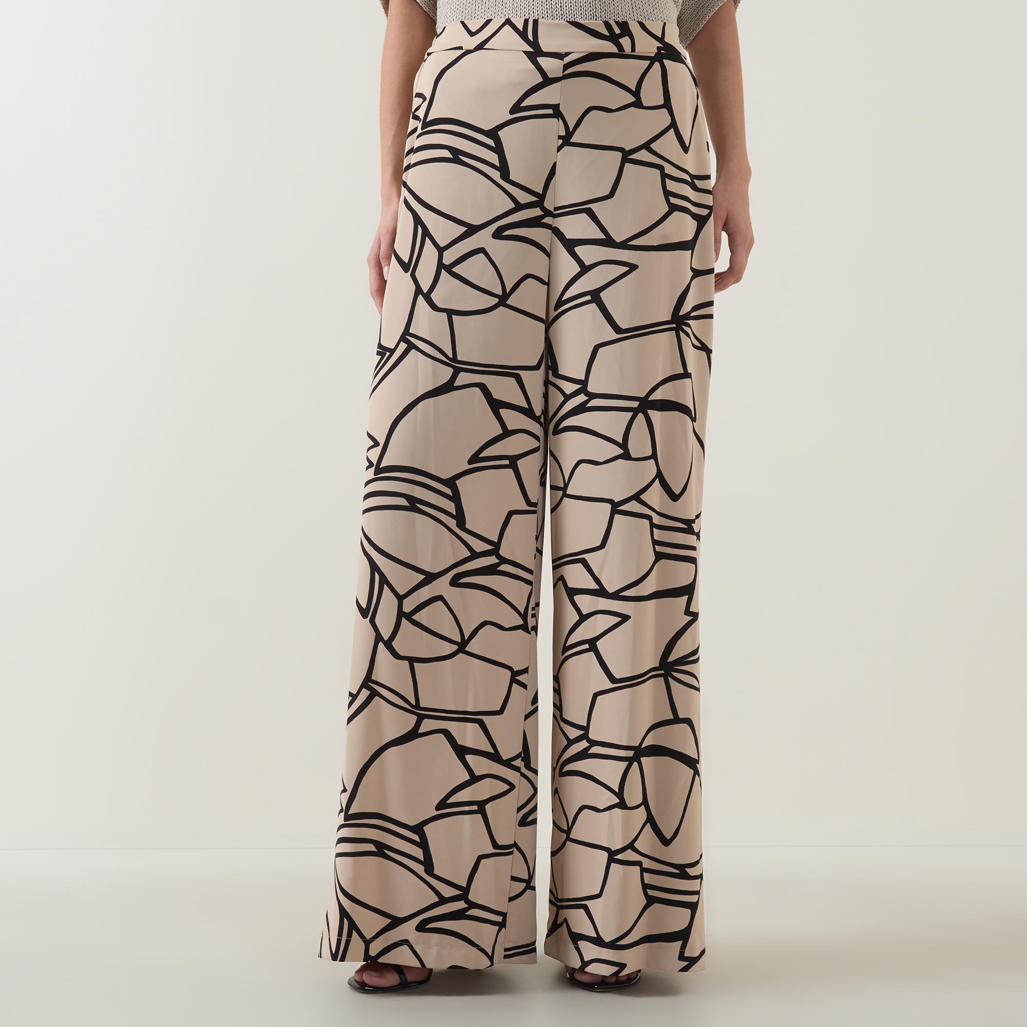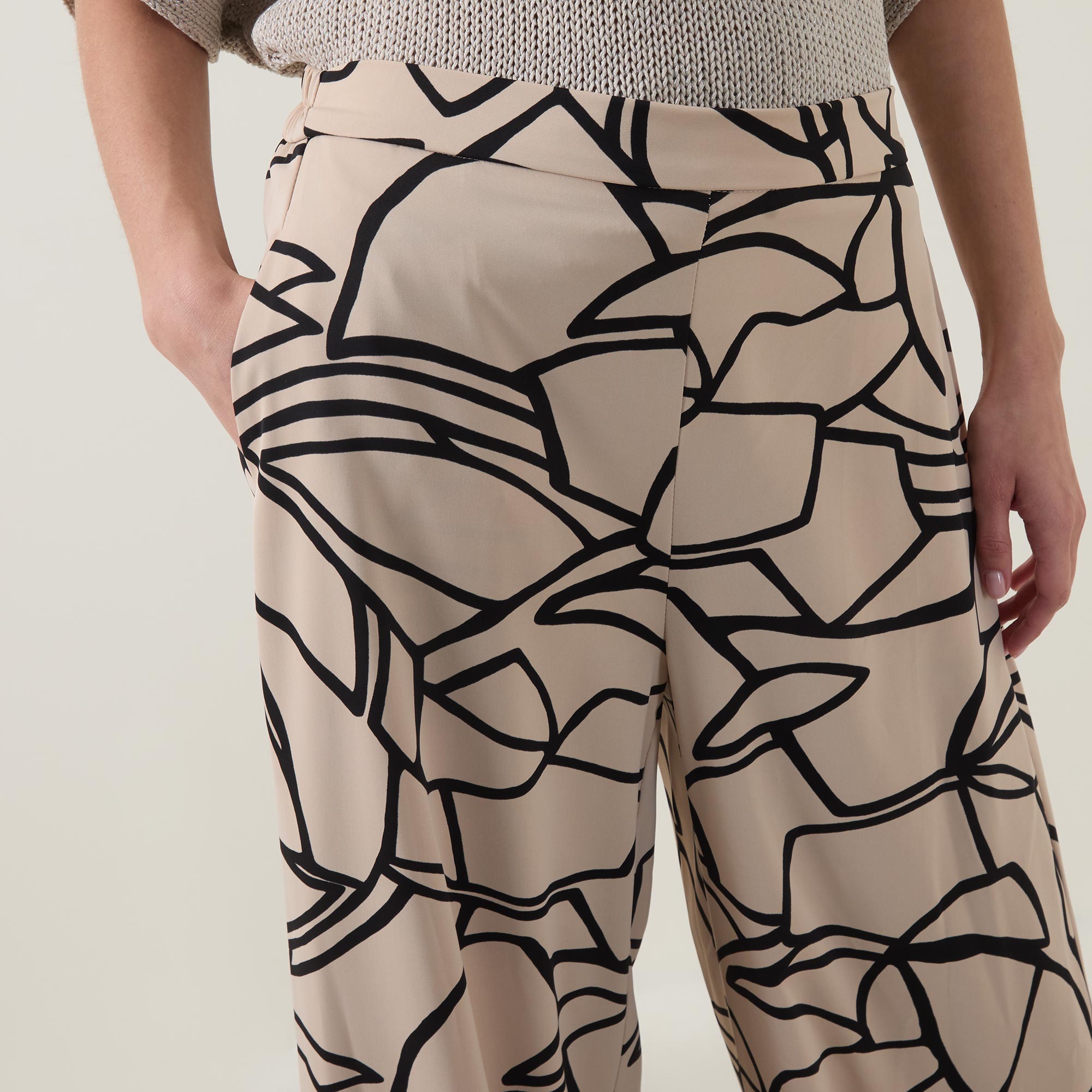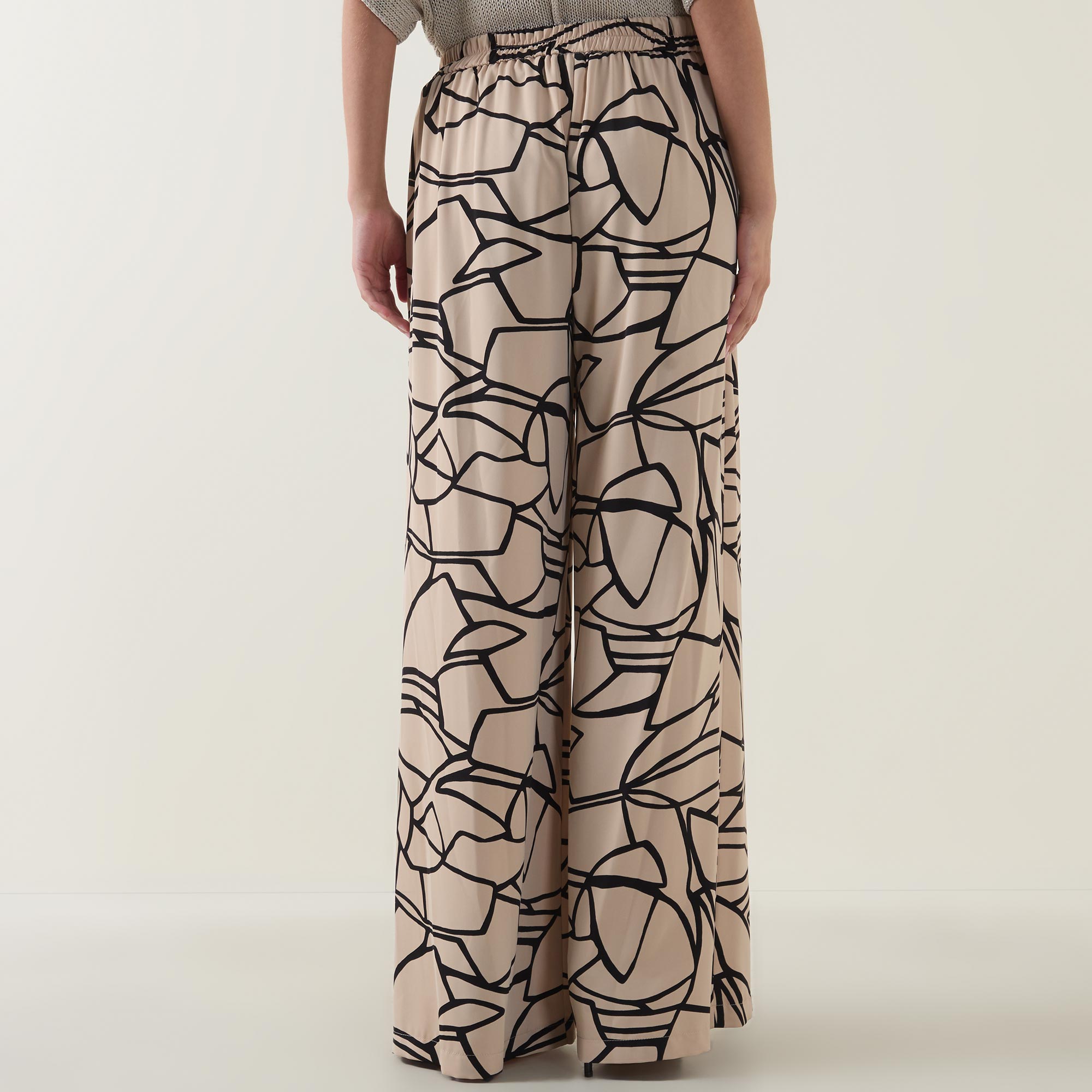 - Mid-rise, wide-leg, full-length, covered elasticated waistband, two side entry pockets, clean hems, printed design, smooth finish