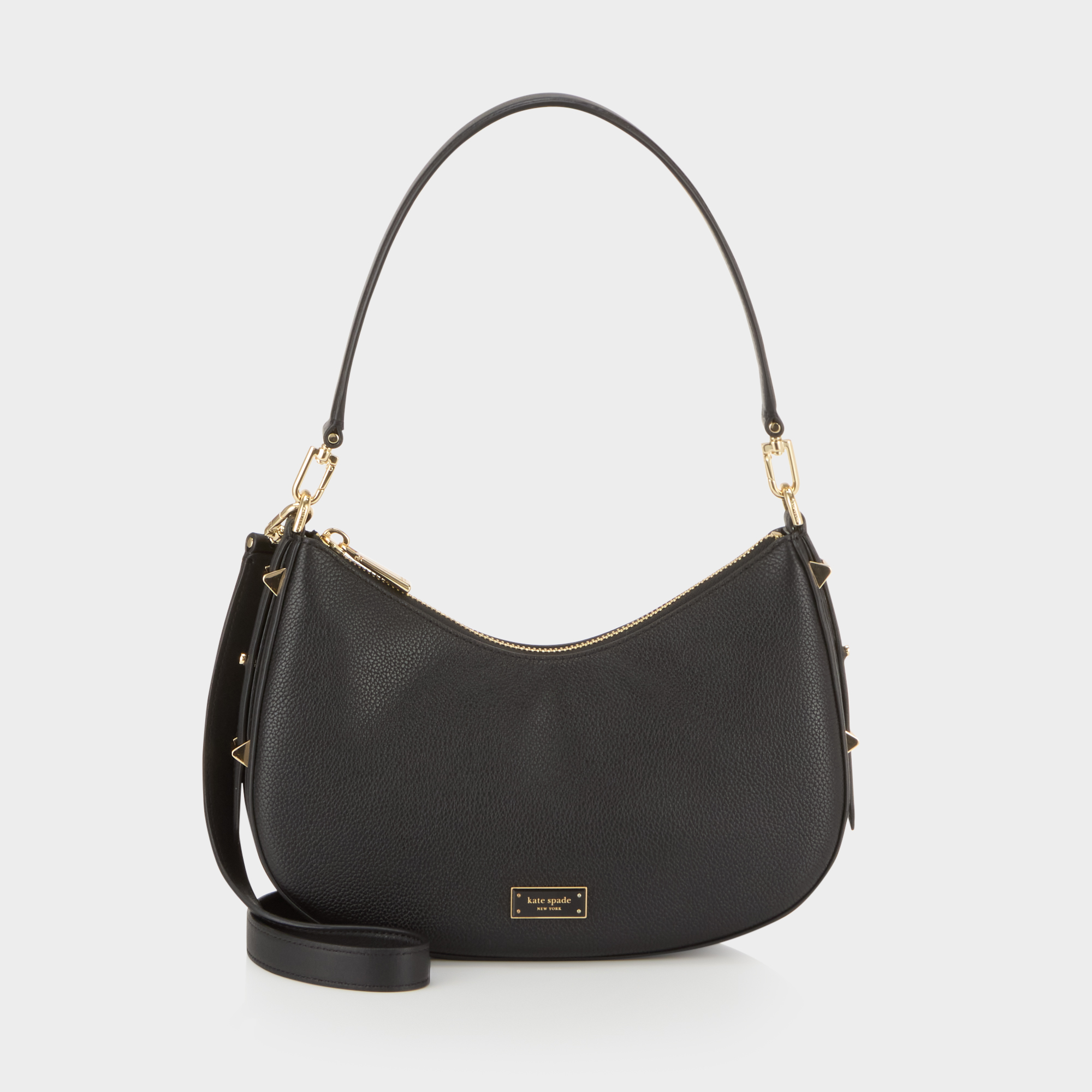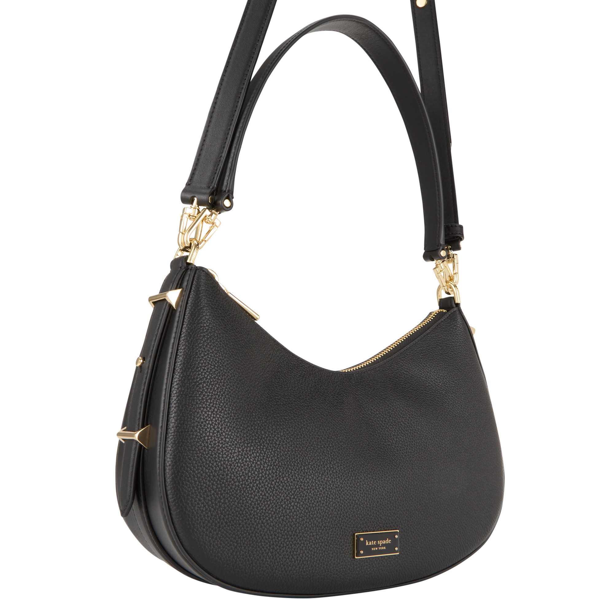 • Top zip fastening, detachable shoulder strap, adjustable and detachable crossbody strap, hobo shape, gold-tone hardware, logo plaque detail, pebbled finish