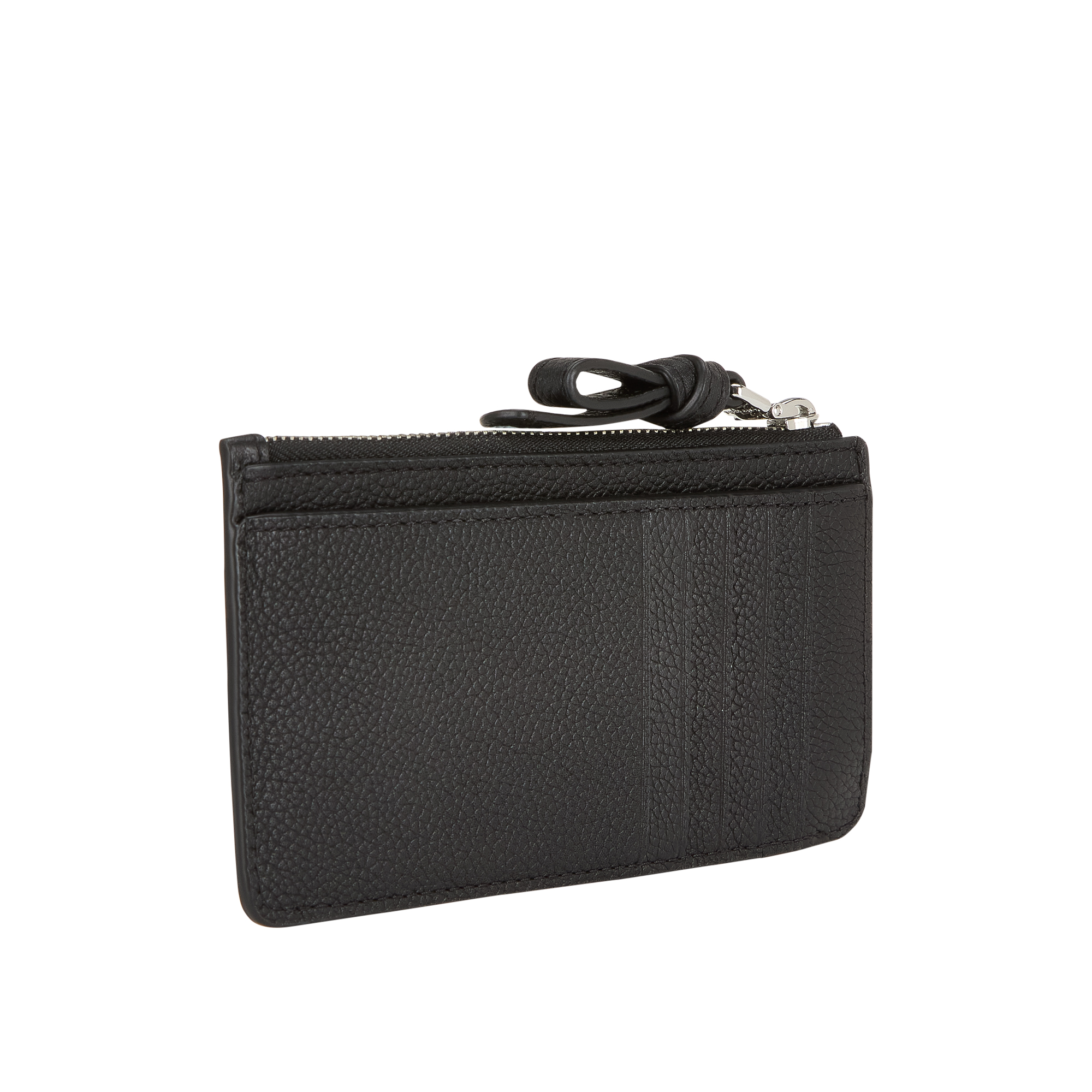 - Top zip closure with knot zip pull, grained finish, silver-tone hardware, foil lettering to the front, card slots