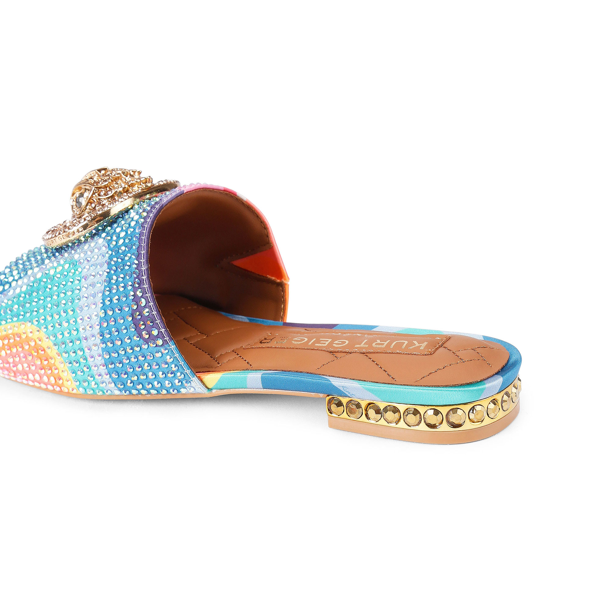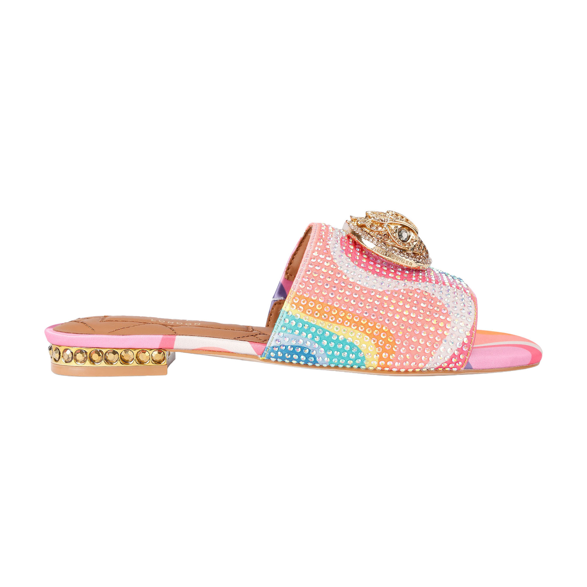 - Flat sandal design, satin upper, iridescent crystal embellishment, oval trim with Eagle Head detail, crystal embellished heel