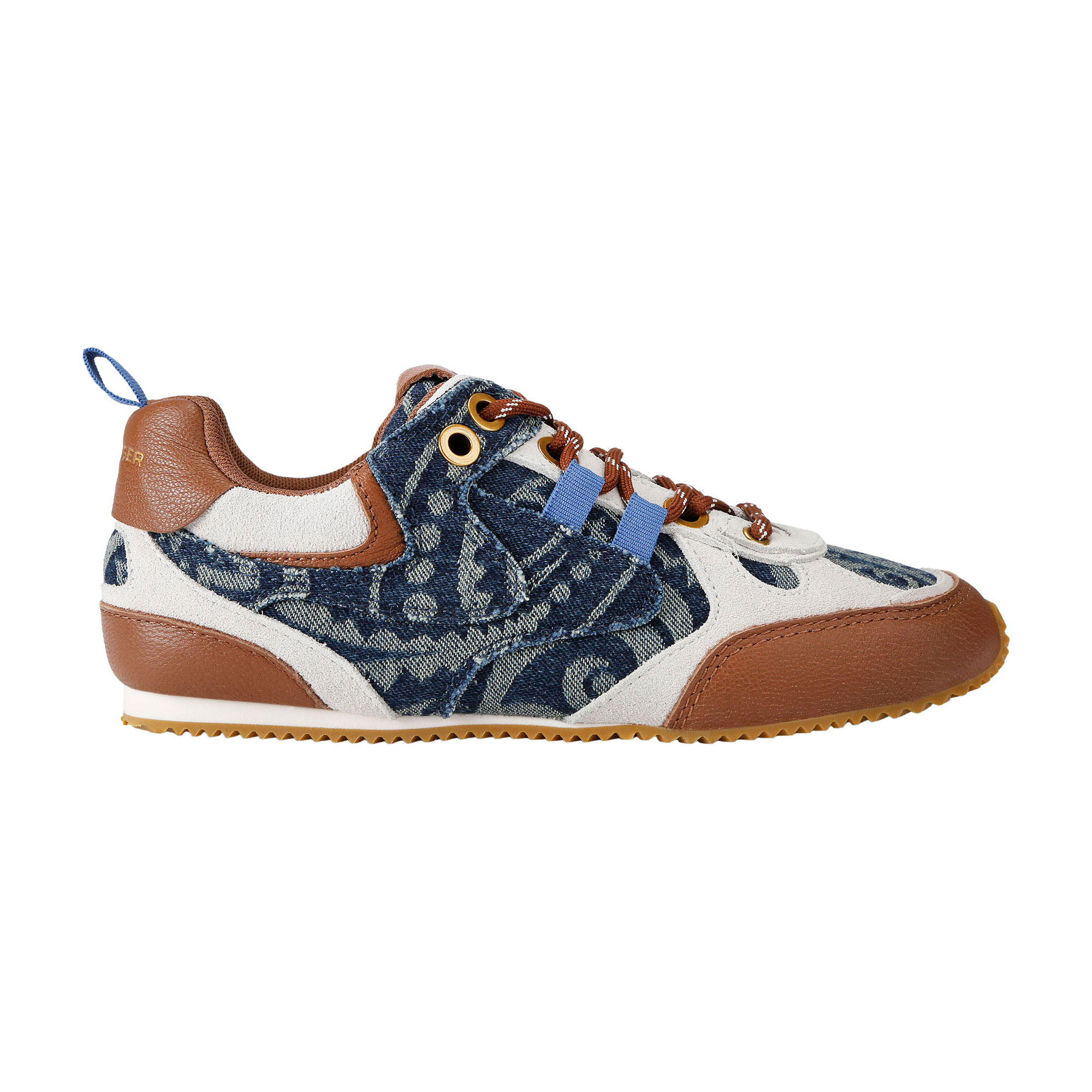 - Denim fabric, paisley print, front laces, antiqued brass eyelet details
