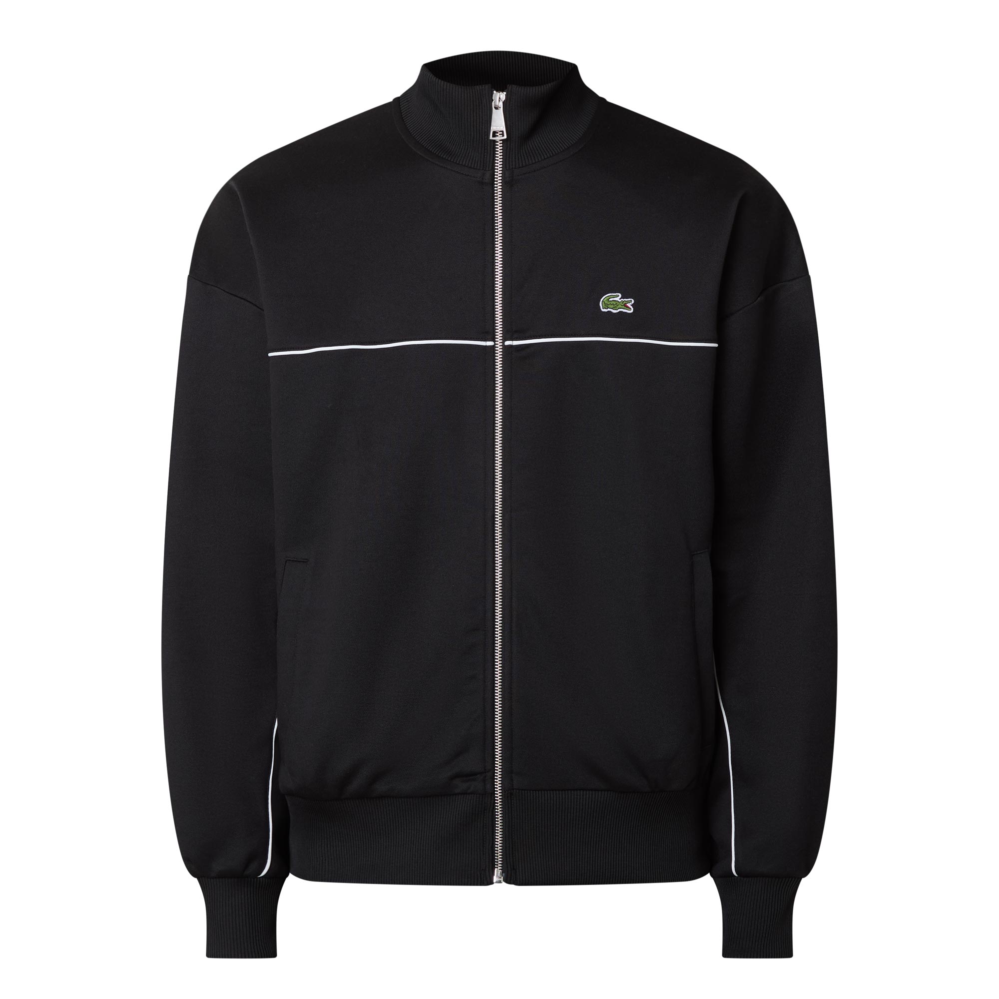 - Contrast trim, funnel neckline, long sleeves, croc logo, zip fastening, ribbed trims, side pockets
