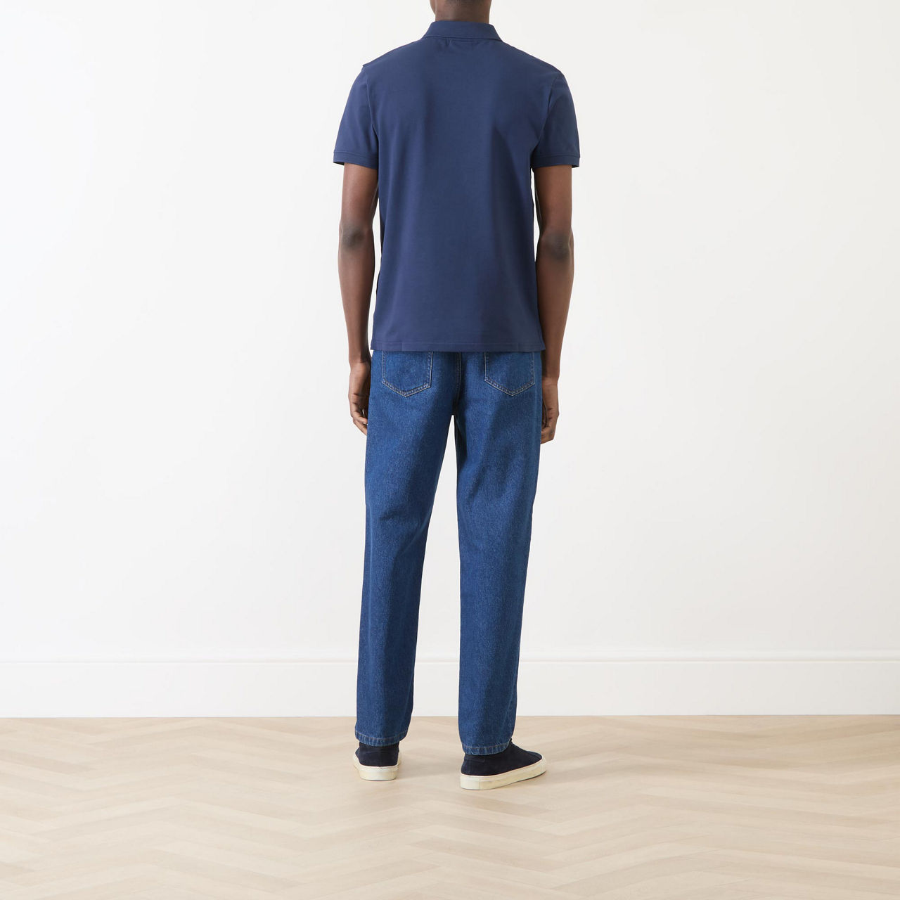 - Polo collar, three-button placket, short sleeves, ribbed cuffs, logo embroidery, tonal stitching, straight hemline, smooth fabric