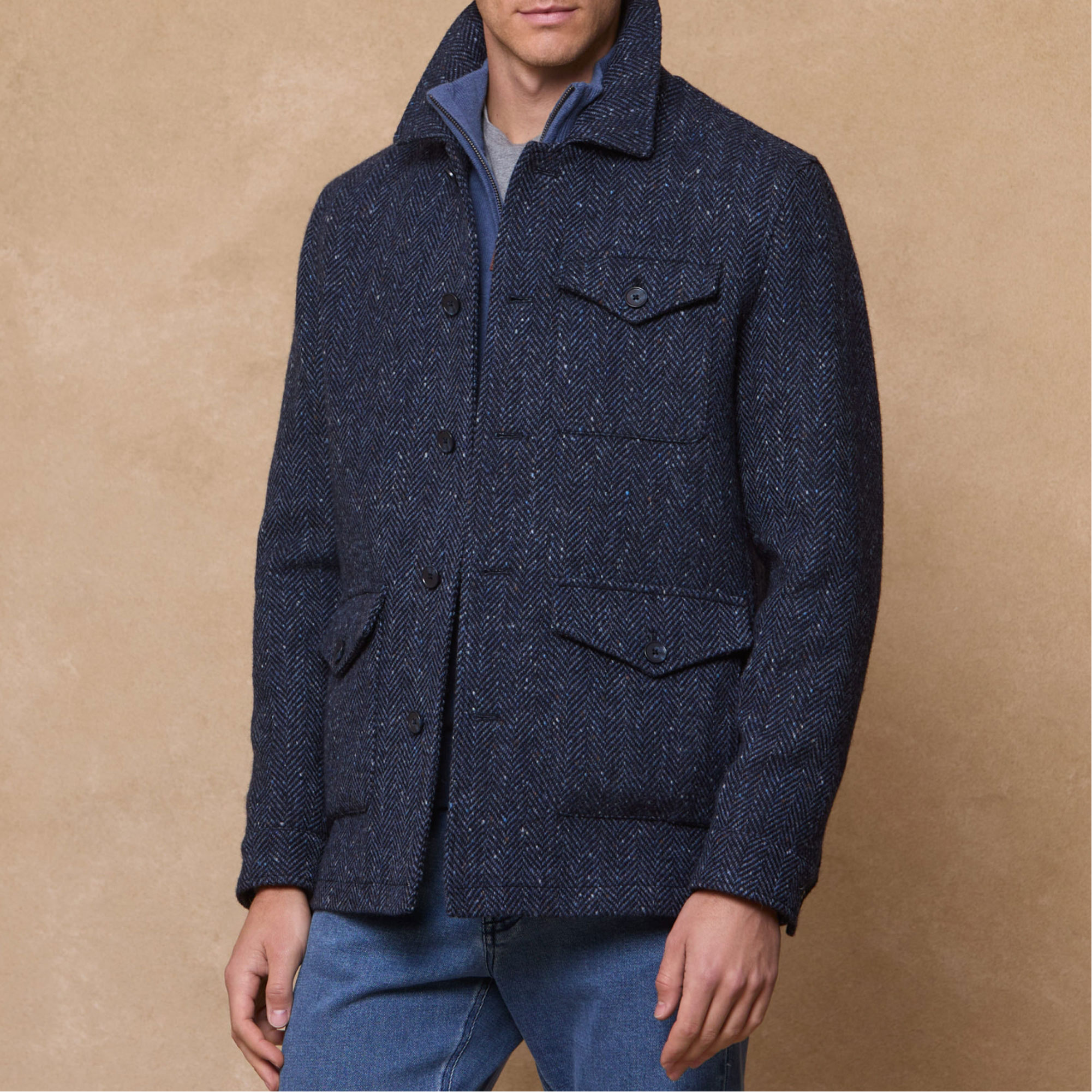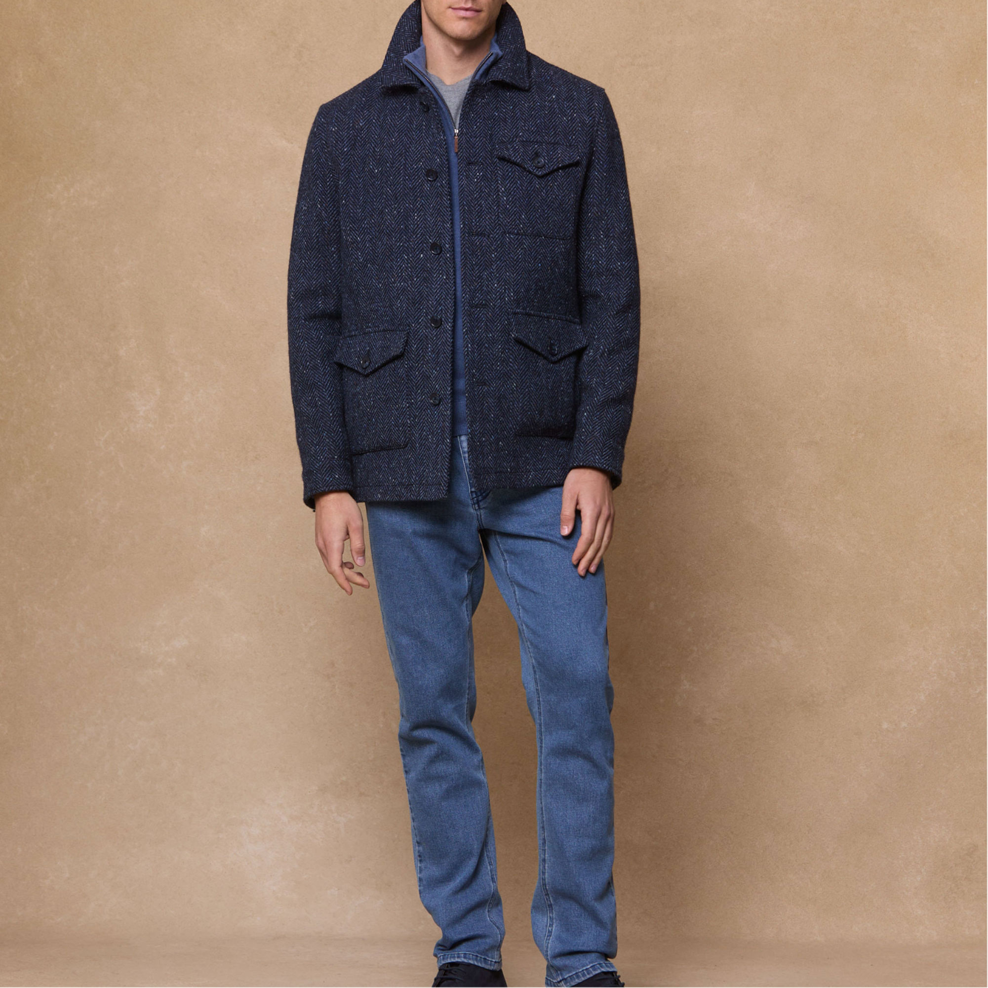 The Ballysadare Shirt Jacket is a casual yet contemporary piece, crafted from authentic Donegal Tweed on a herringbone base flecked with sky blue and chocolate brown. Designed to bridge the gap between shirt and jacket, it offers a relaxed silhouette with the warmth and texture of traditional tweed. Subtle tailoring and clean detailing give this versatile layer a modern edge, making it ideal for easy layering through the seasons. Rooted in Irish heritage, the Ballysadare reflects Magee 1866’s commitment to timeless craftsmanship with a contemporary feel.