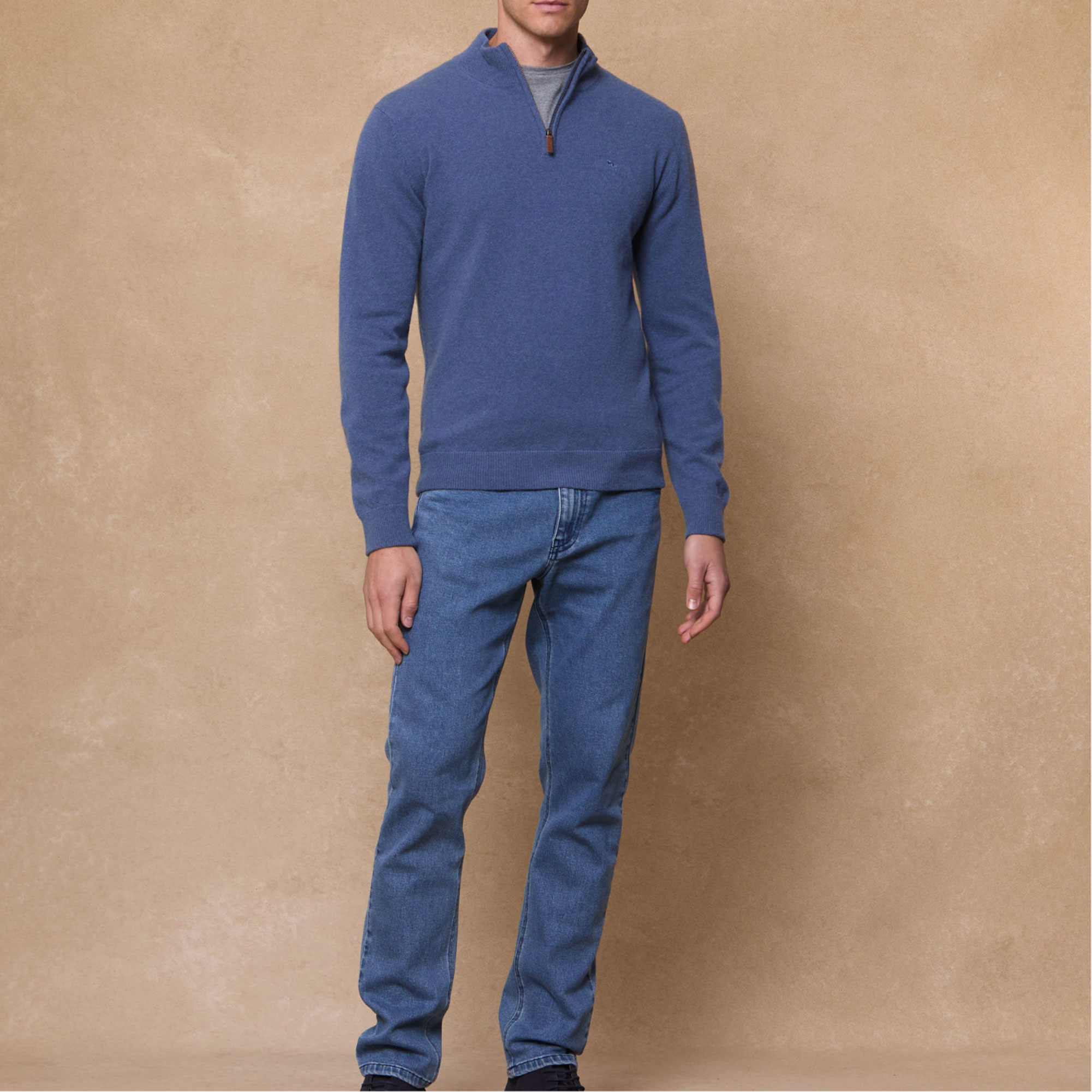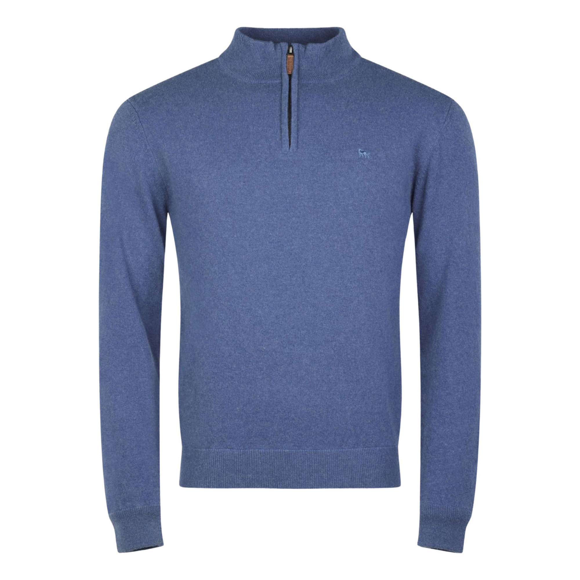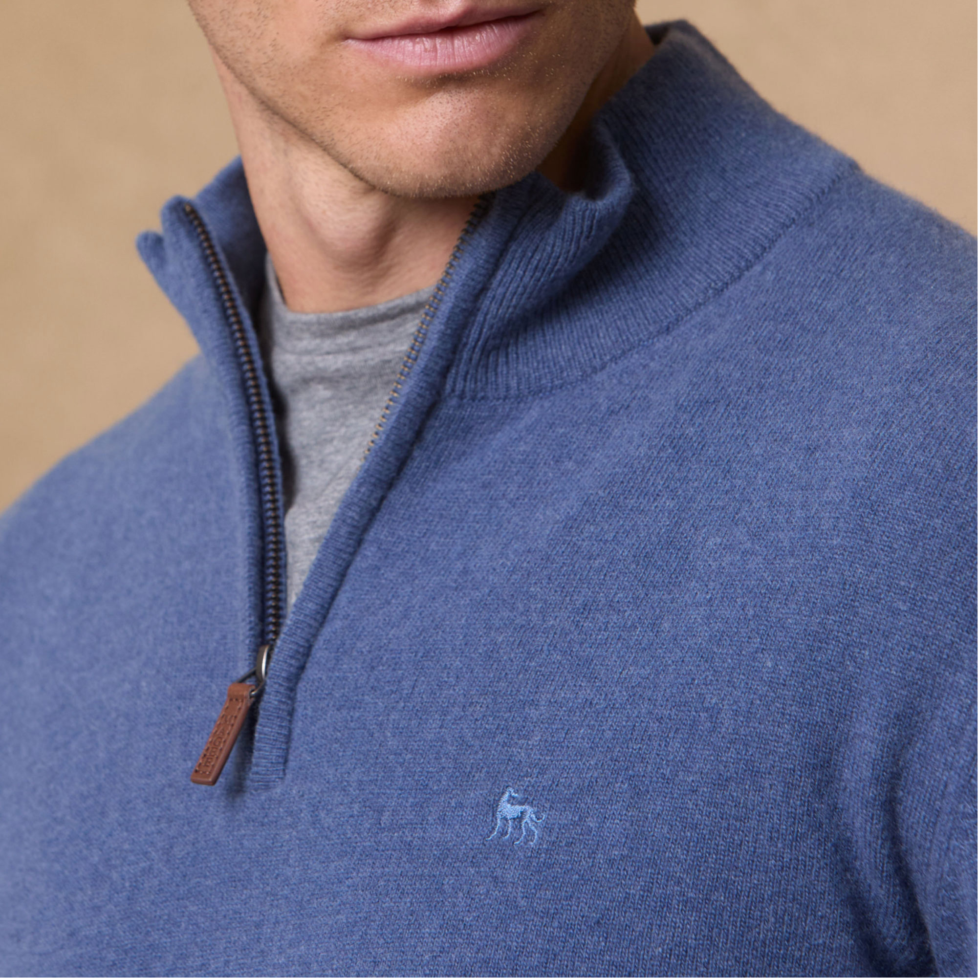 • Quarter-zip fastening, plain knit, leather branded tab, single cuff and hem