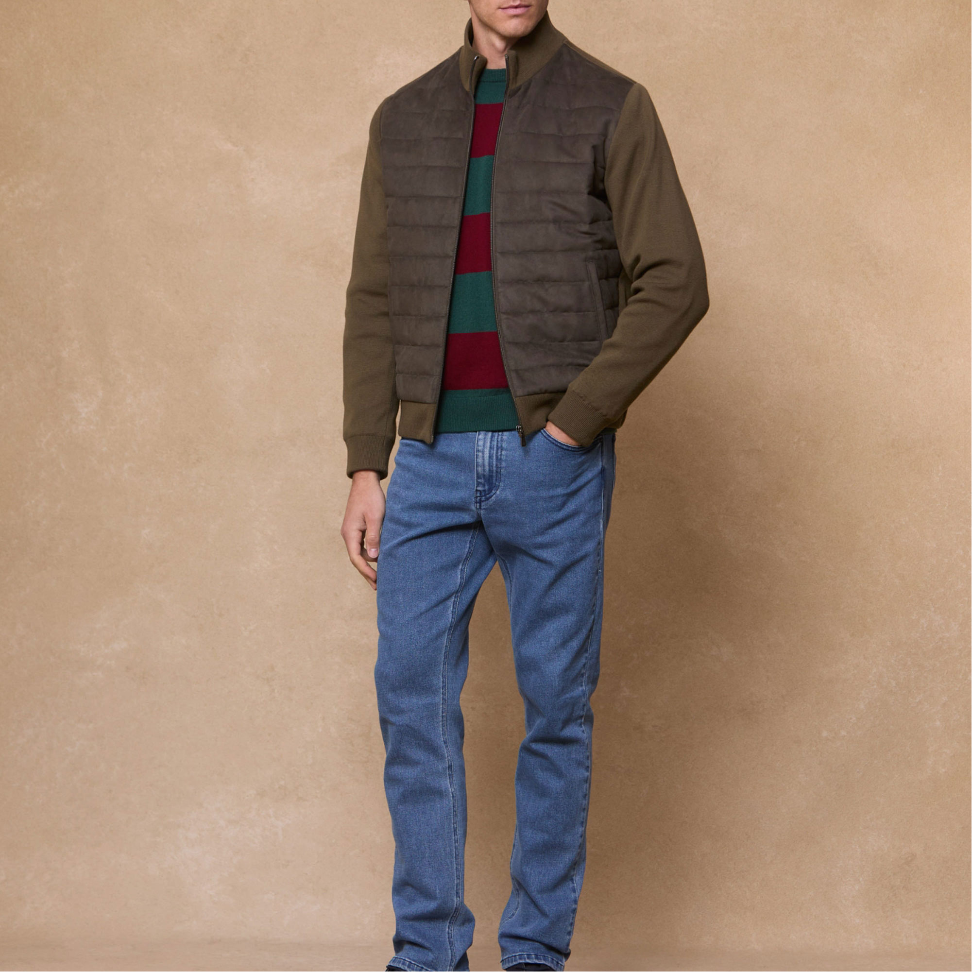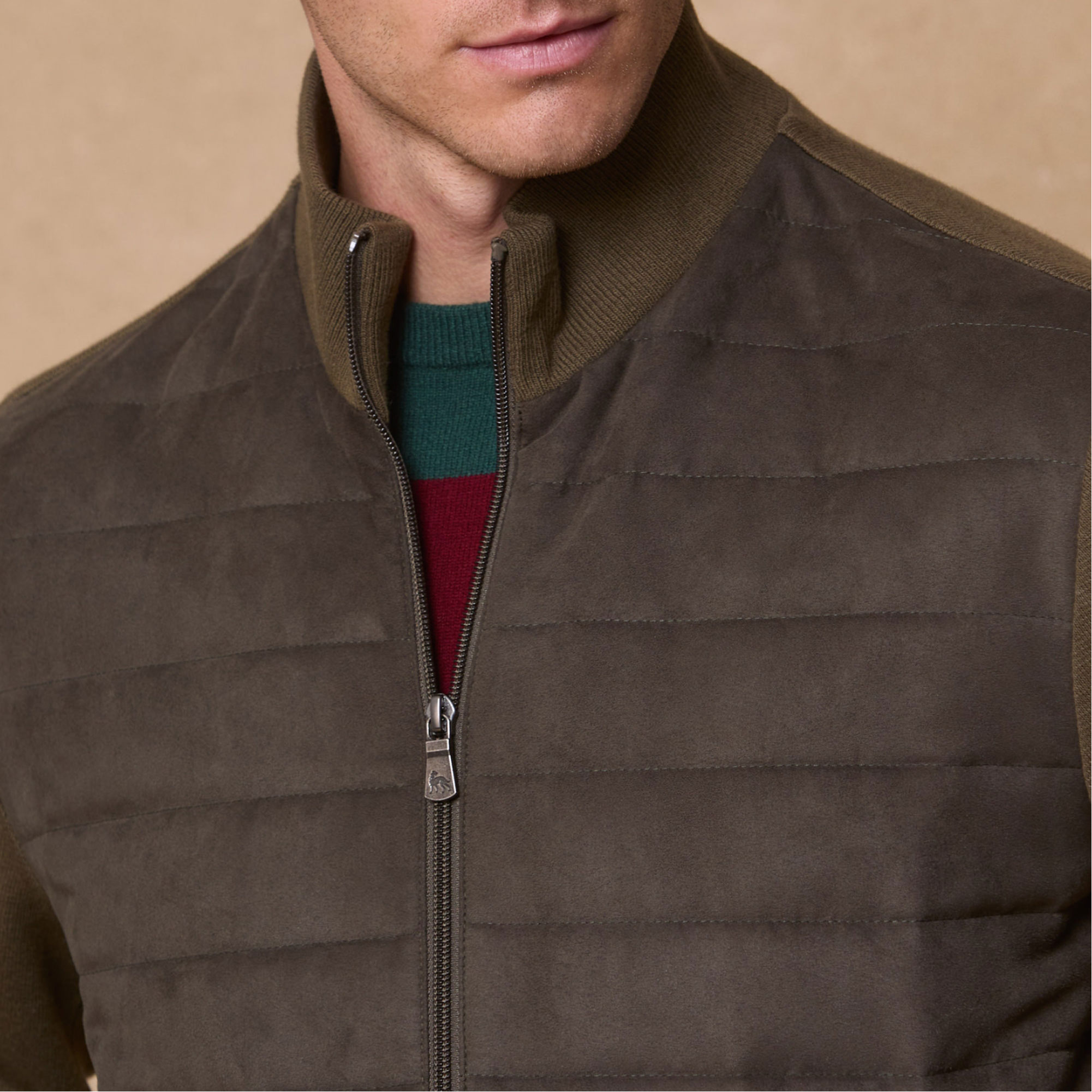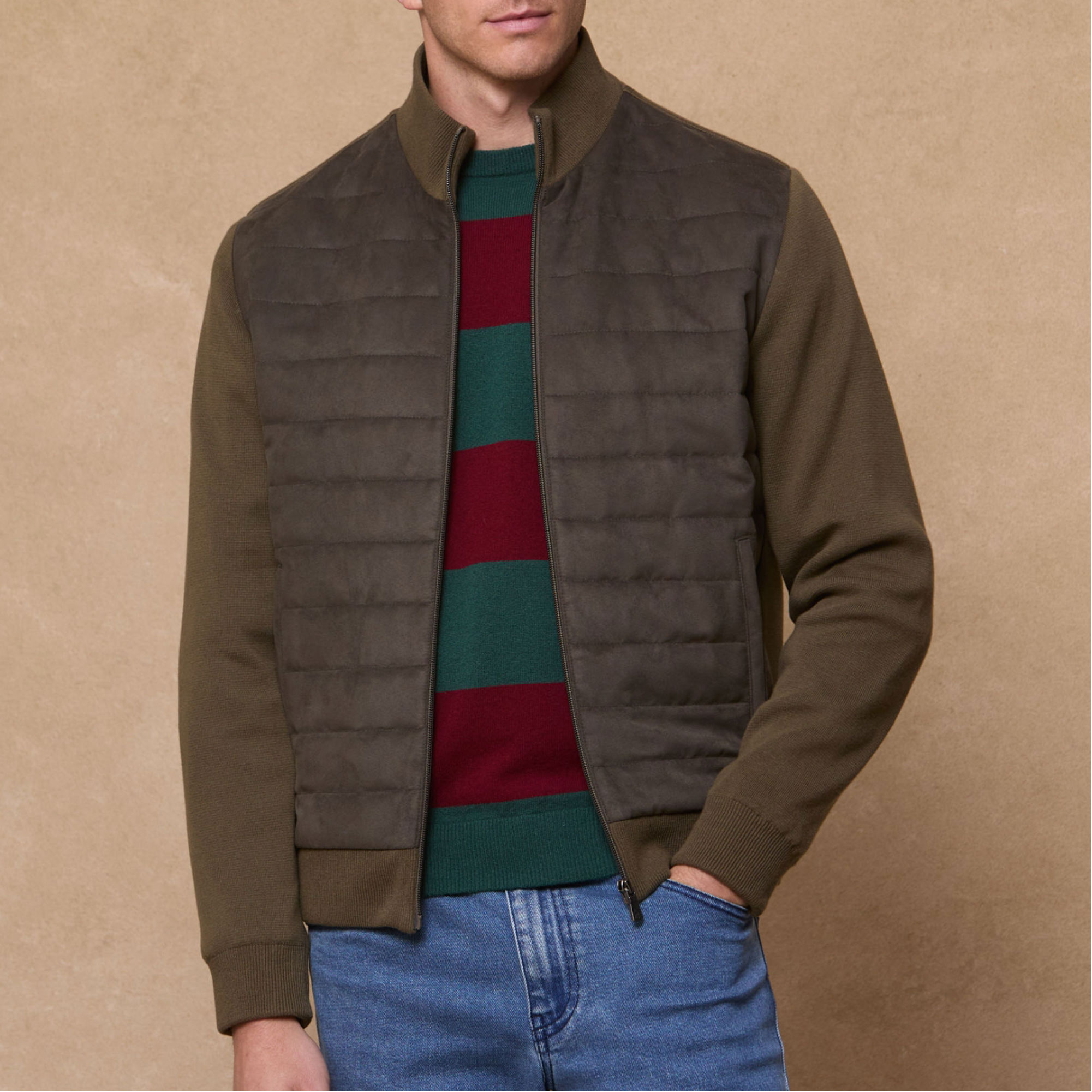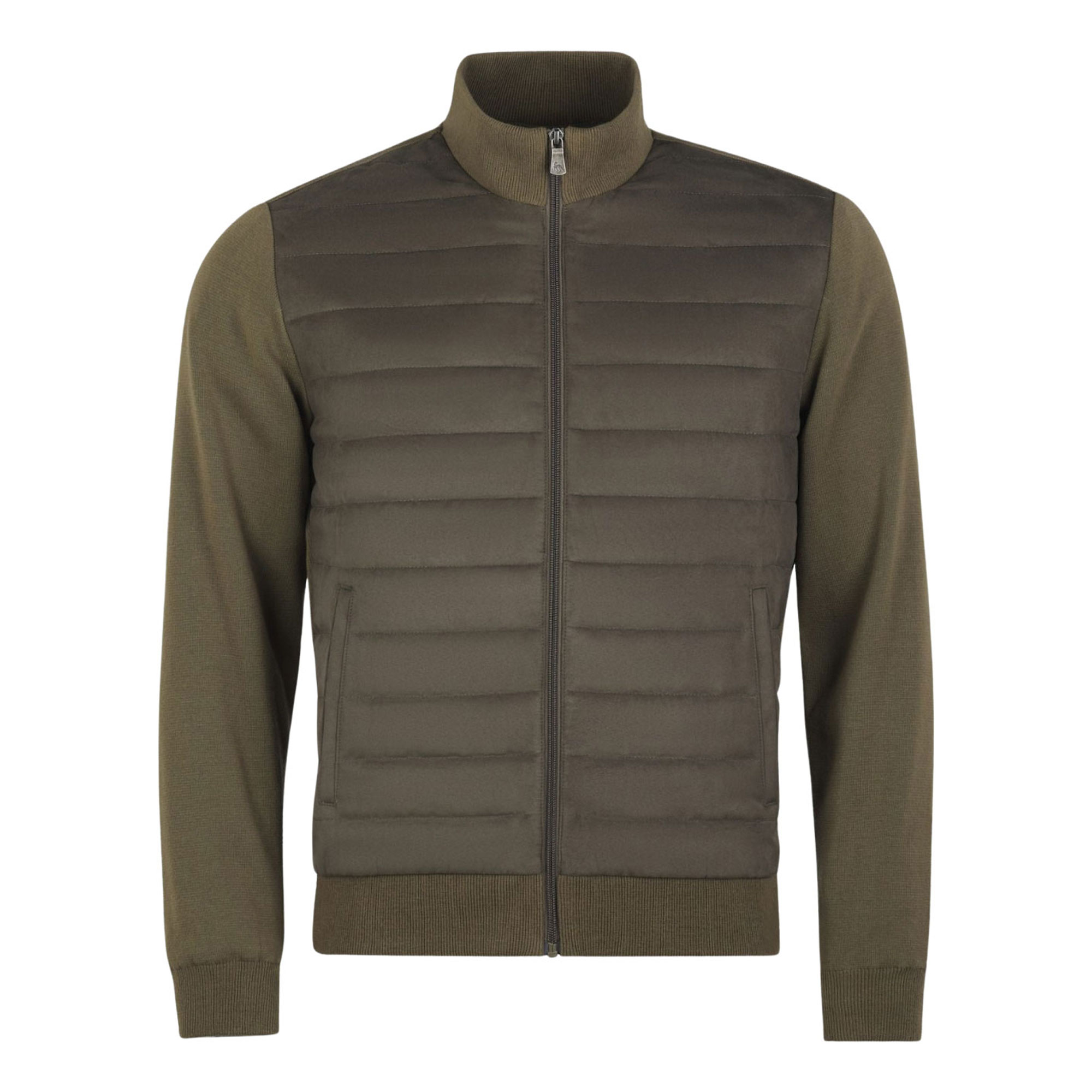 - Short length, quilted style, knit details, nehru Collar, front rib quilting, back and sleeves knit, knit cuff and hem, handwarmer pockets