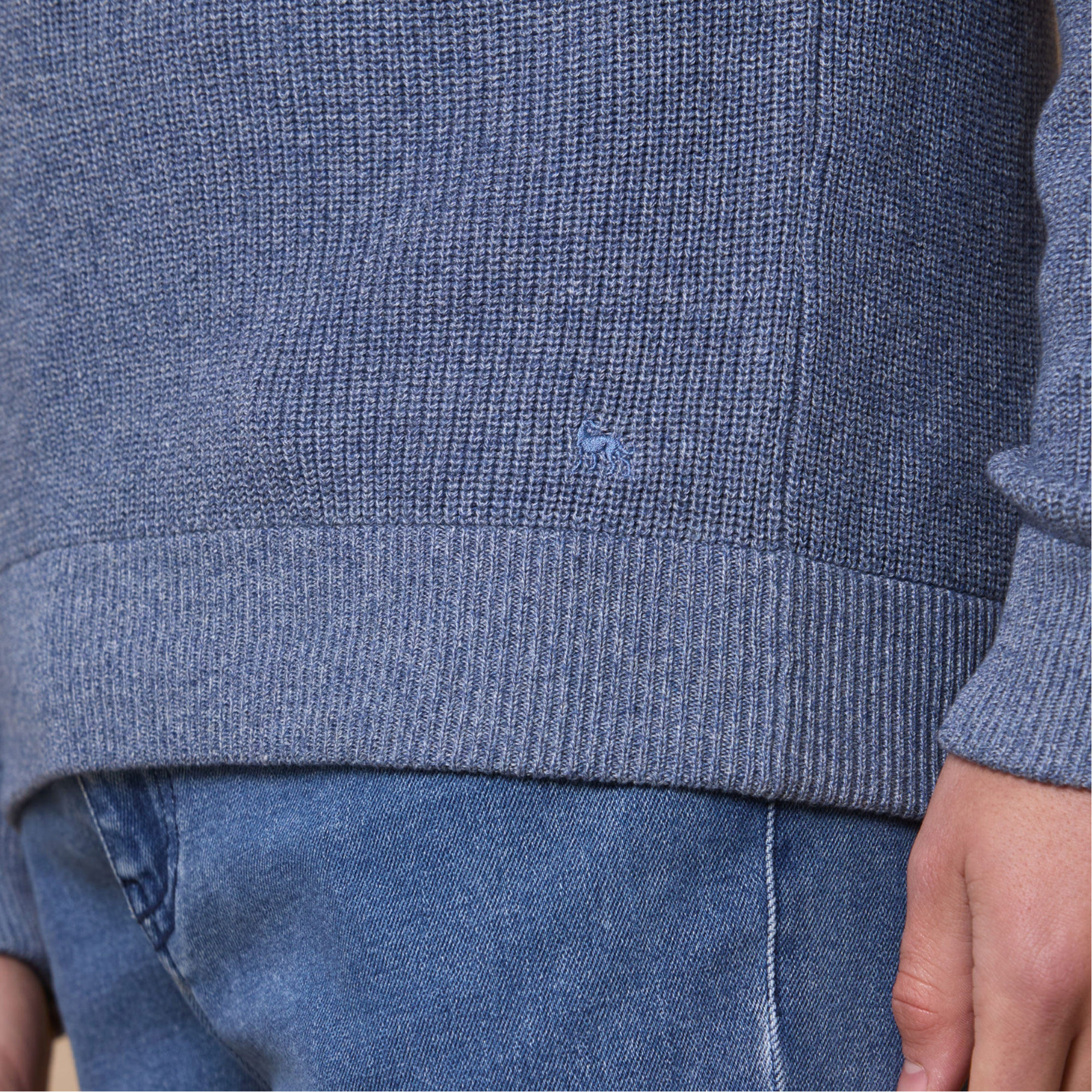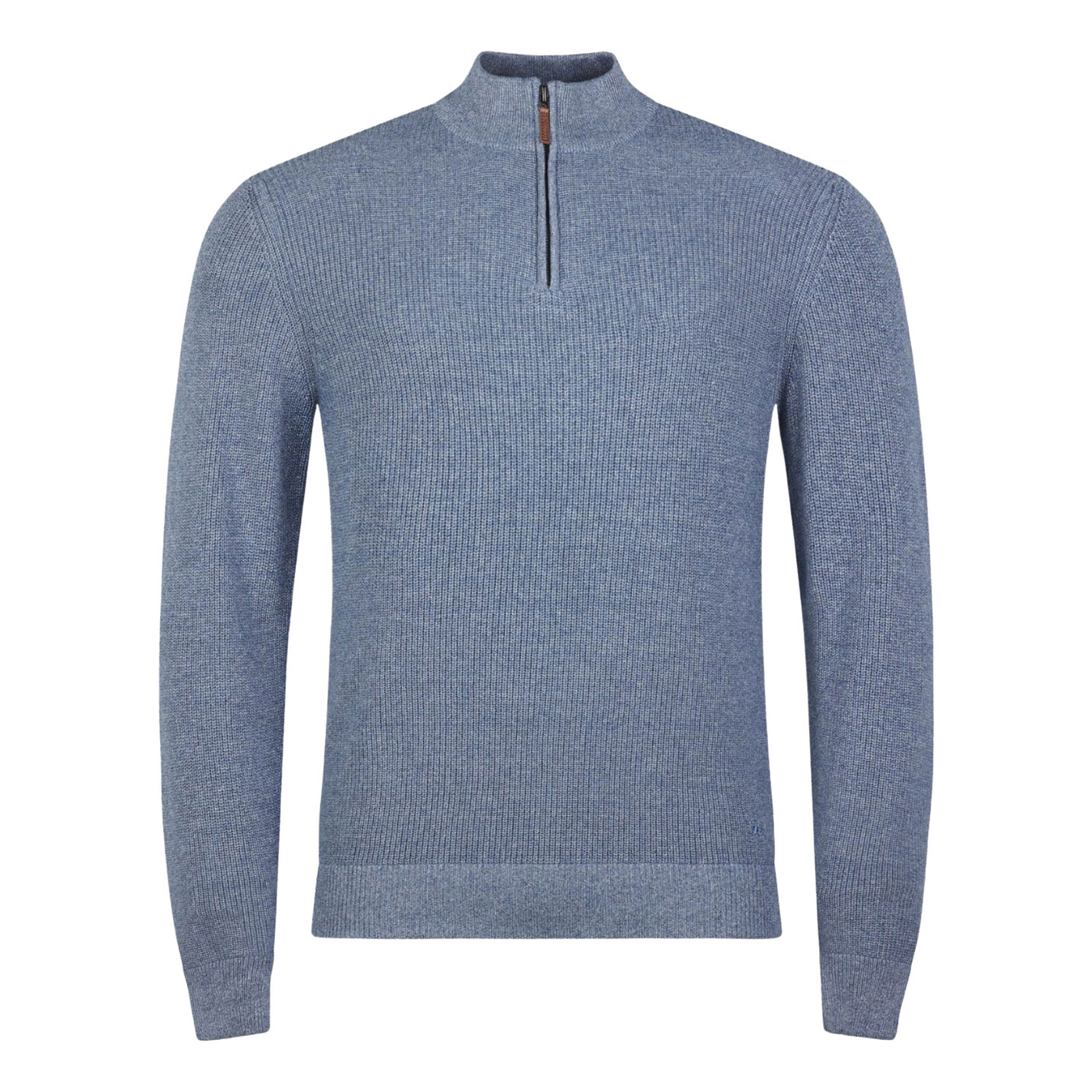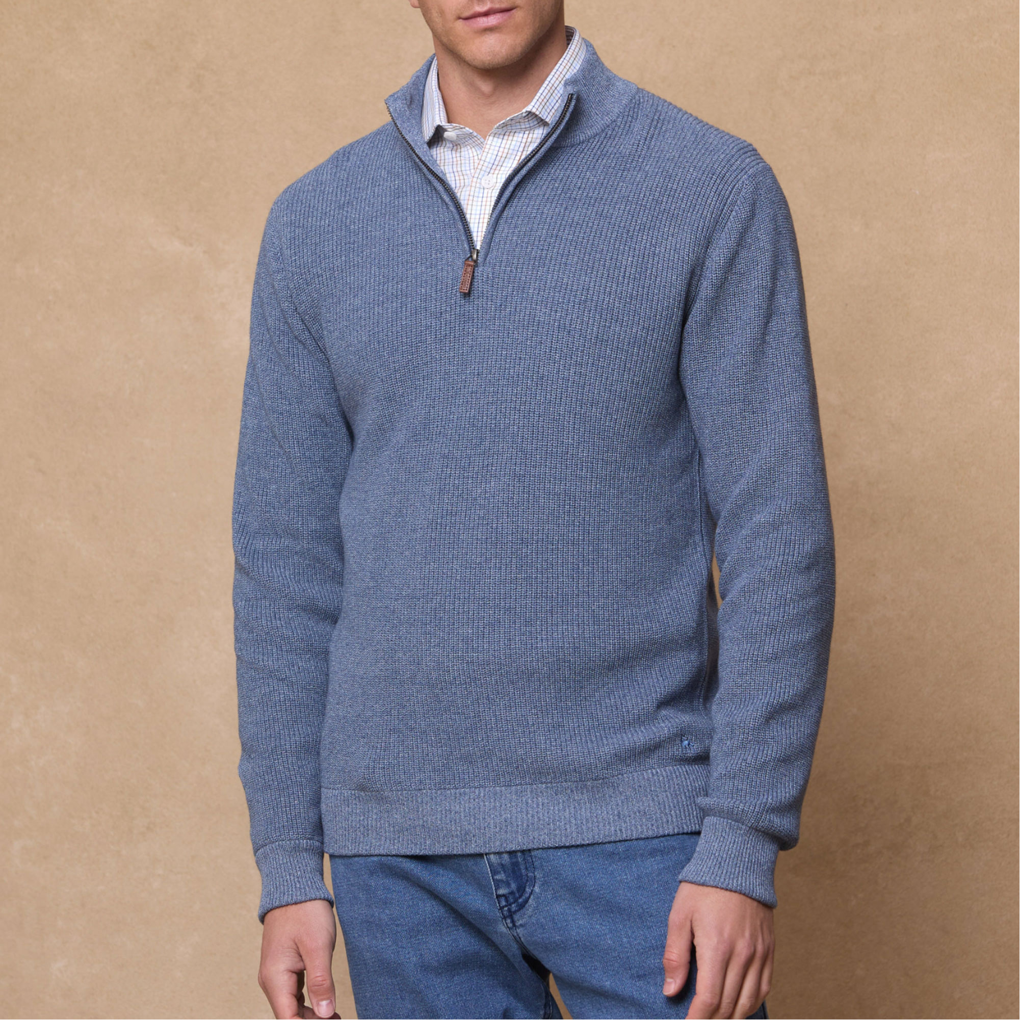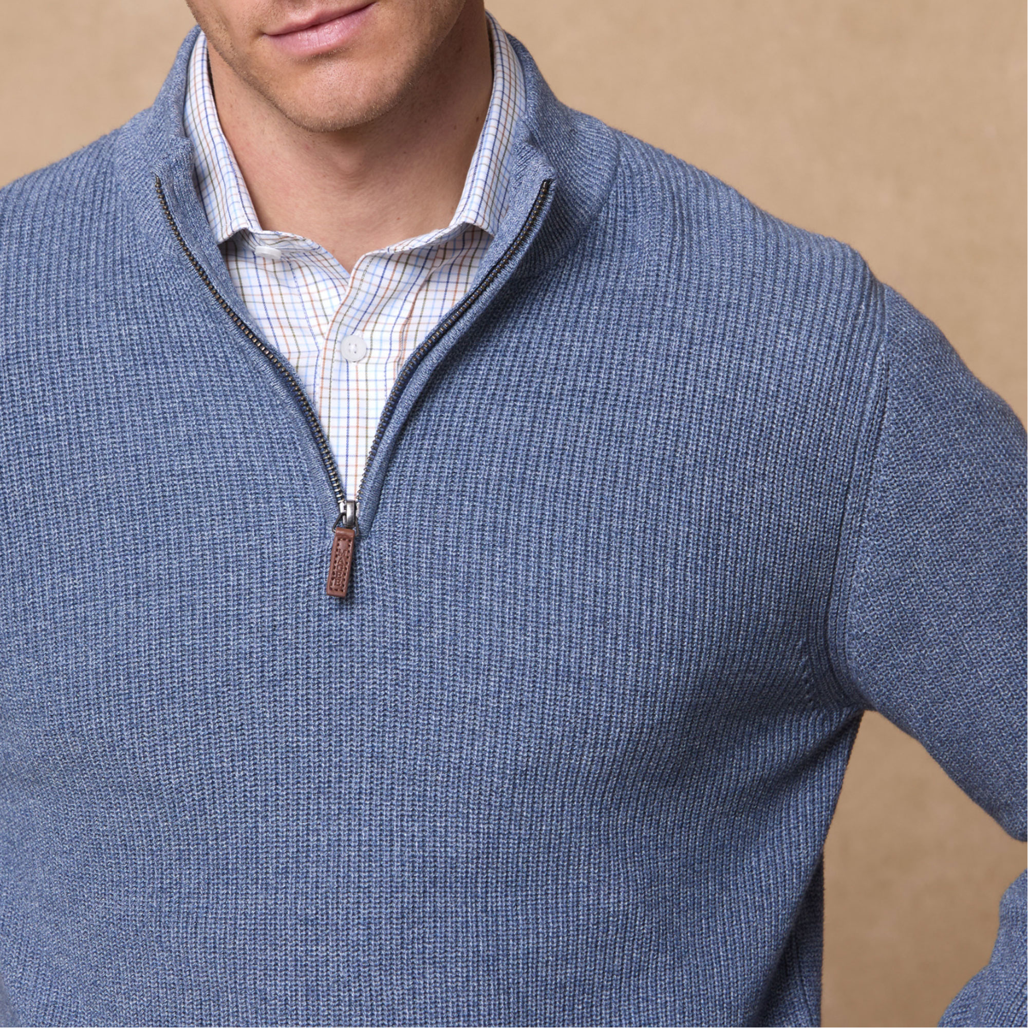 • Quarter-zip fastening, ribbed knit, leather branded tab, single cuff & hem