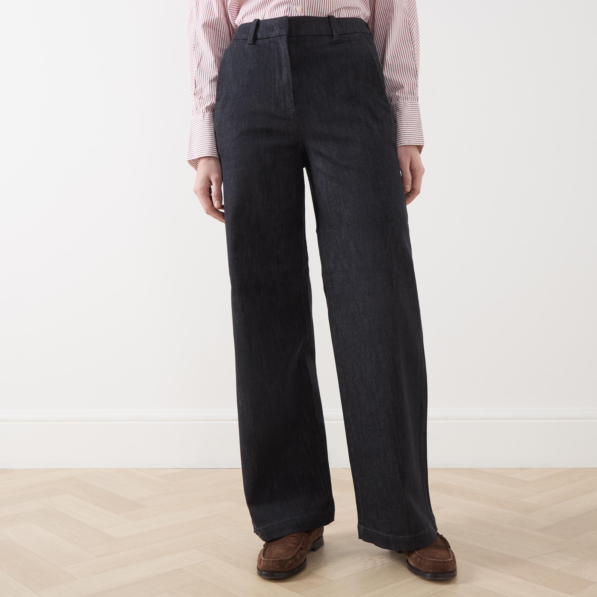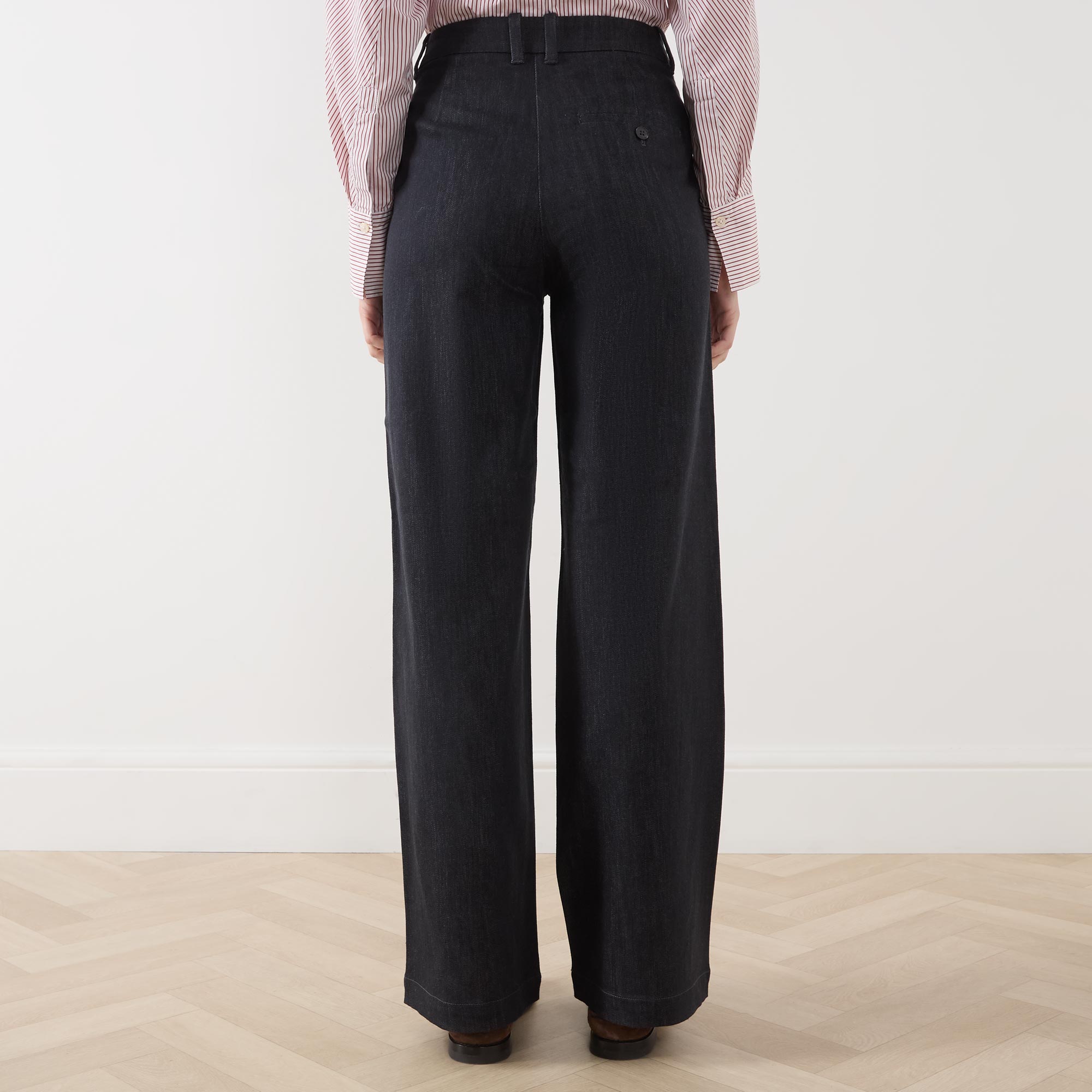 • High rise, wide flared leg, belt loops, concealed fly with hook and bar fastening, two slanted side pockets, two rear piped pockets one with button fastening, clean hems, tonal stitching, dark wash finish