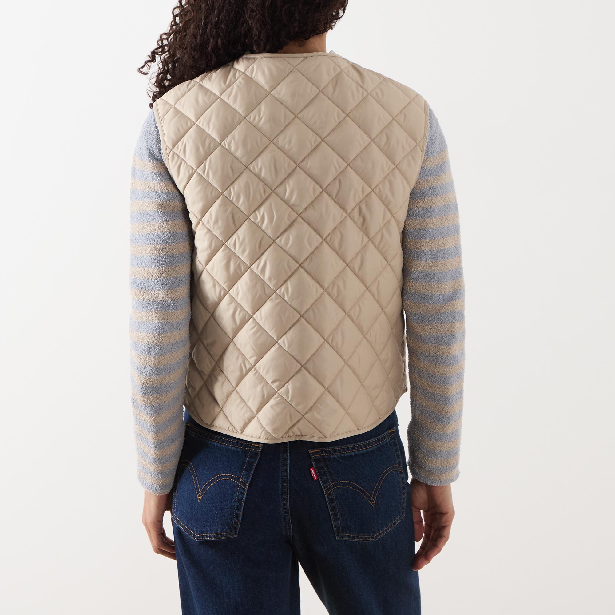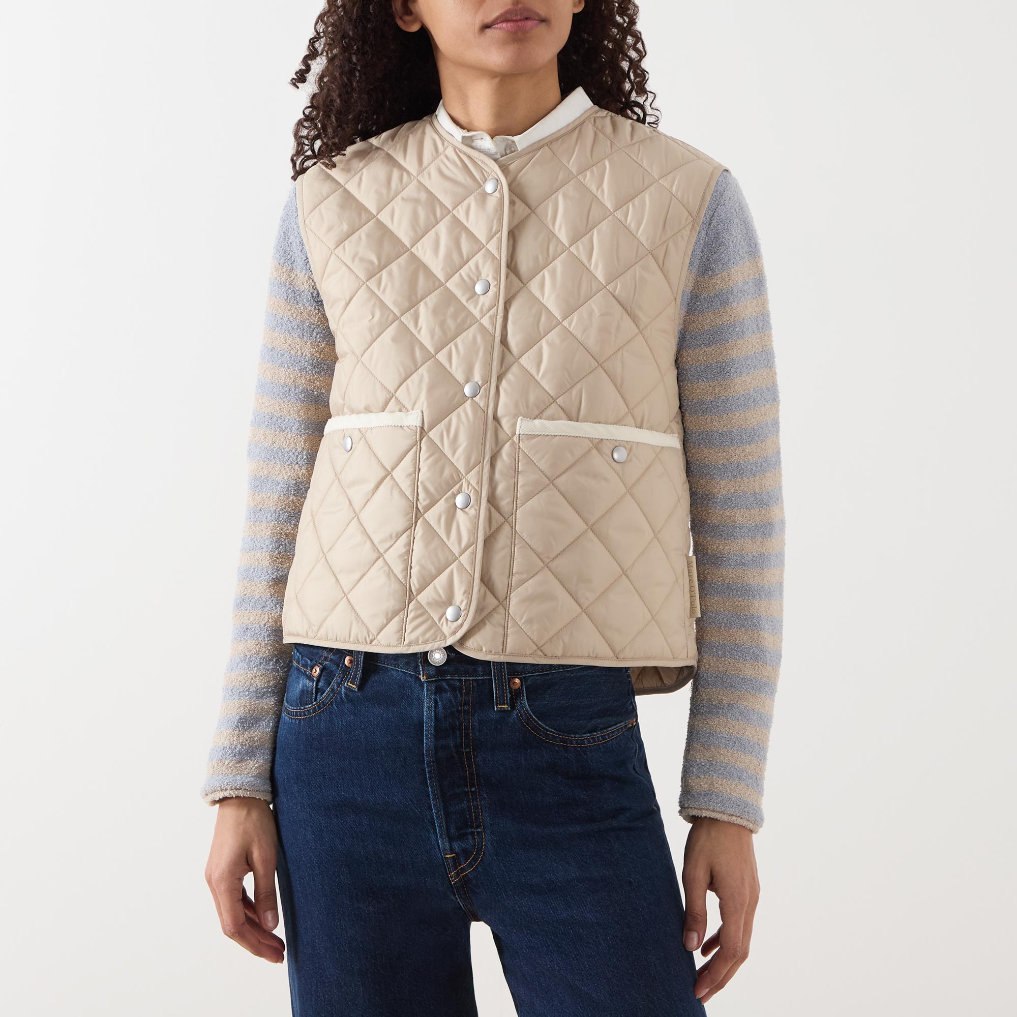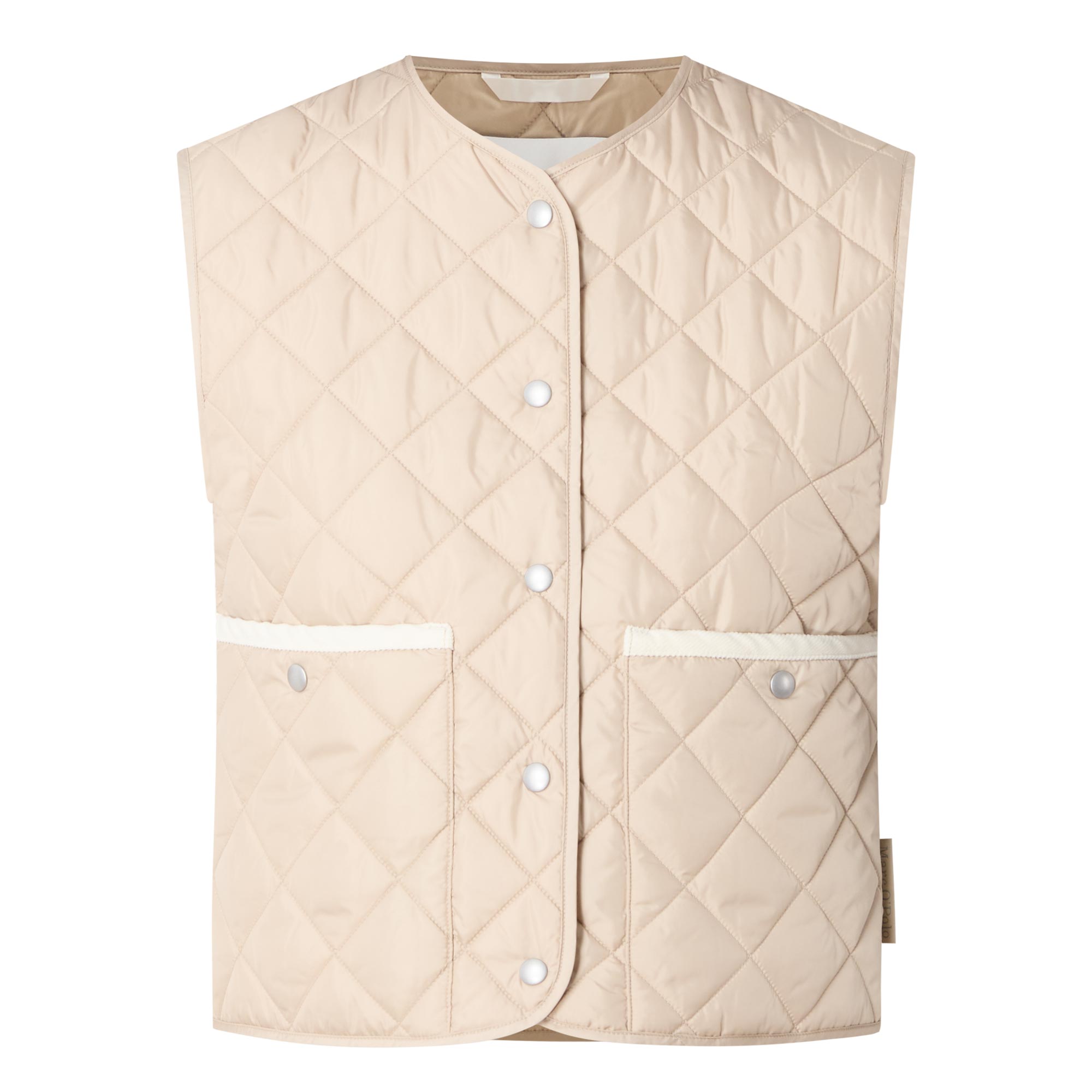 - Round neckline, snap button fastening, sleeveless, patch pockets, diamond quilted finish, logo details