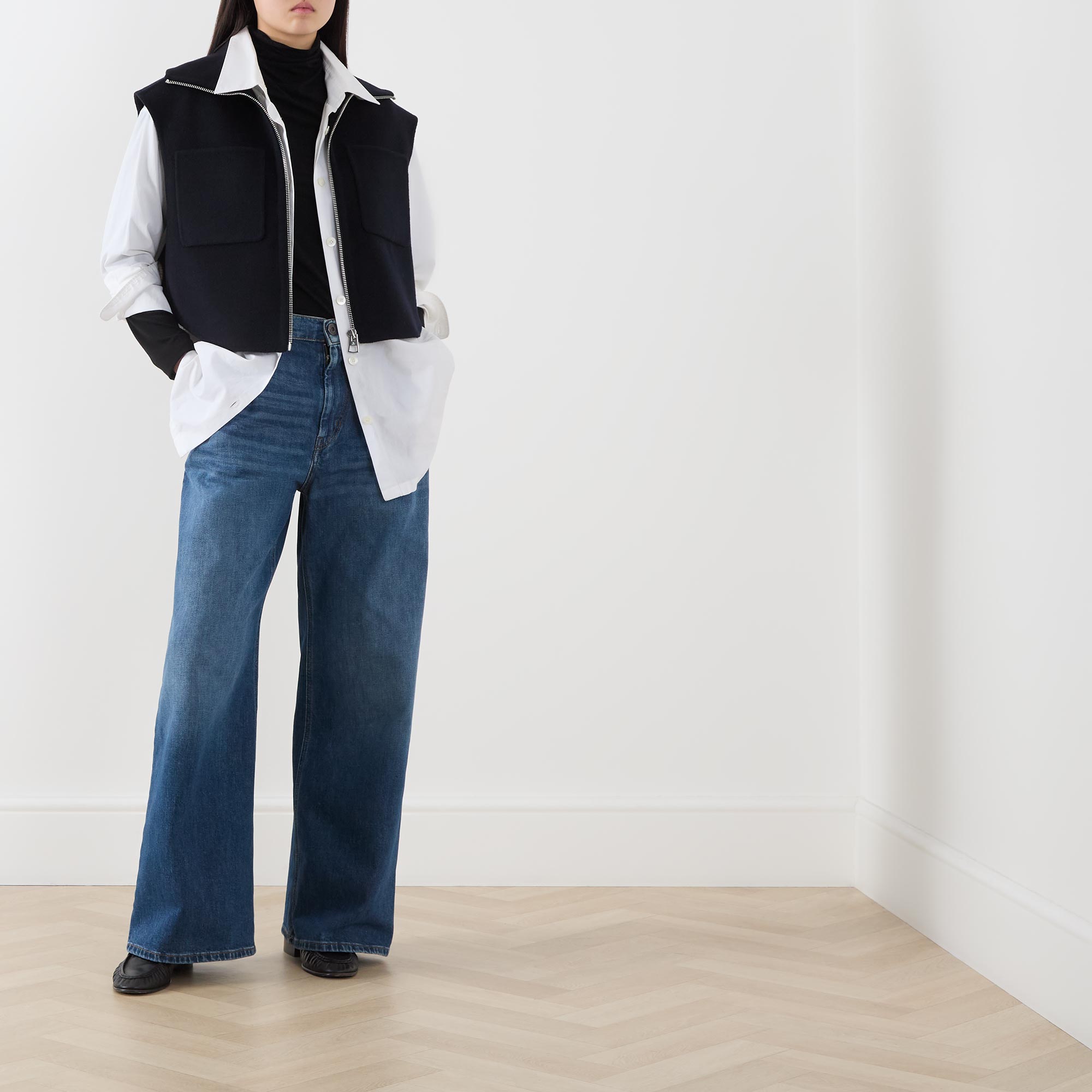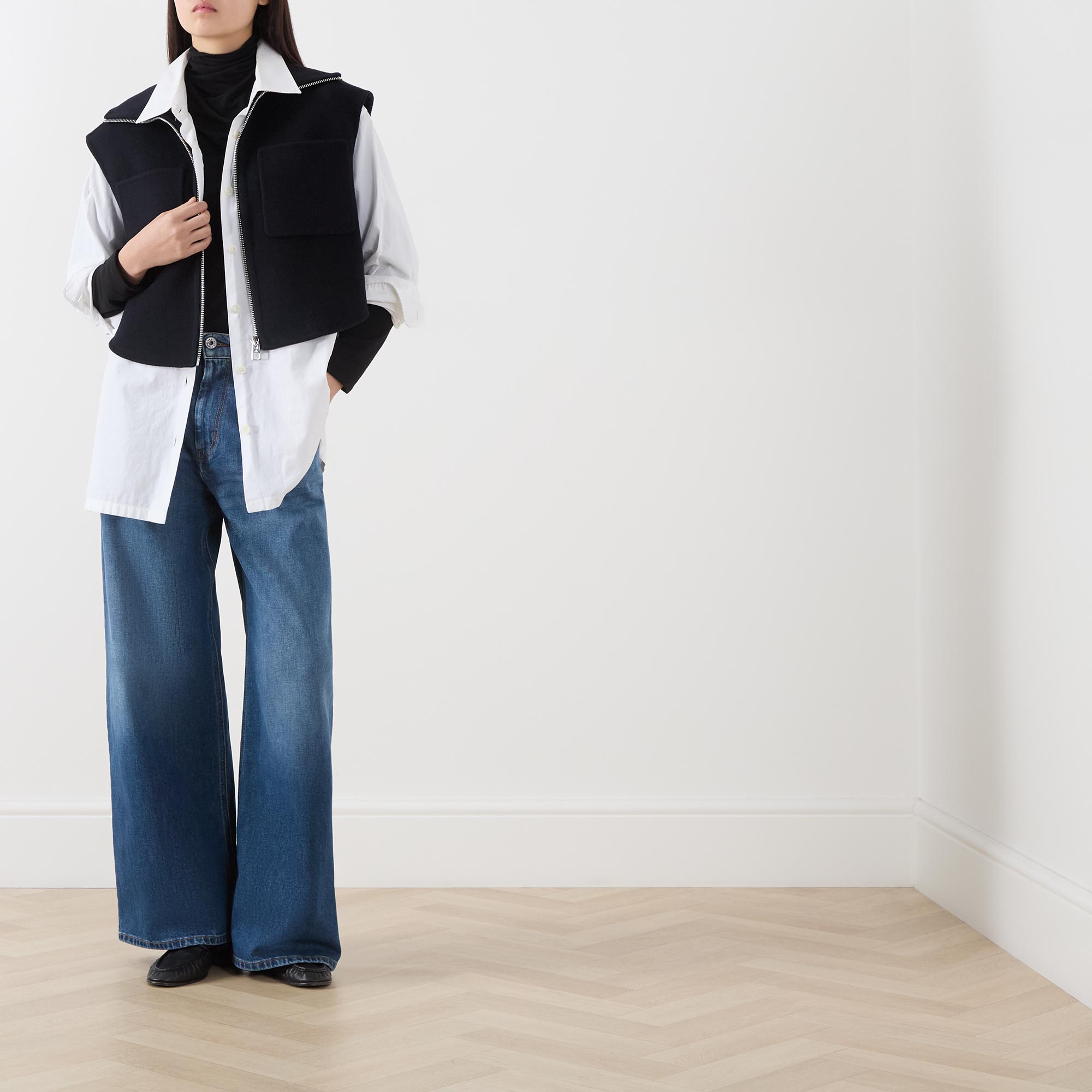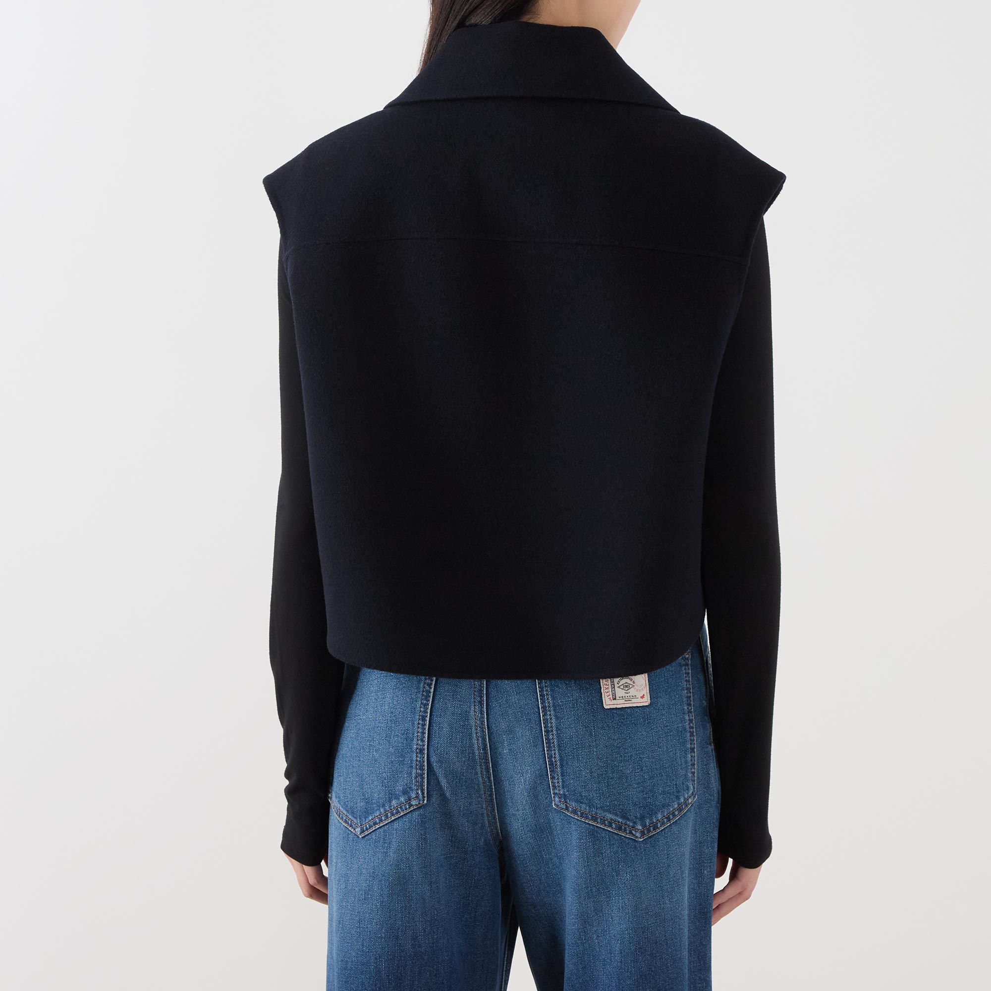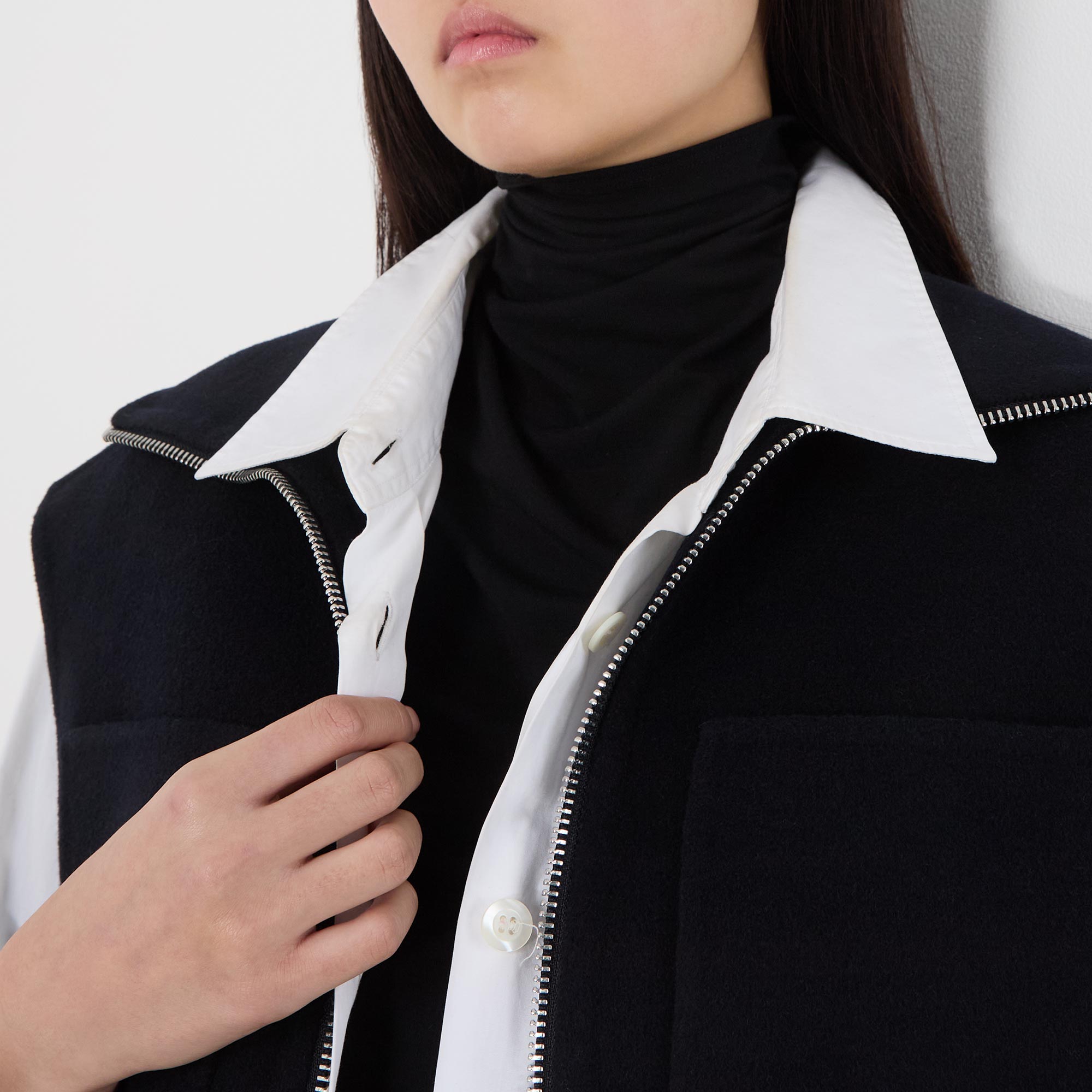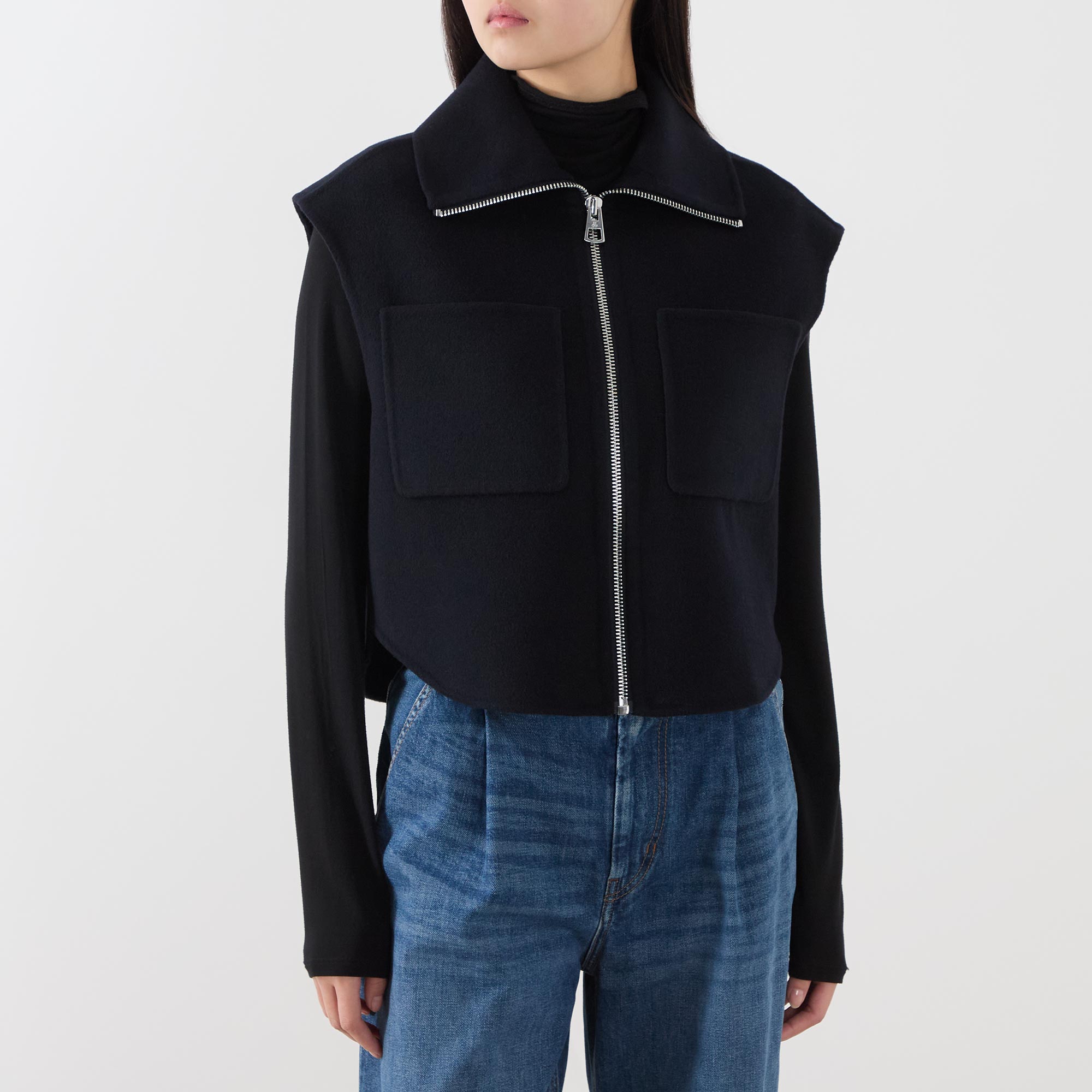 - Funnel neck, dropped shoulders, sleeveless design, two chest patch pockets, front zip fastening, rounded hem, double-faced design, soft finish