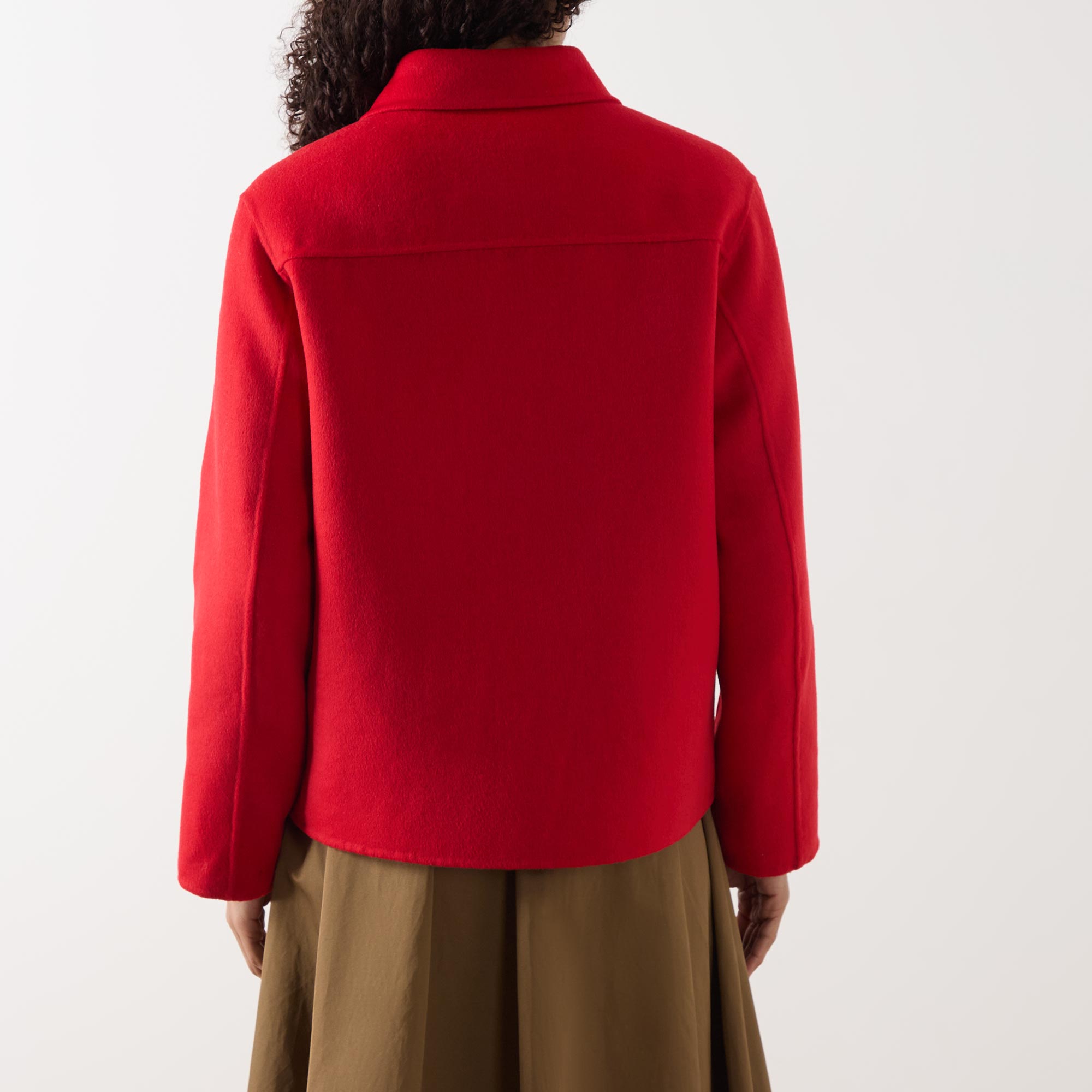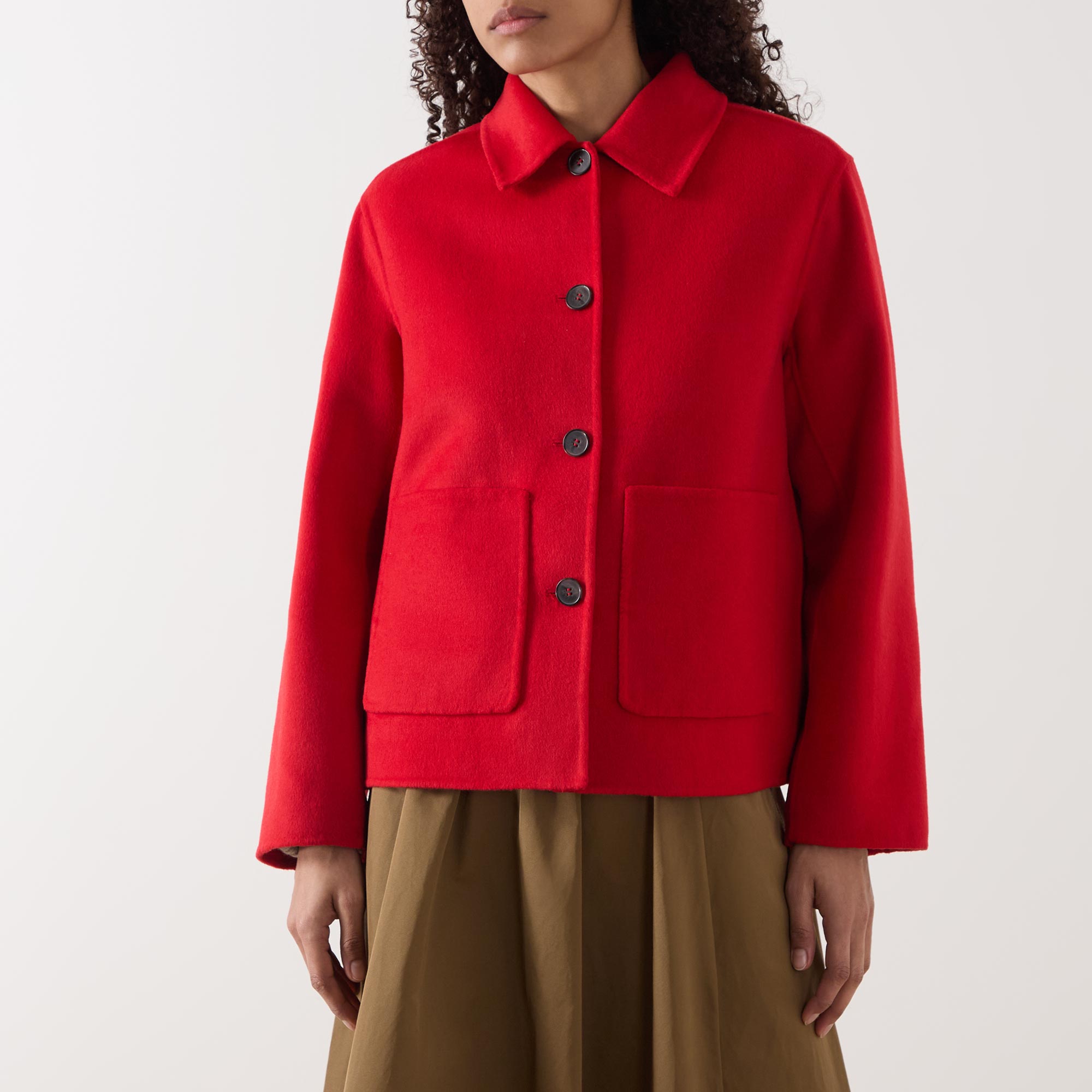 - Point collar, long sleeves, front button fastening, two large patch pockets, straight hem, cropped length, soft finish