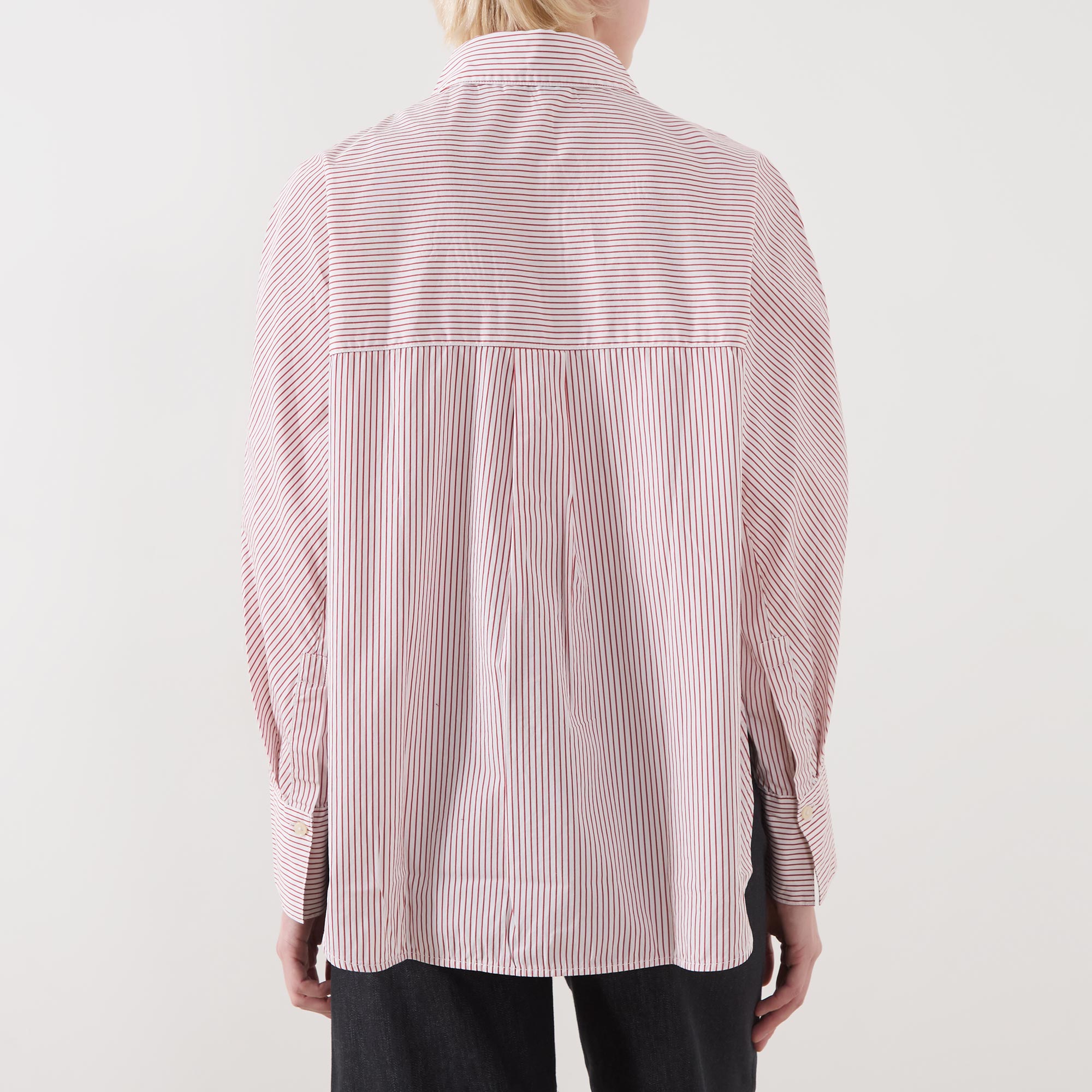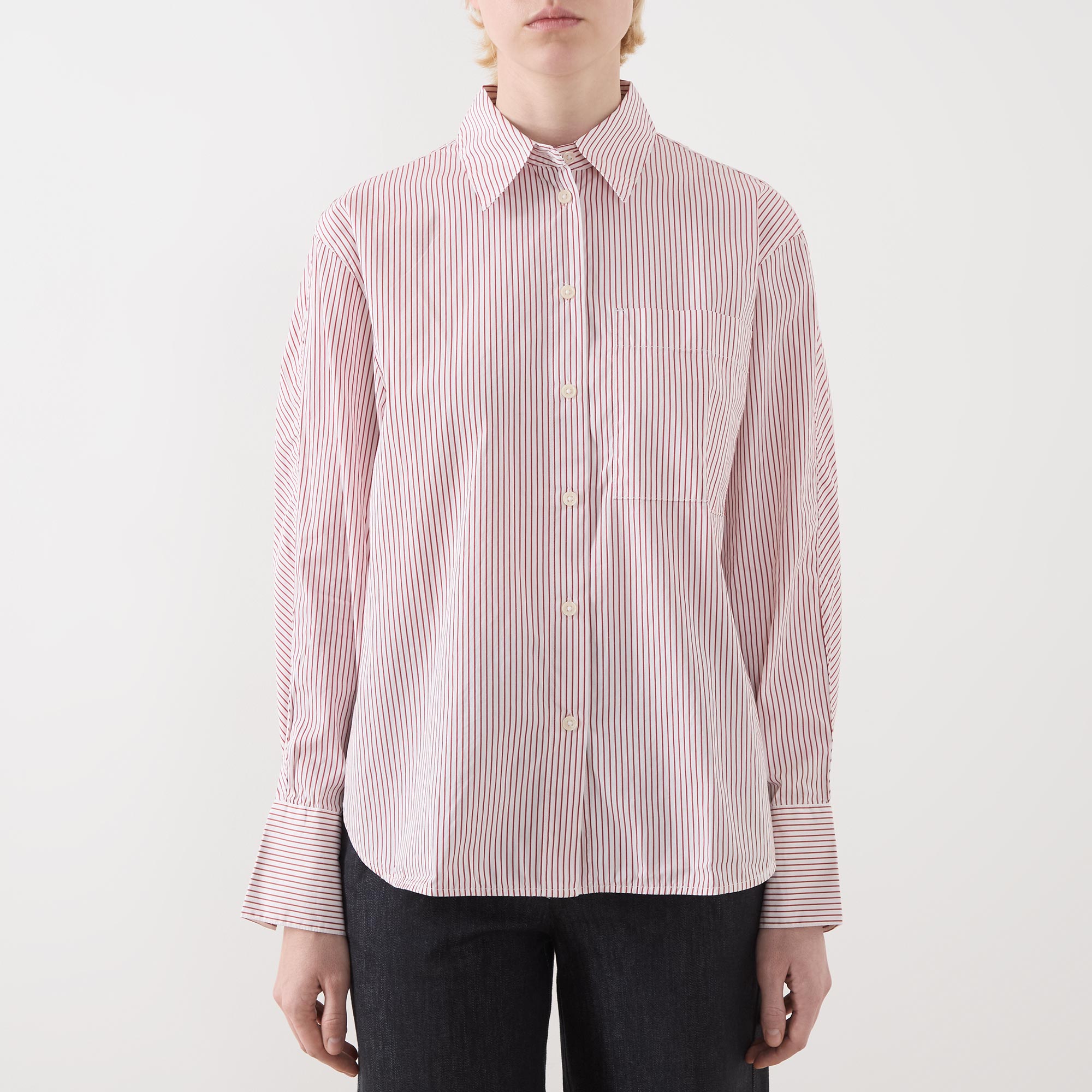 - Point collar, dropped shoulders, long sleeves, buttoned cuffs, one chest patch pocket, front button fastening, curved hem, rear box pleat, striped pattern
