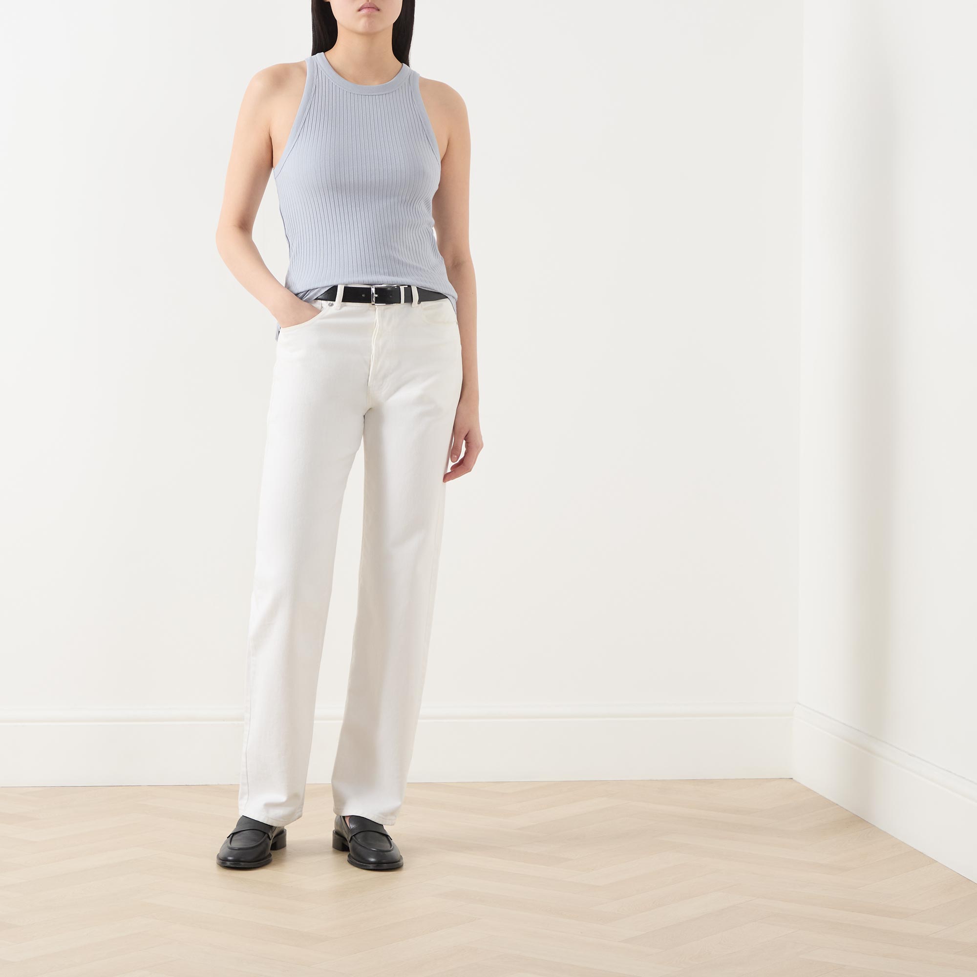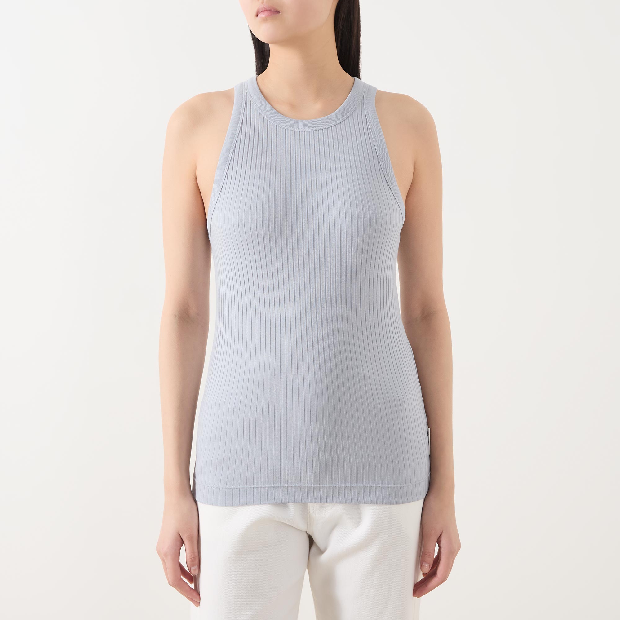 - Racer neckline, sleeveless, straight hemline, rib knit structure