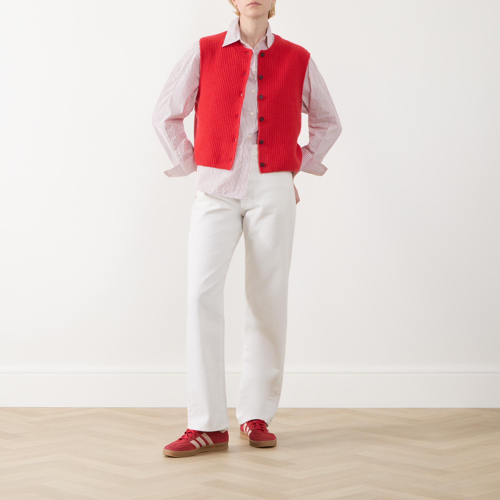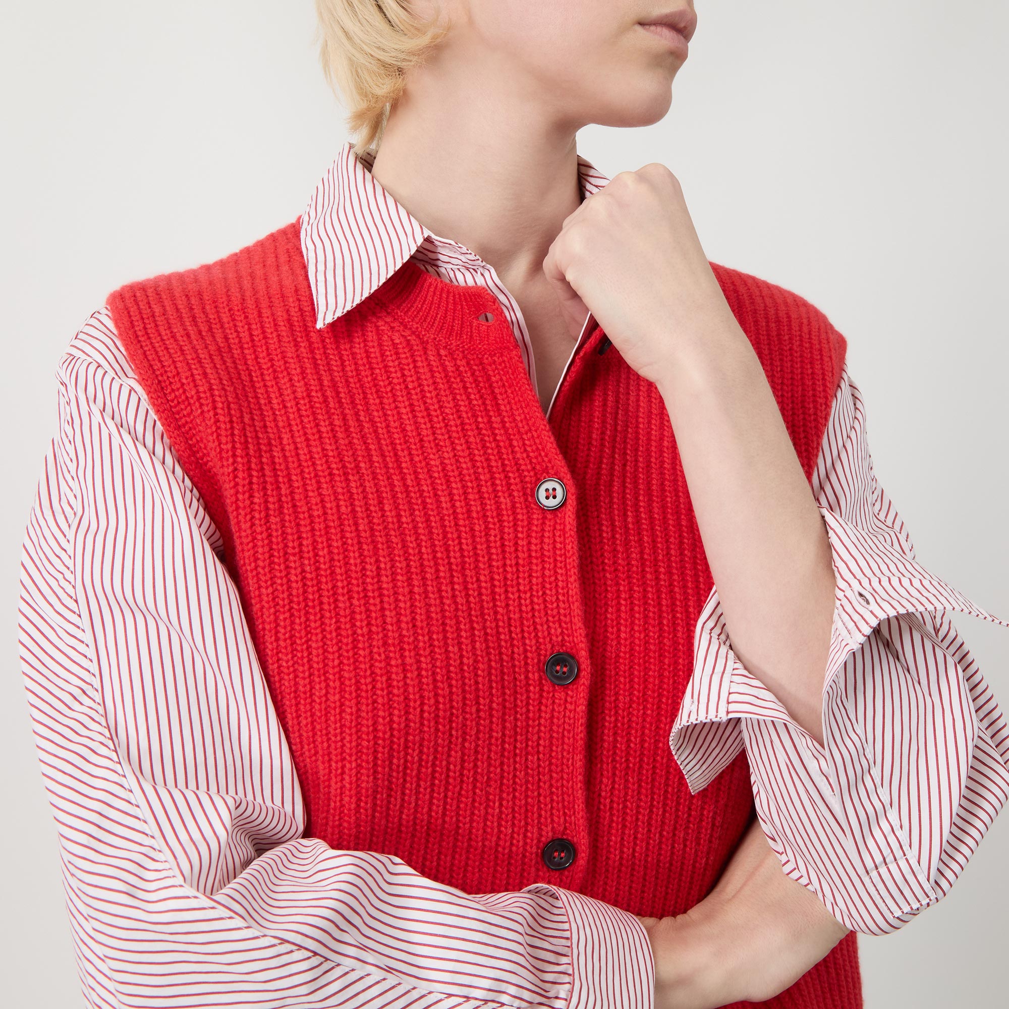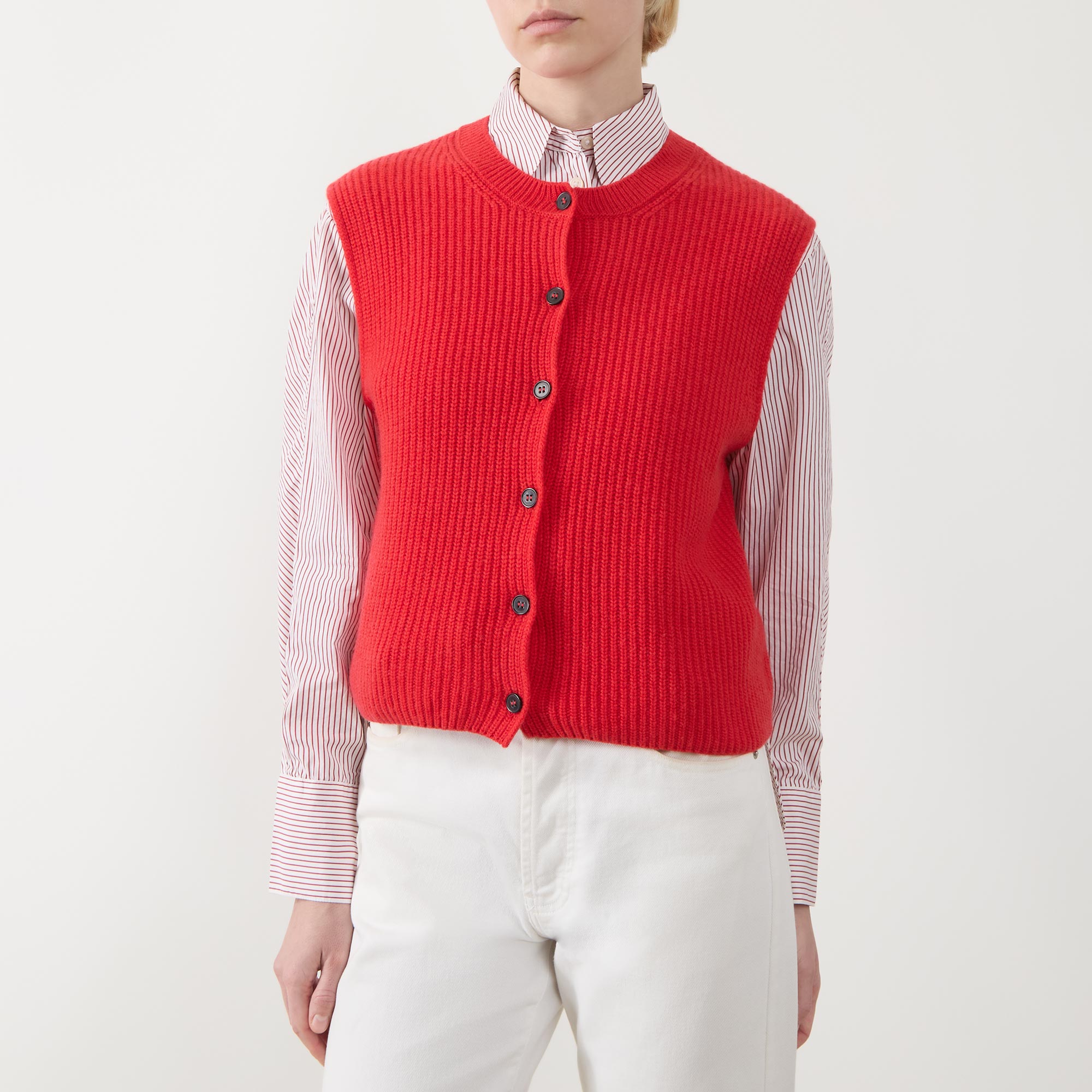 - Round neckline, sleeveless design, front button fastening, straight hem, bound trims, rib knit construction, soft finish