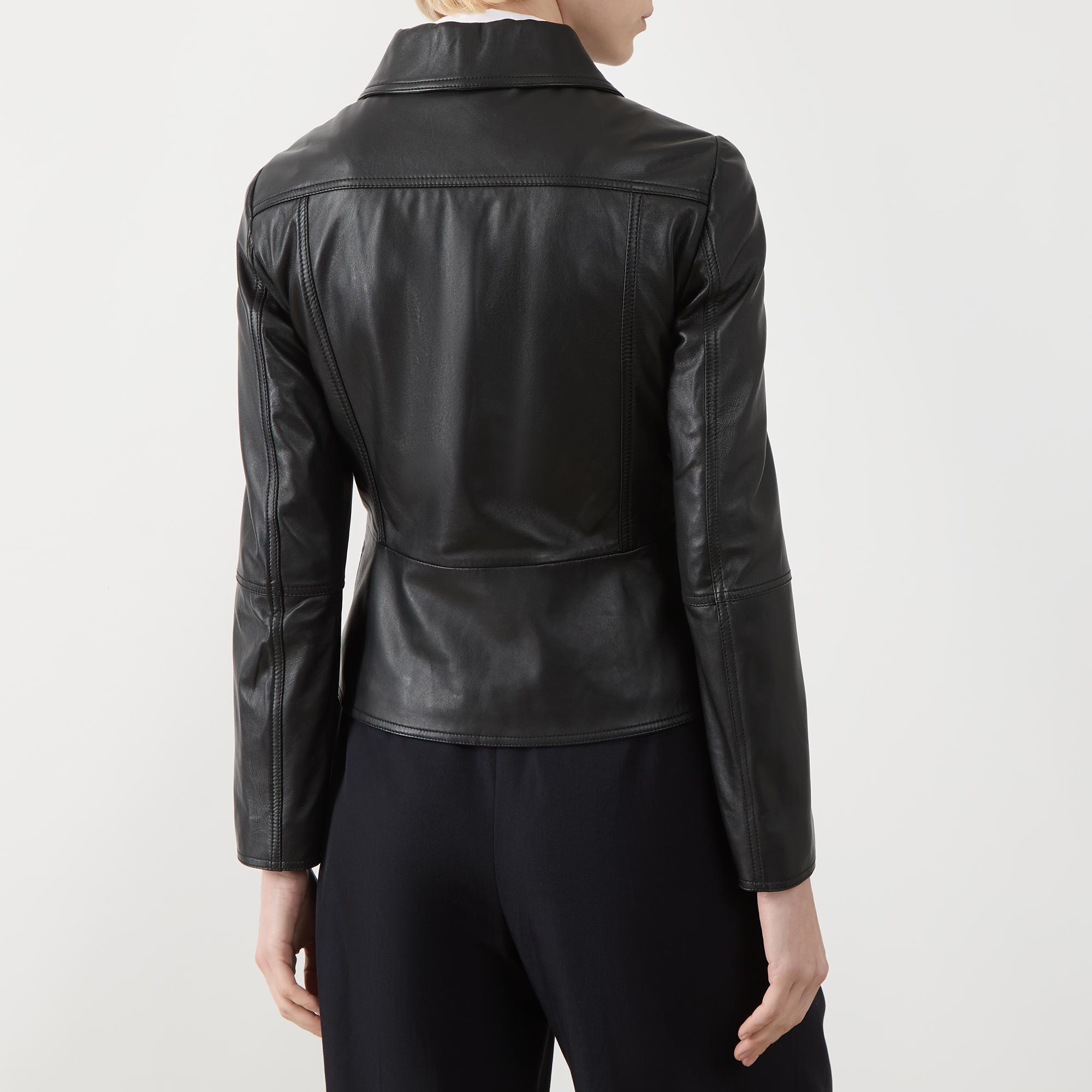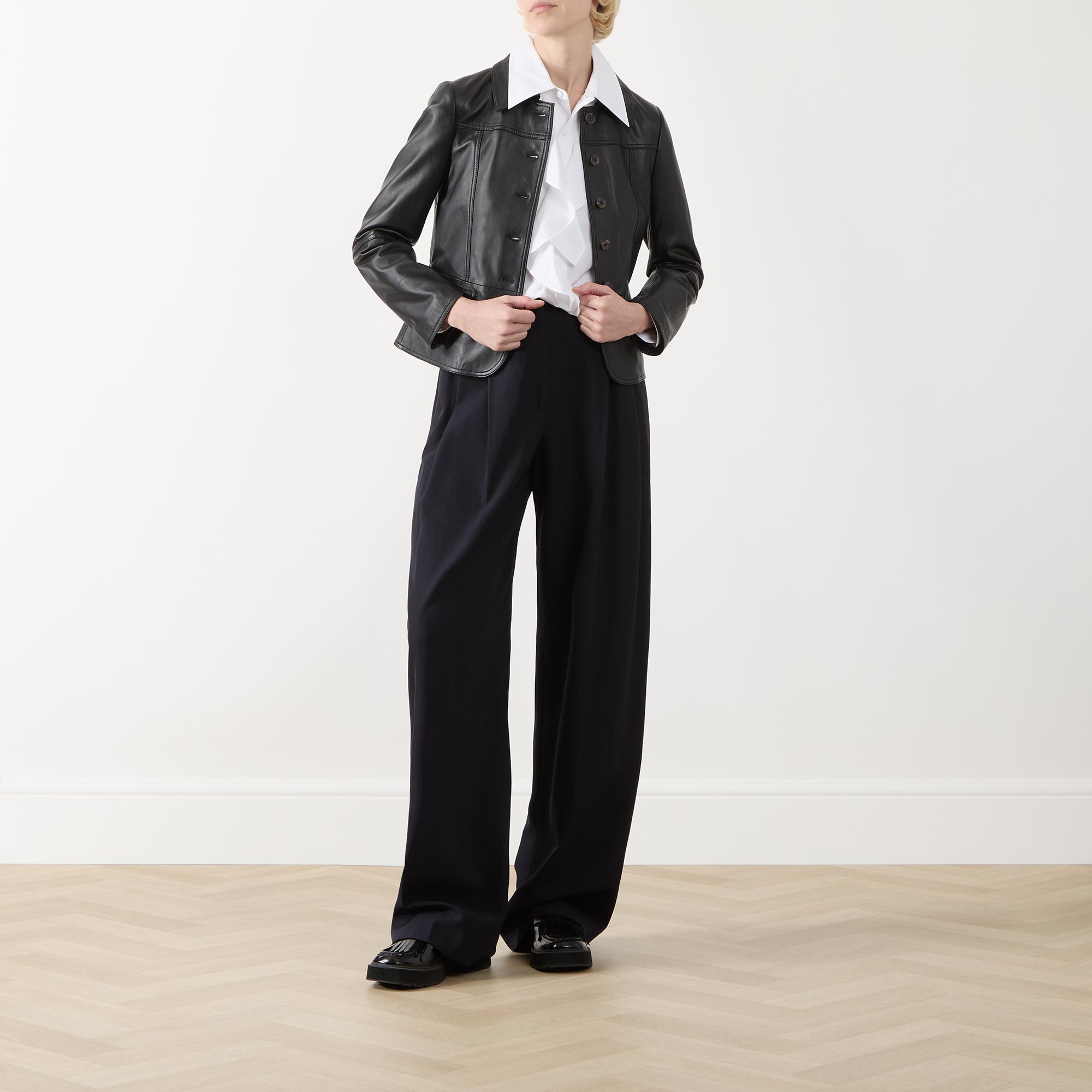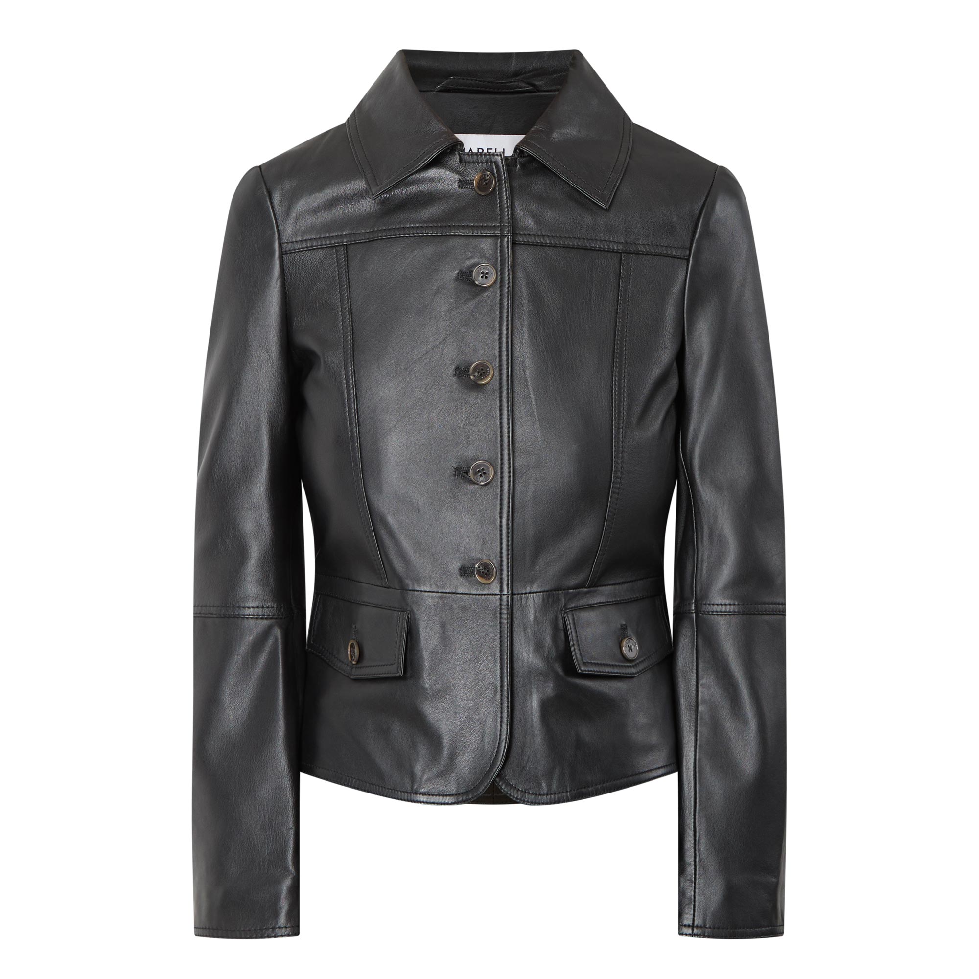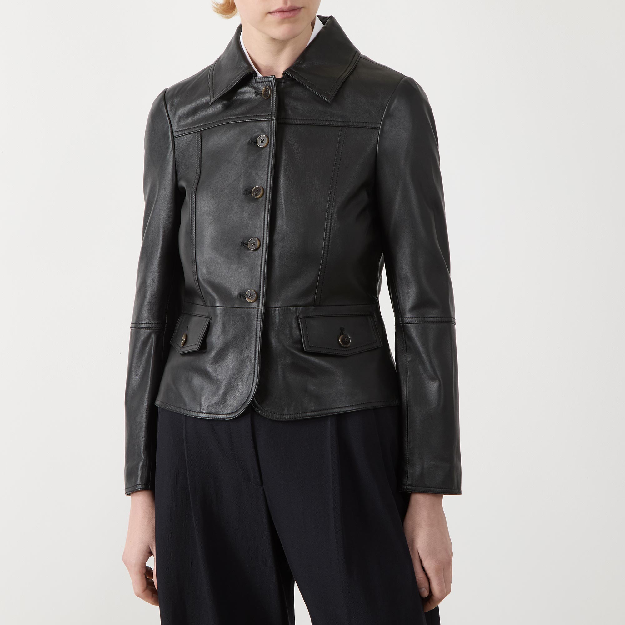 • Point collar, long sleeves, front button fastening, two hip flap pockets with button closures, curved hem, smooth leather finish