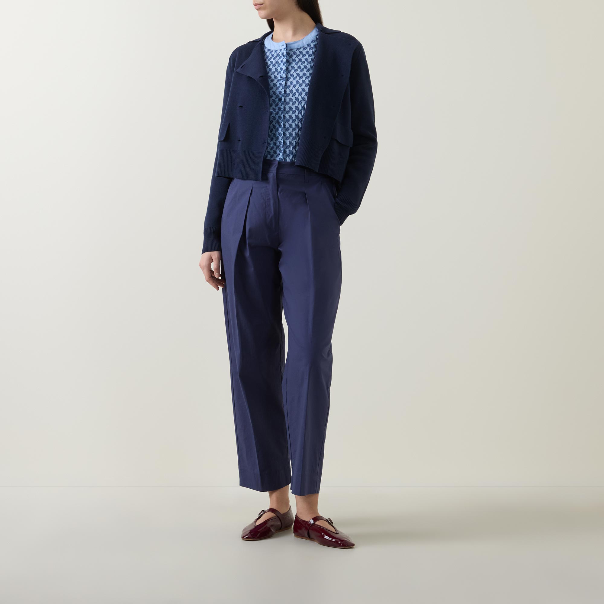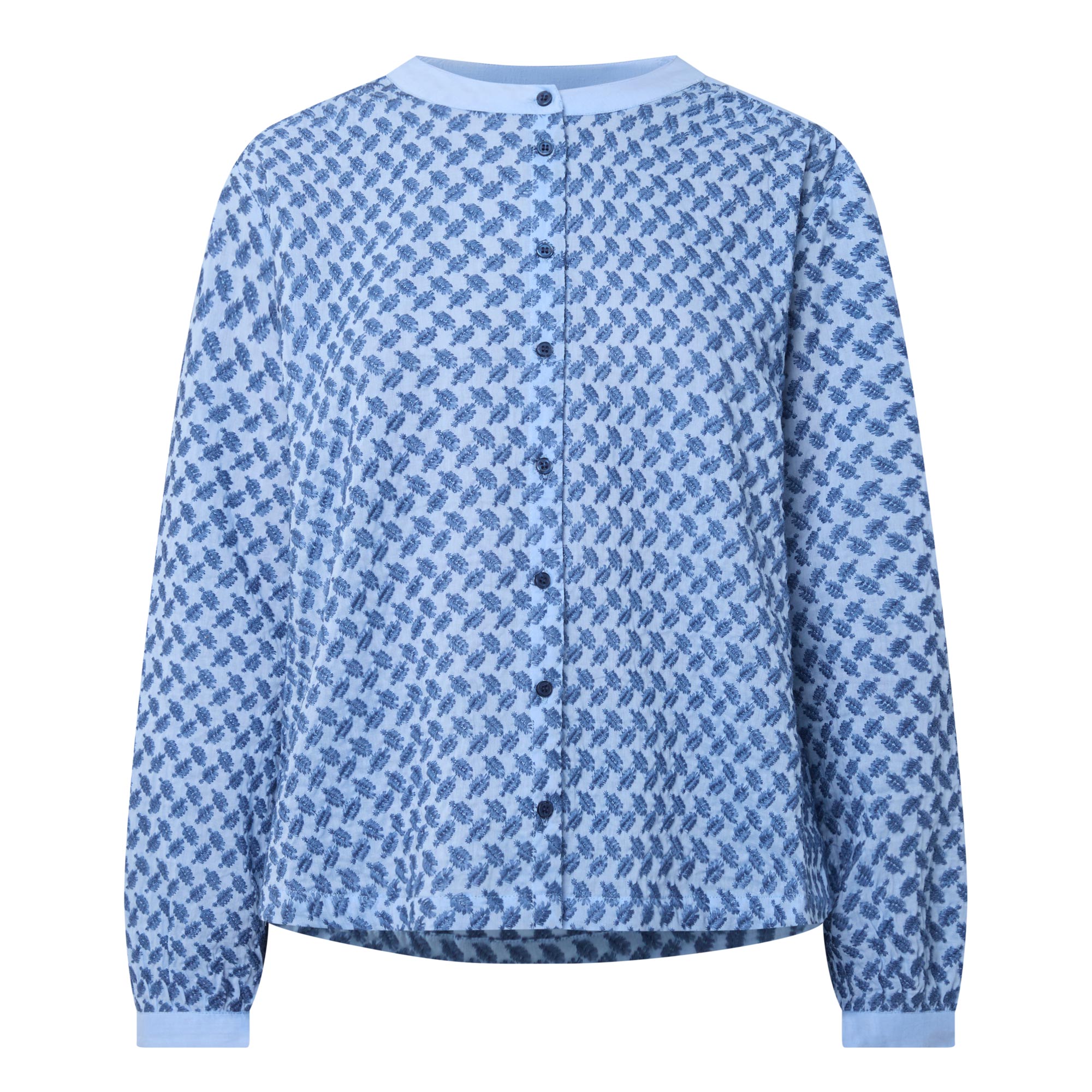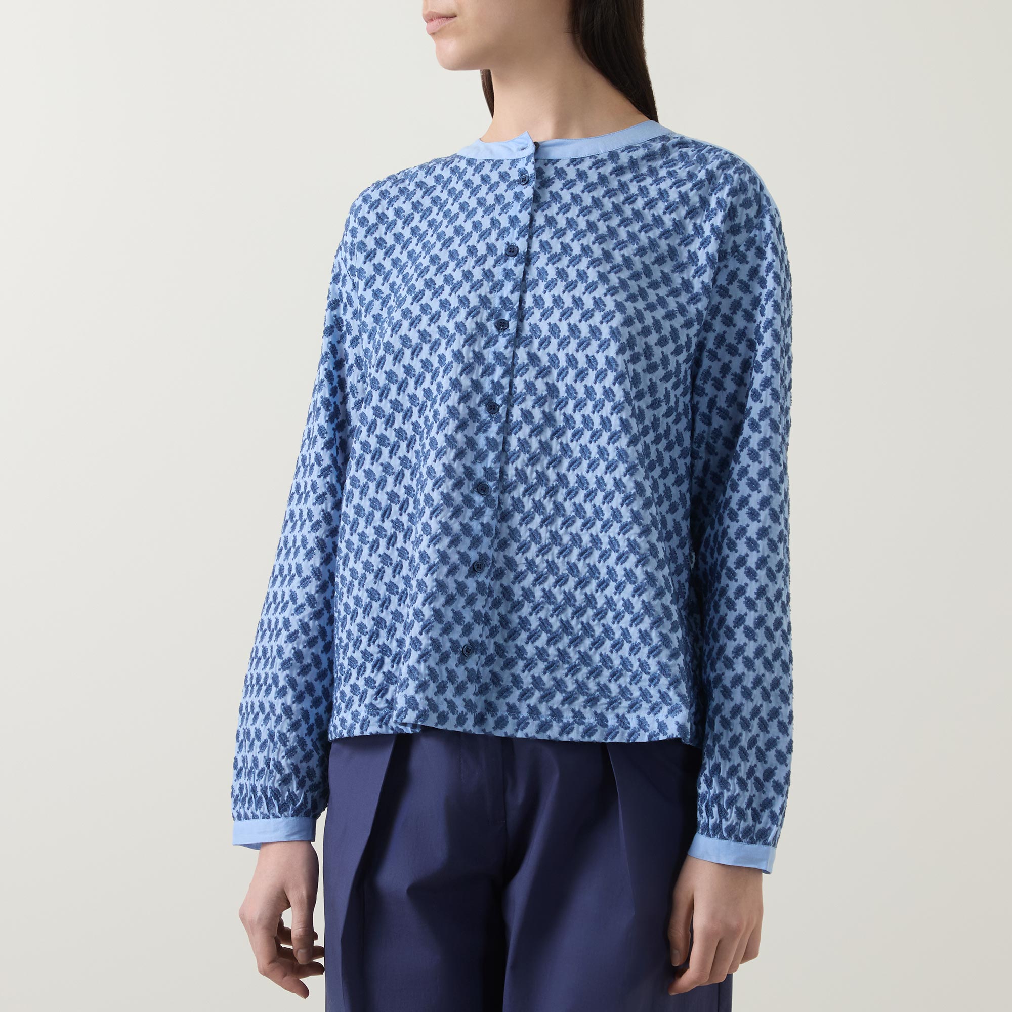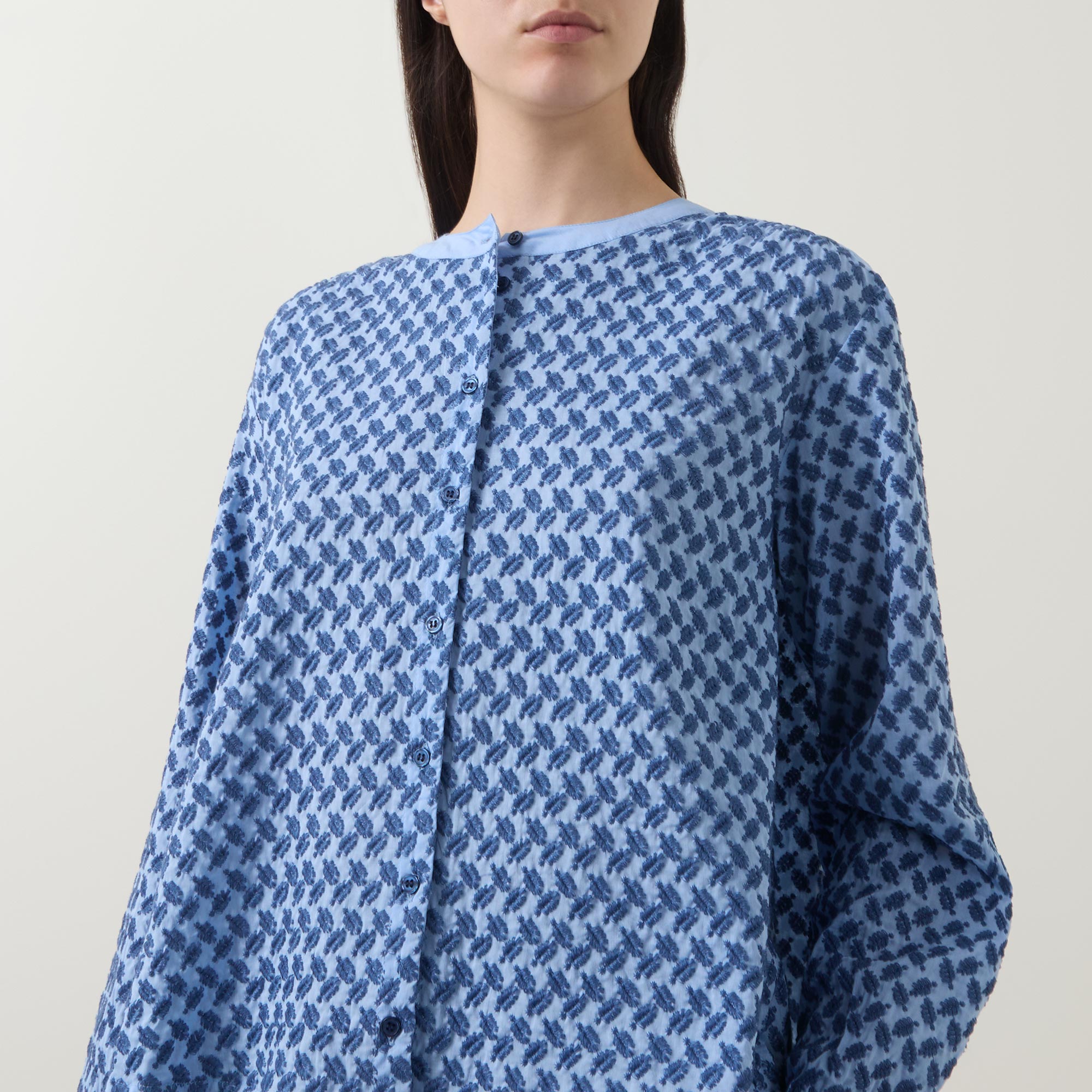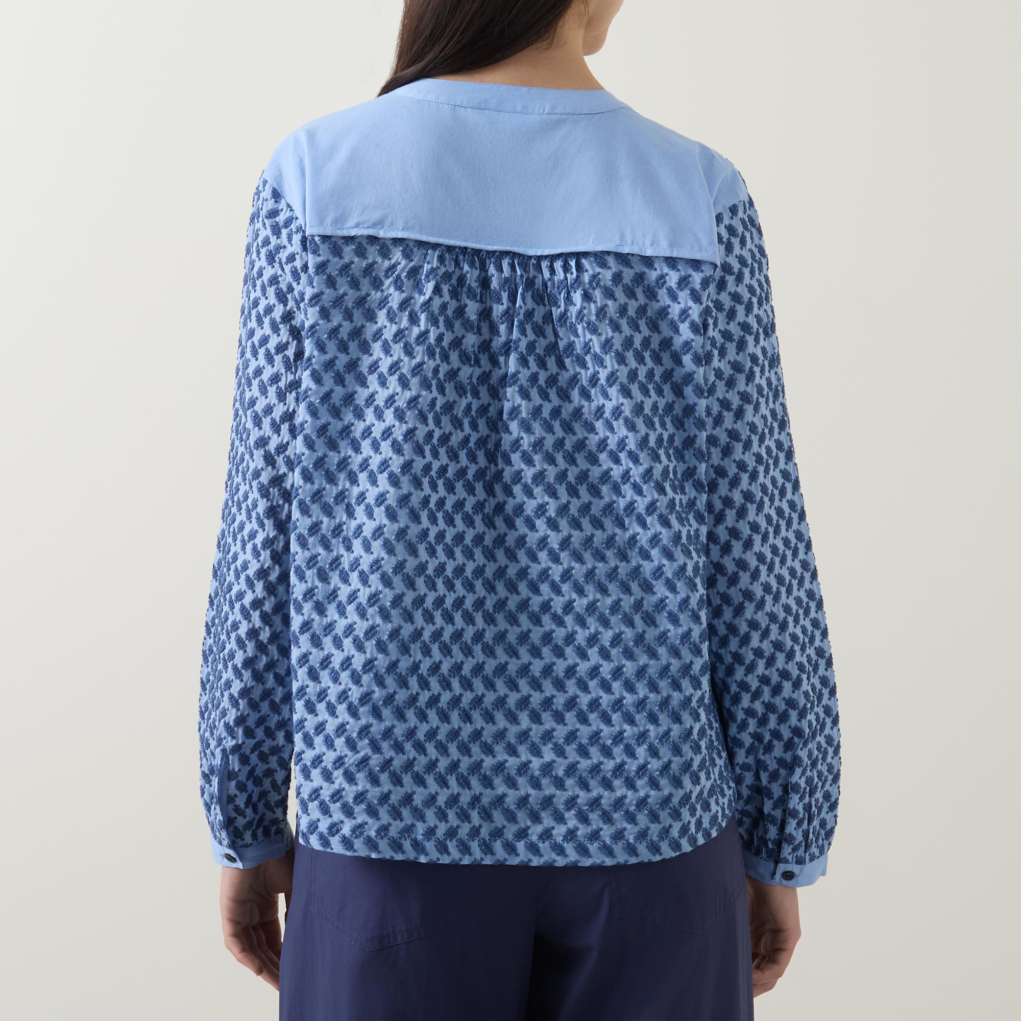 - Stand collar, dropped shoulders, long sleeves, buttoned cuffs, front button fastening, curved hem, rear pleating, embroidered design, contrast trim detailing