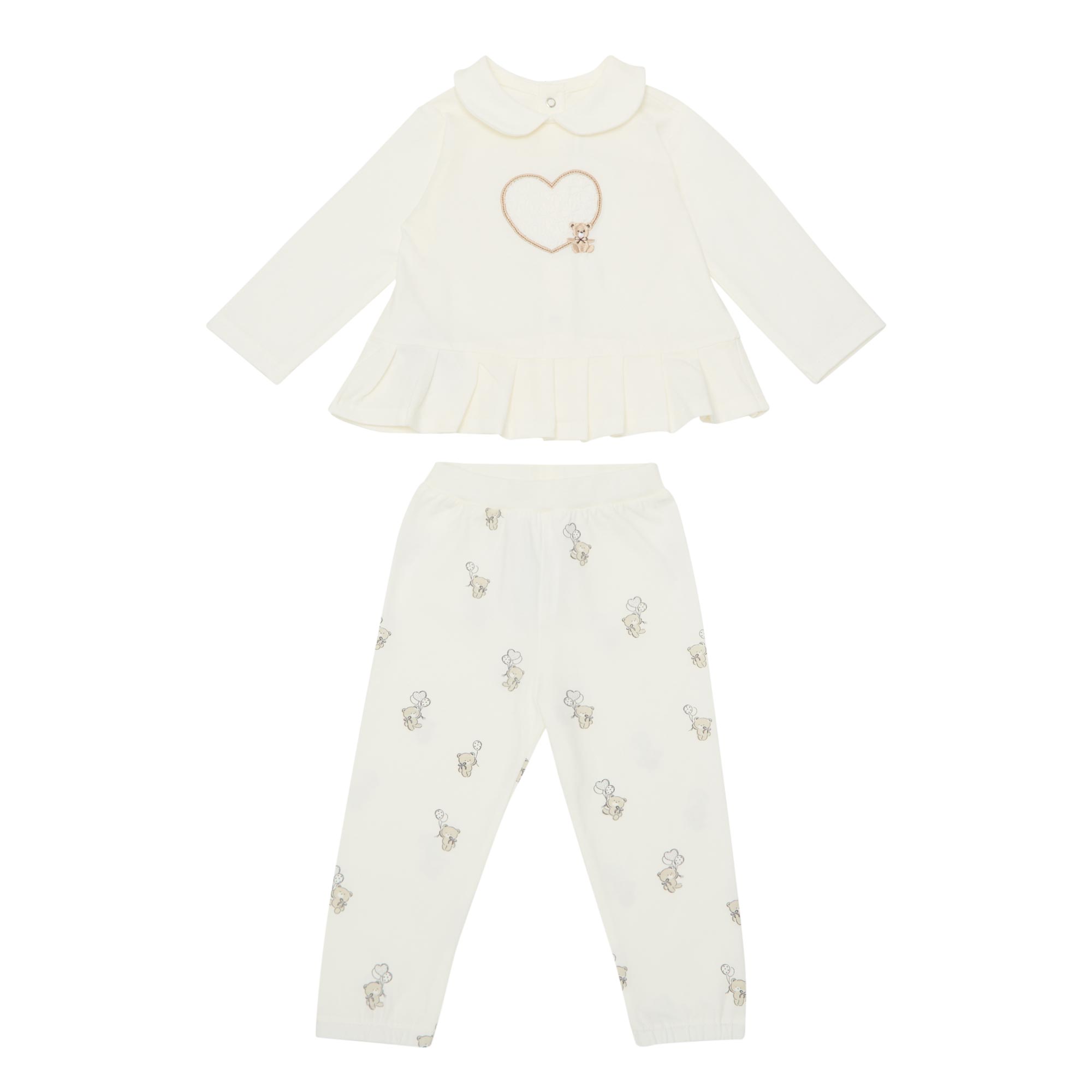 - Two-piece set: Blouse: Peter Pan collar, long sleeves, rear snap button fastening, peplum hem, heart and Teddy Bear embroidery; Bottoms: Elasticated waistband, slim leg, Teddy Bear print
