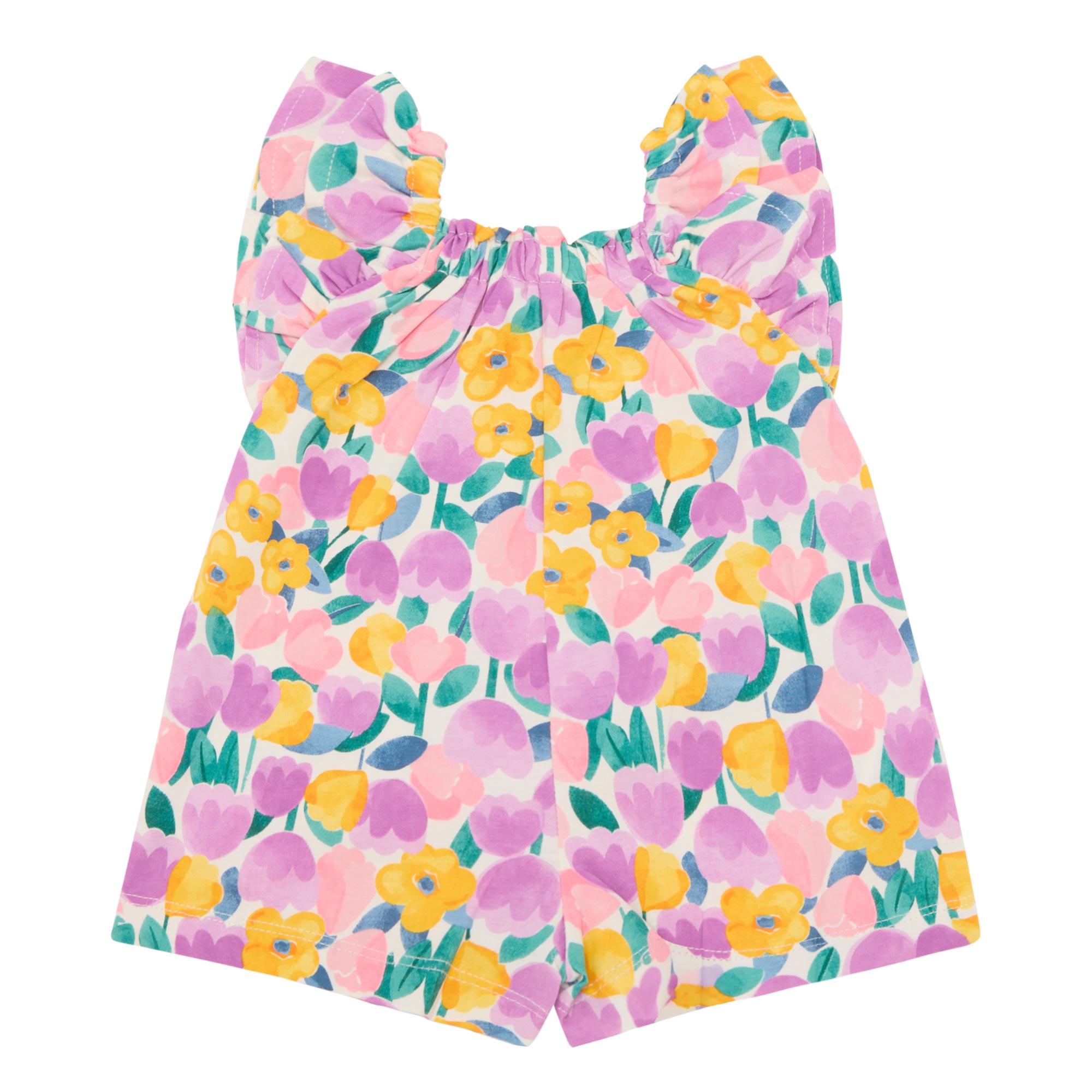 - Square neckline, elasticated trim, sleeveless, pleated trims, romper-style design, clean hems, floral pattern