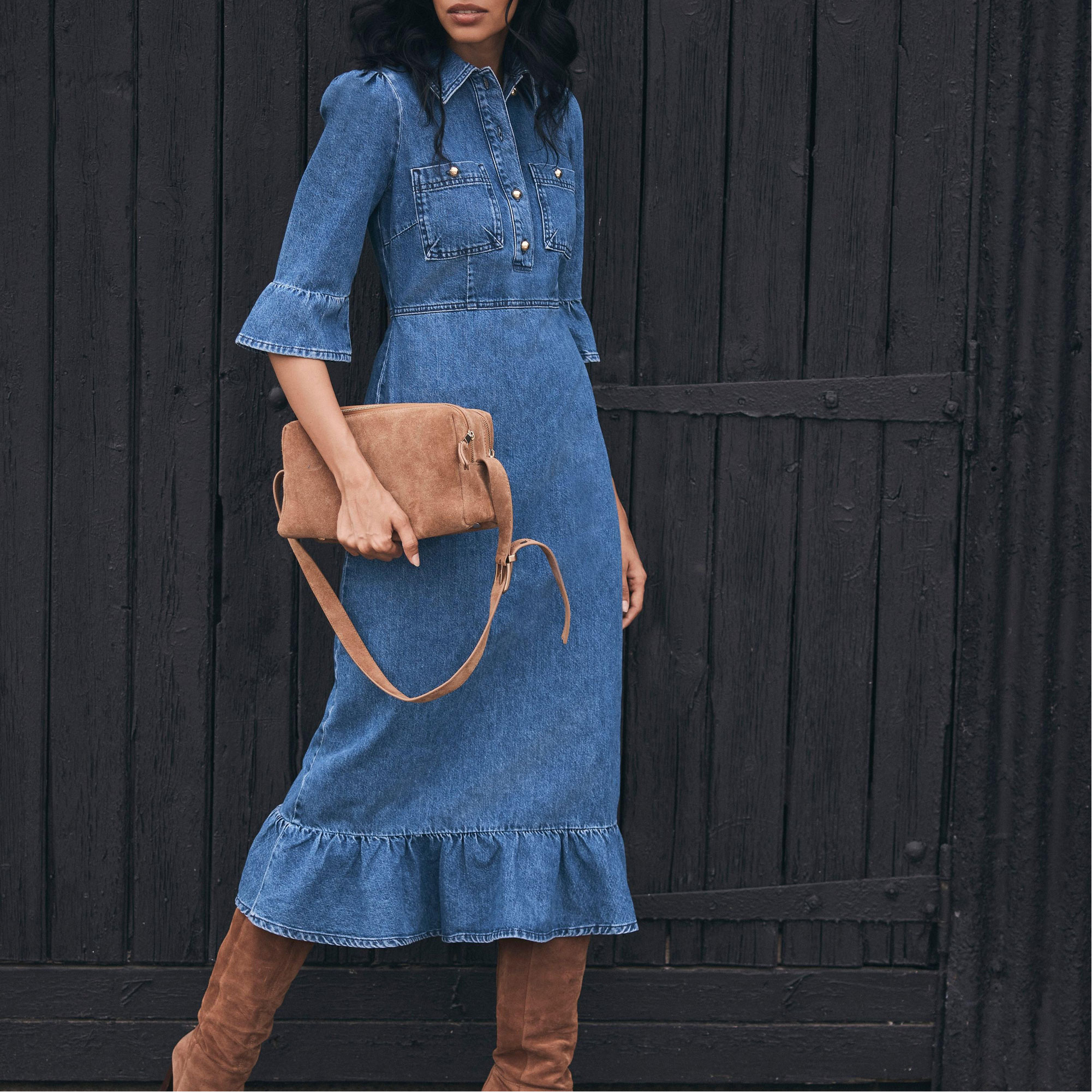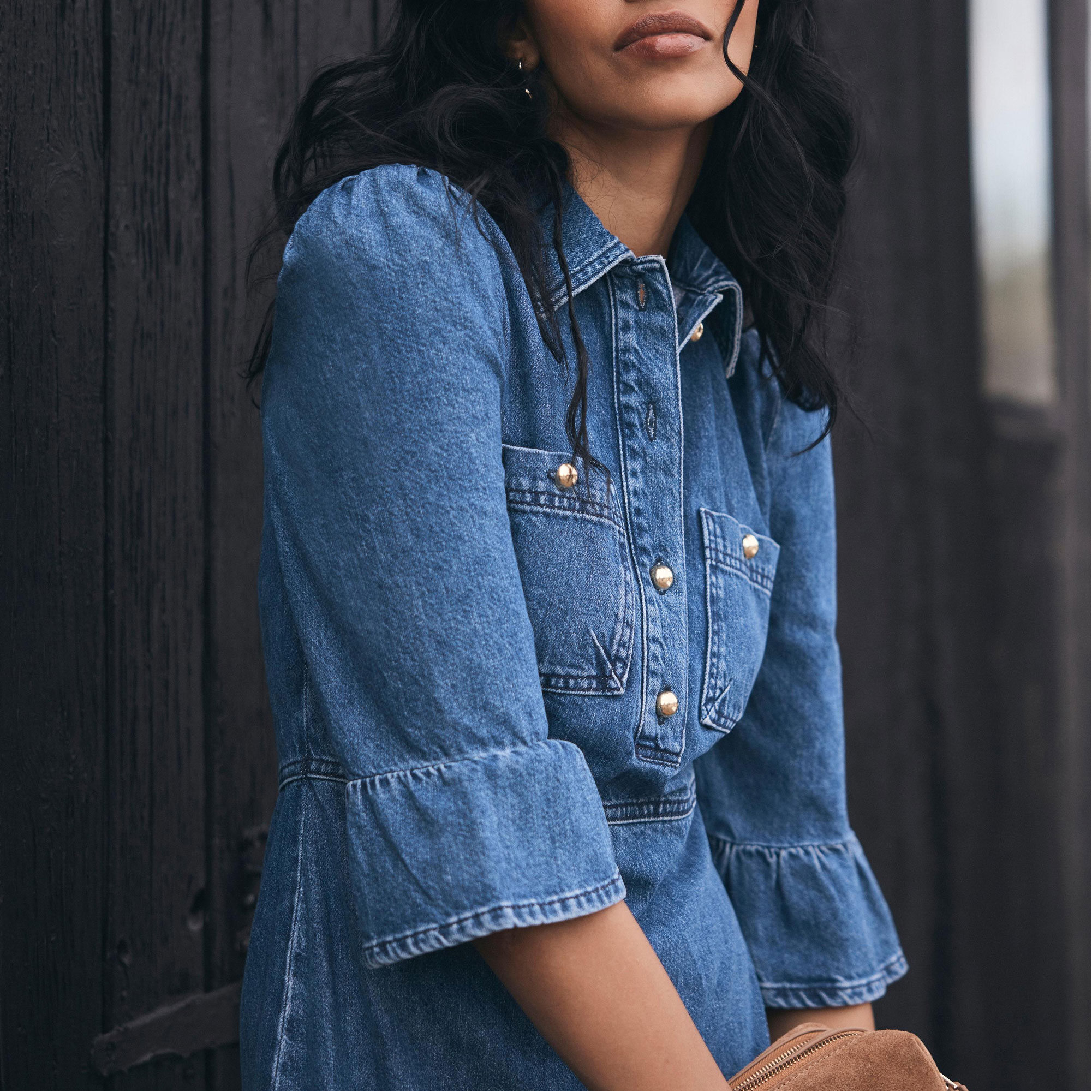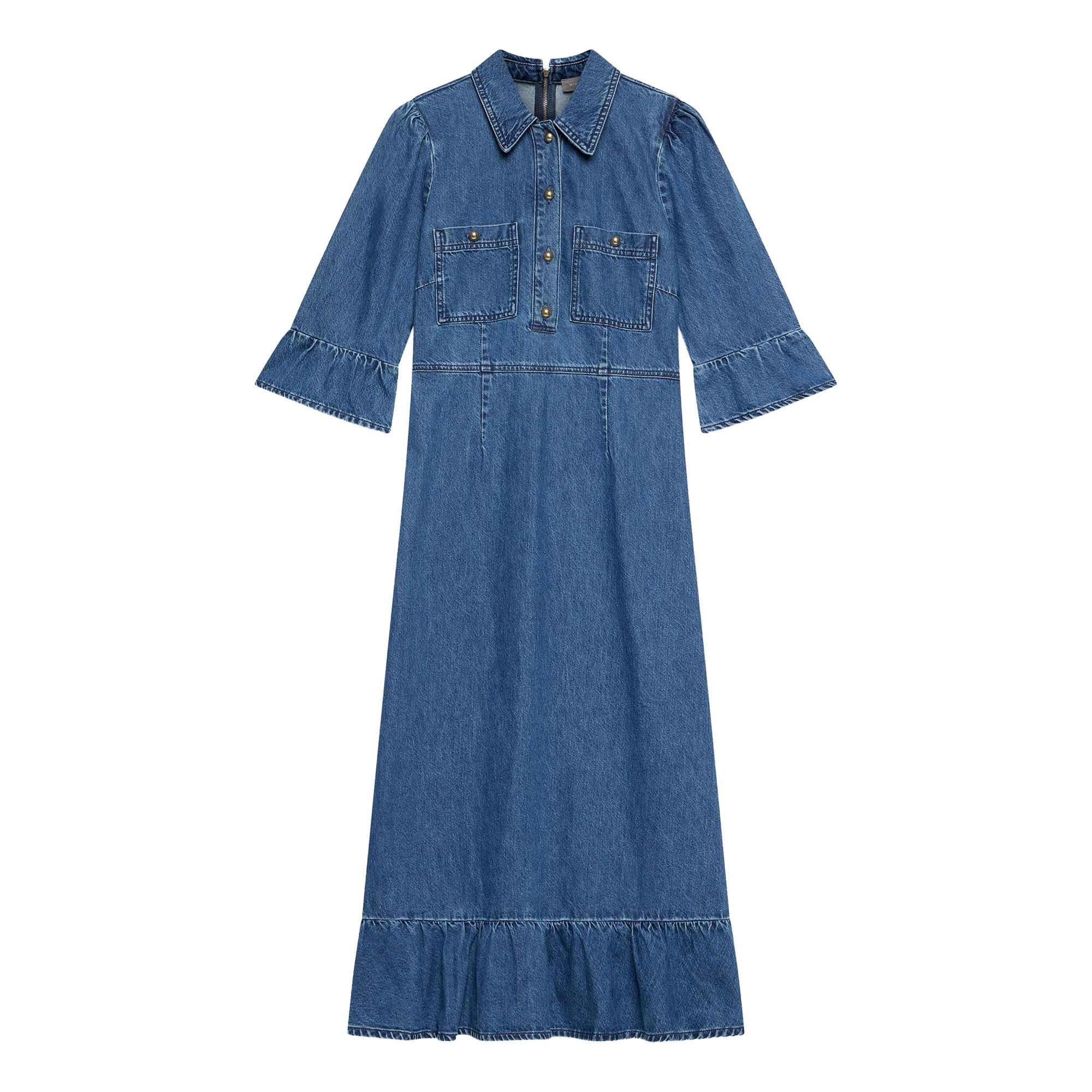 • Indigo denim, shirt silhouette, midi length, classic collar, three-quarter-length fluted sleeves, chest pockets, ruffle hemline, front button fastenings, back zip fastening