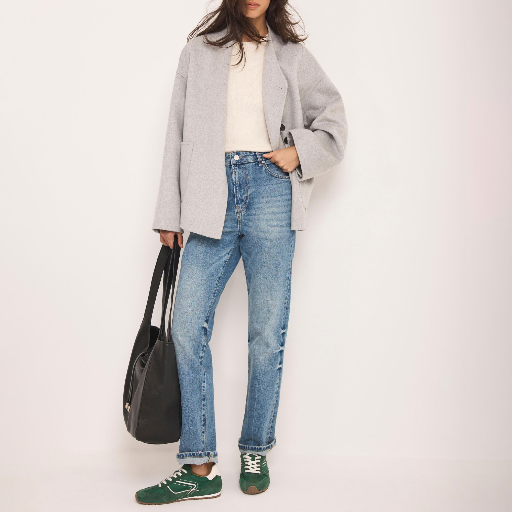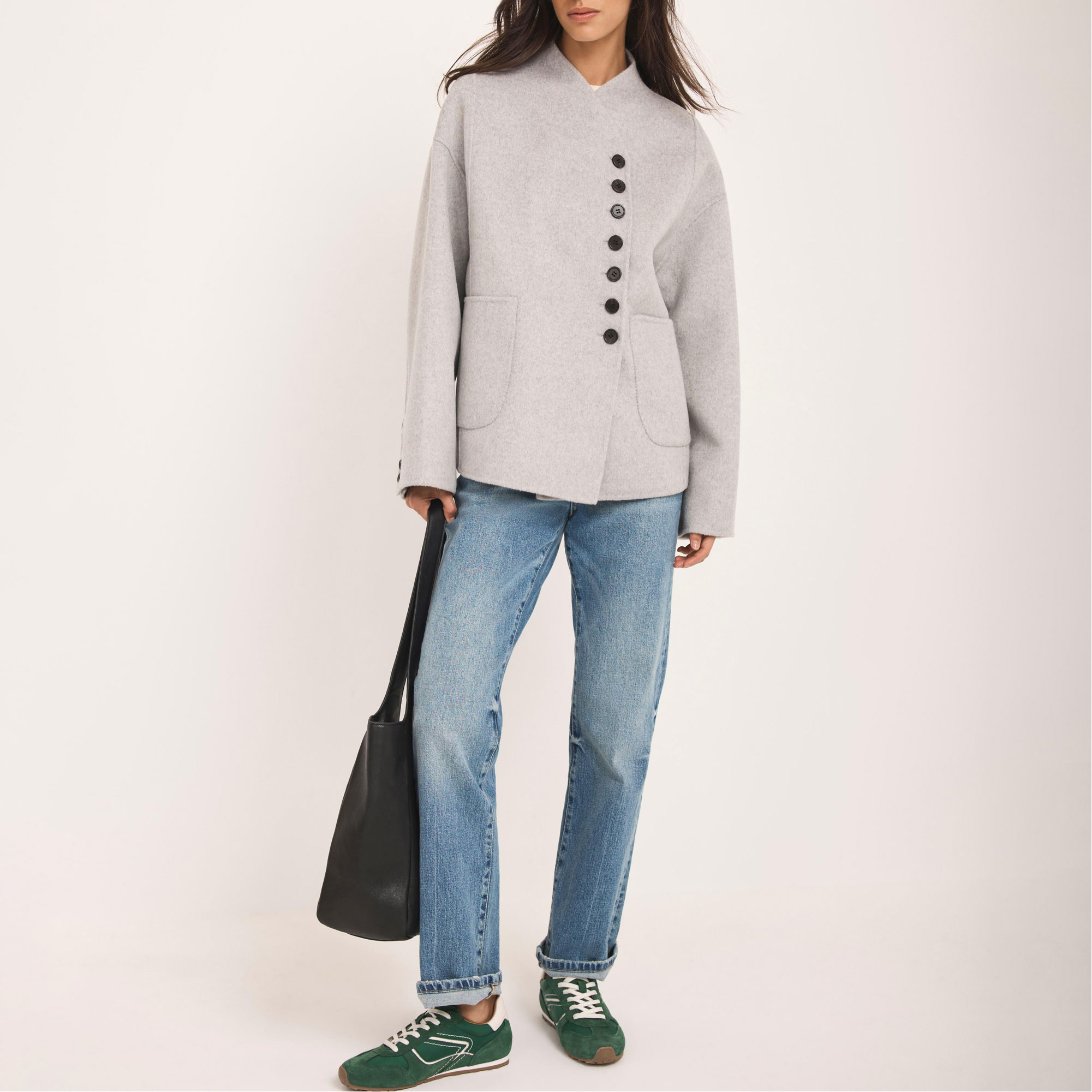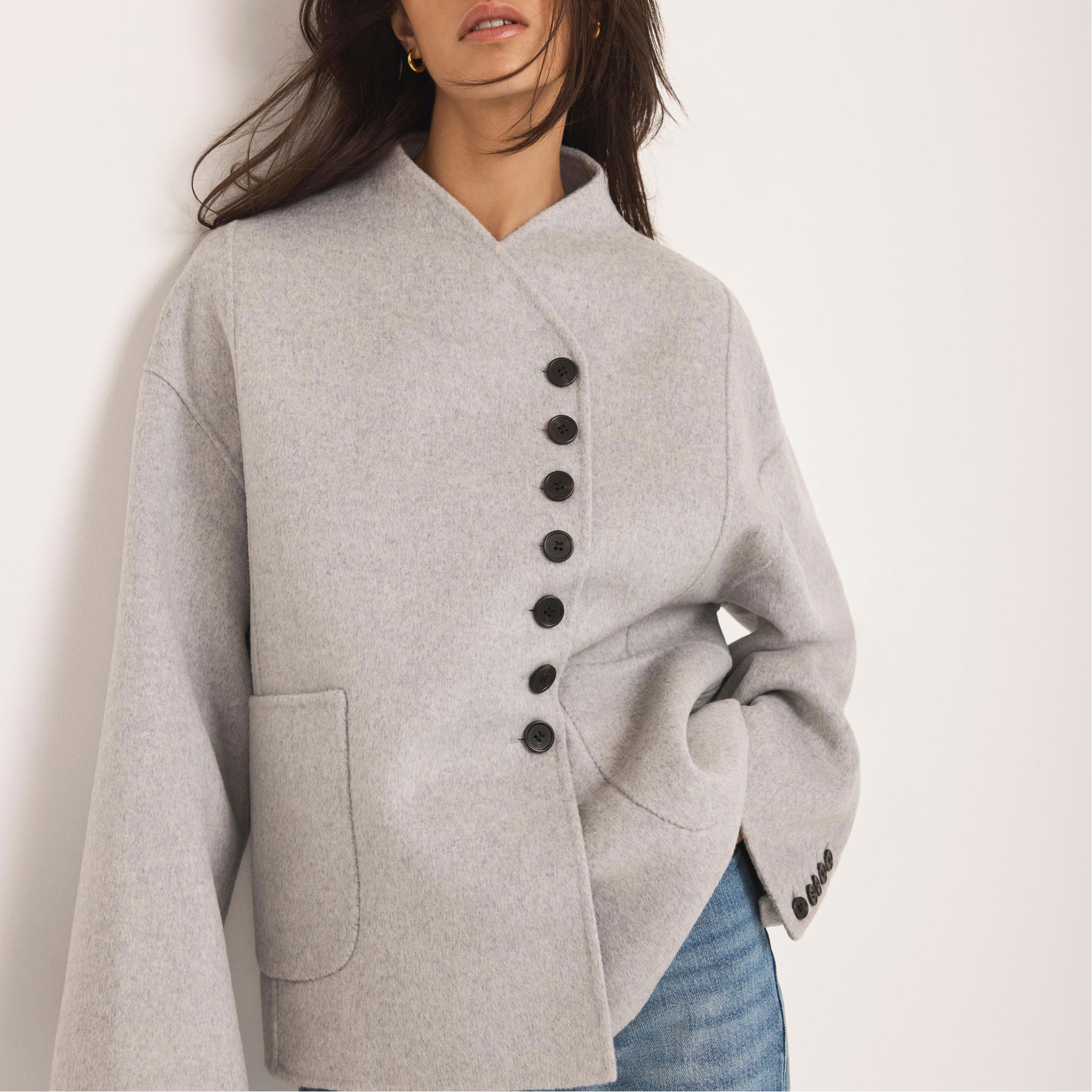 • Double-breasted silhouette, V-neckline, long wide sleeves, buttoned cuffs, side pockets, front button fastening