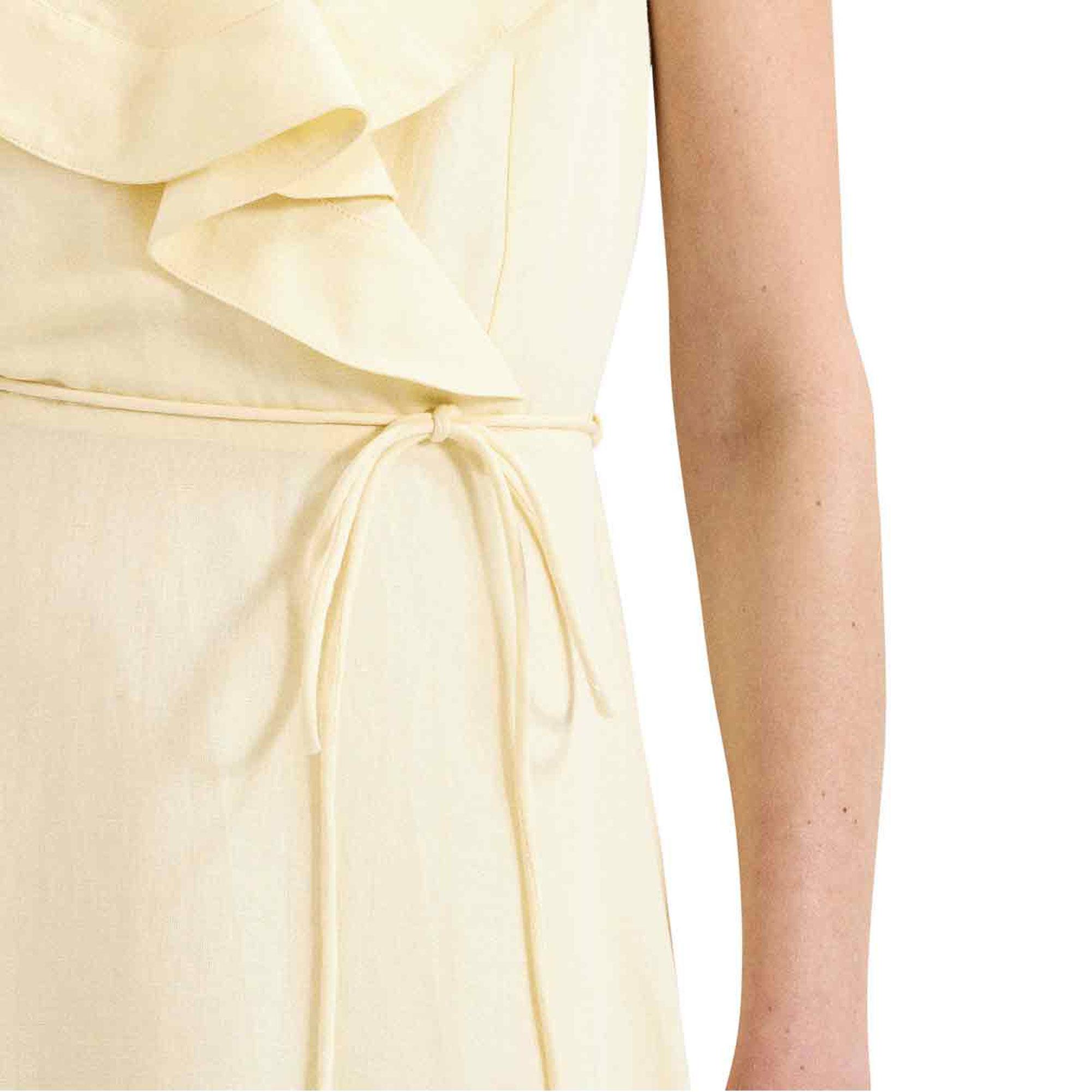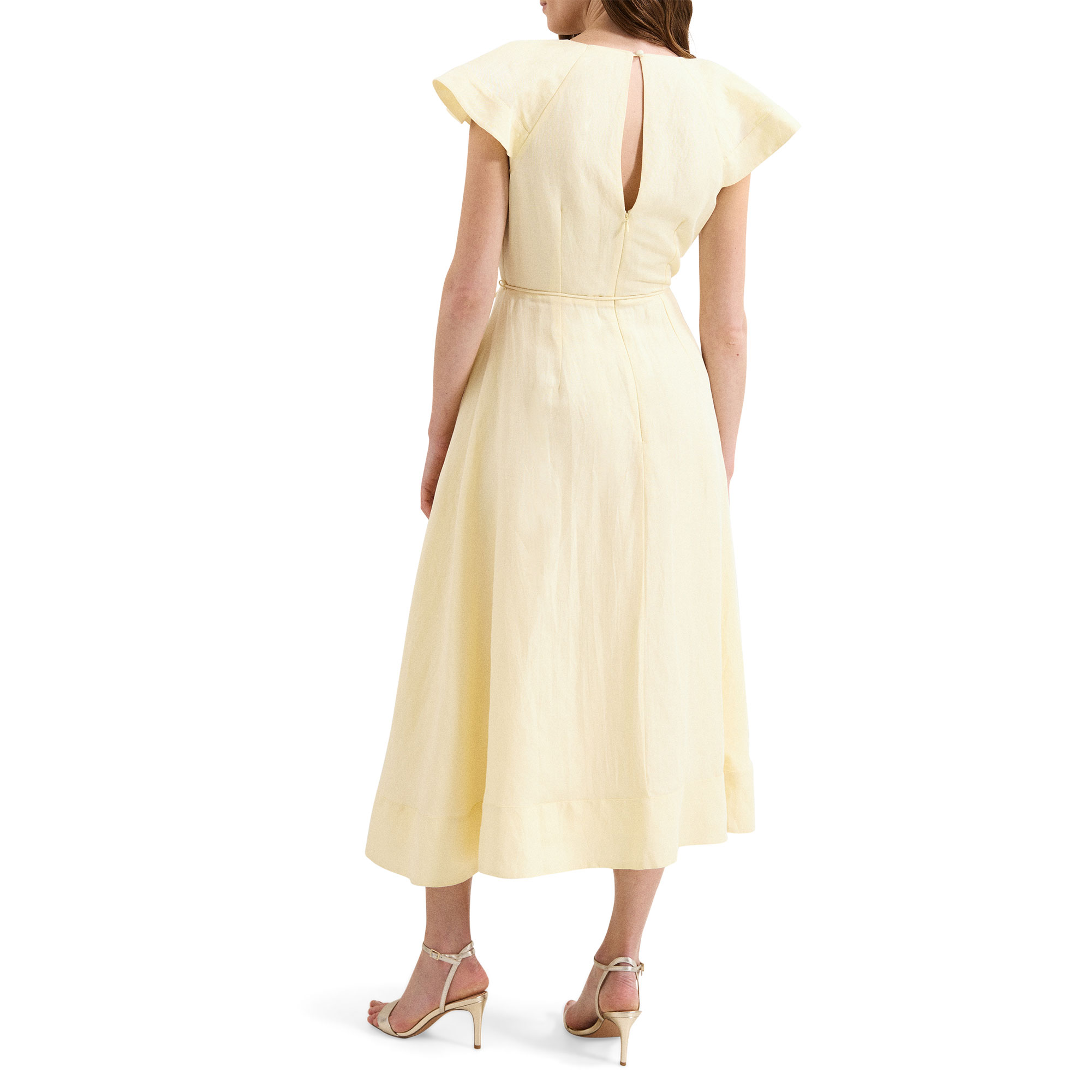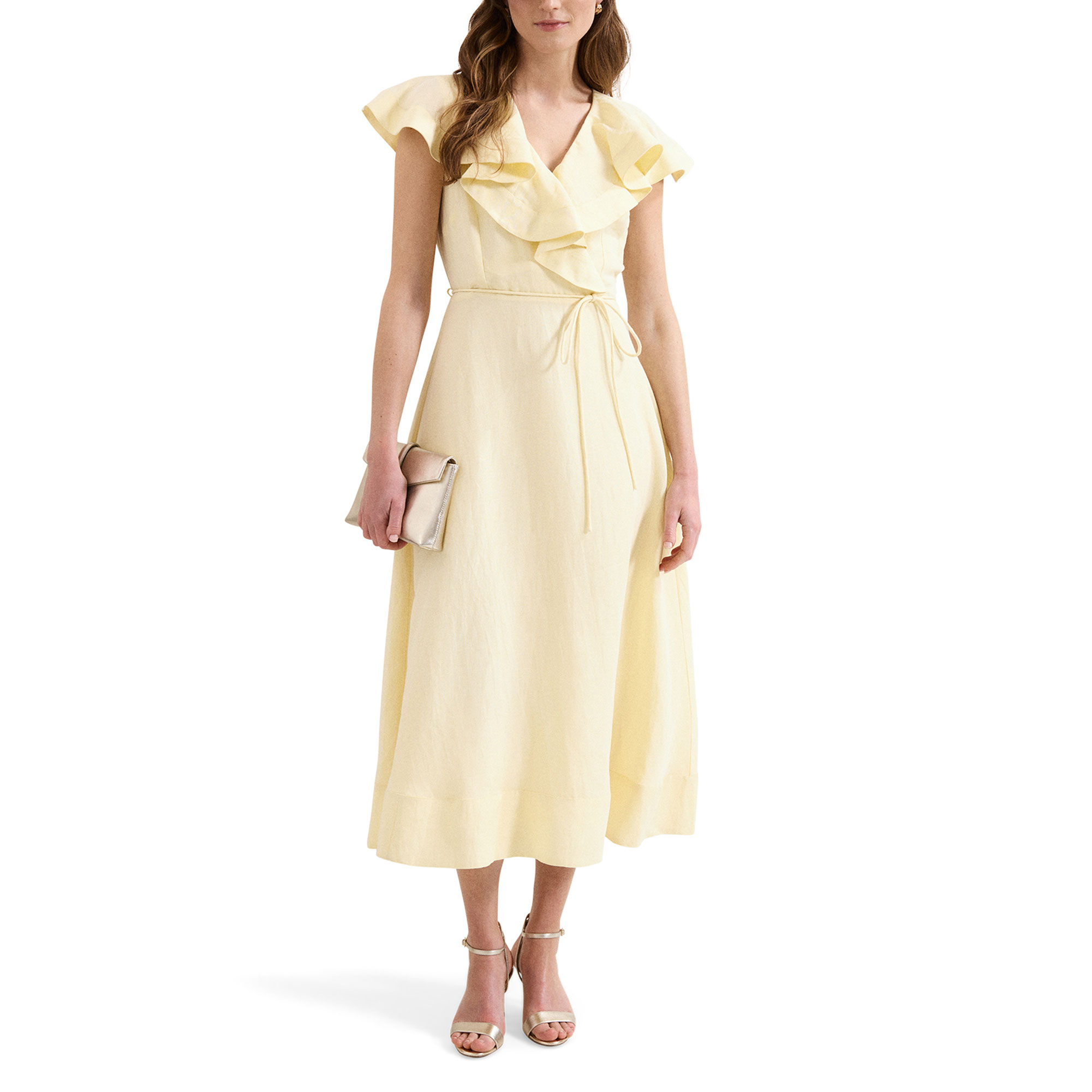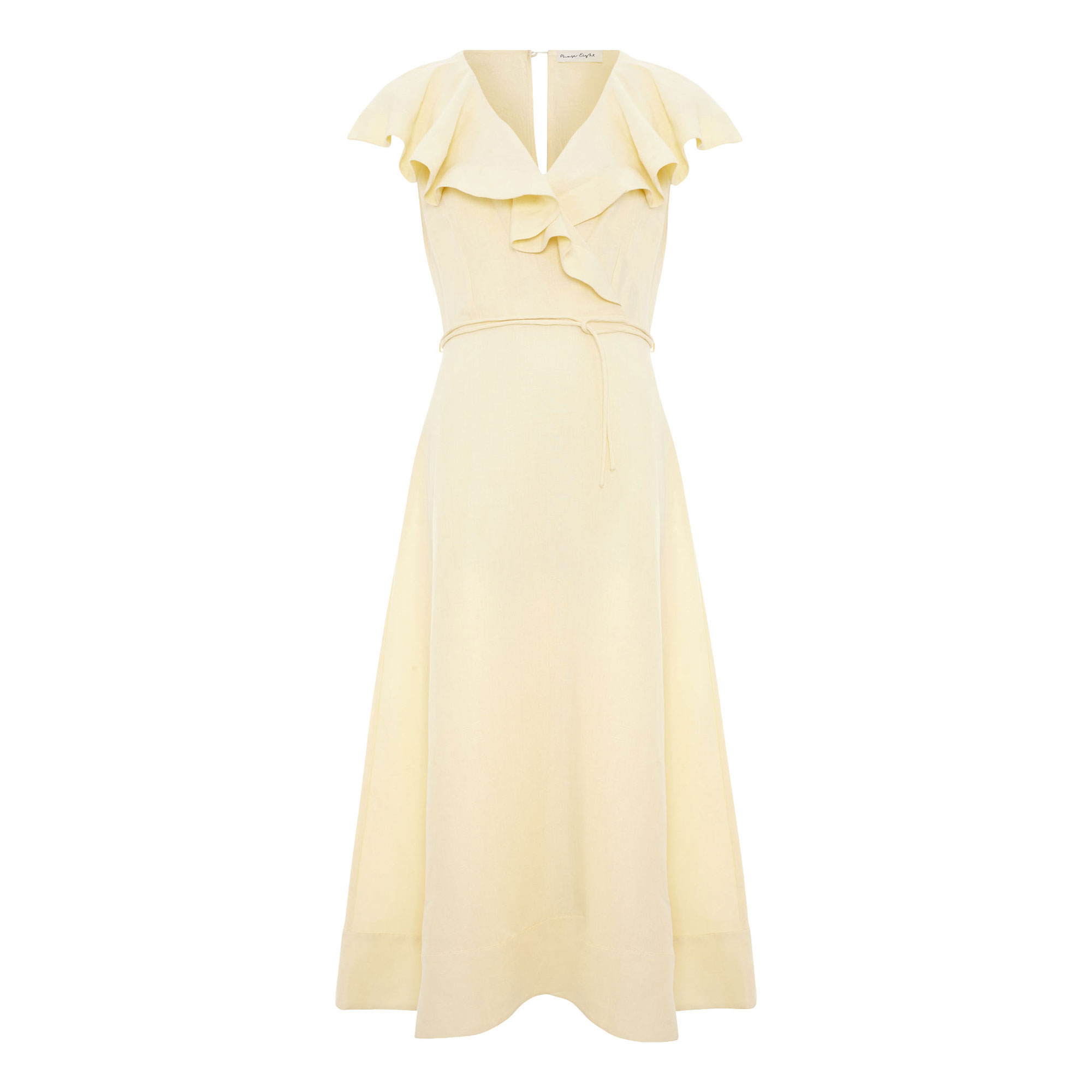 • Midi length, ruffle detailing, A-line silhouette, tie belt, concealed zip fastening, short sleeves