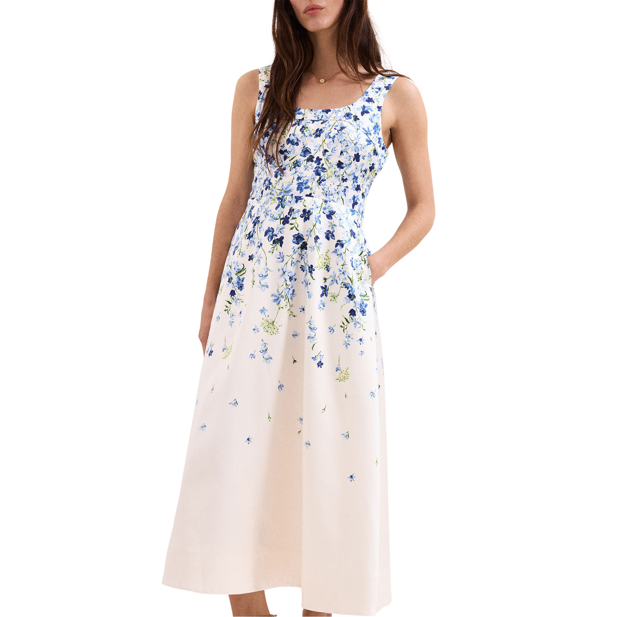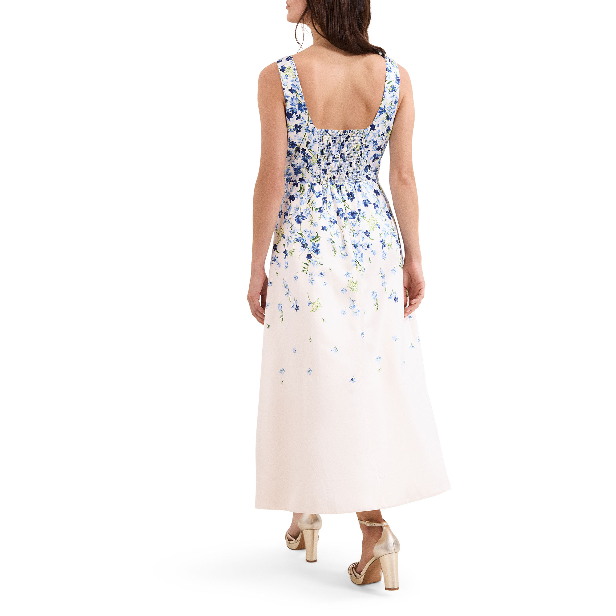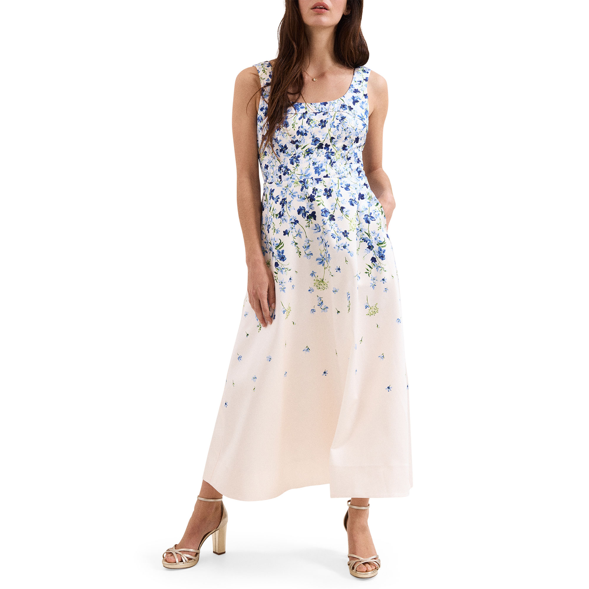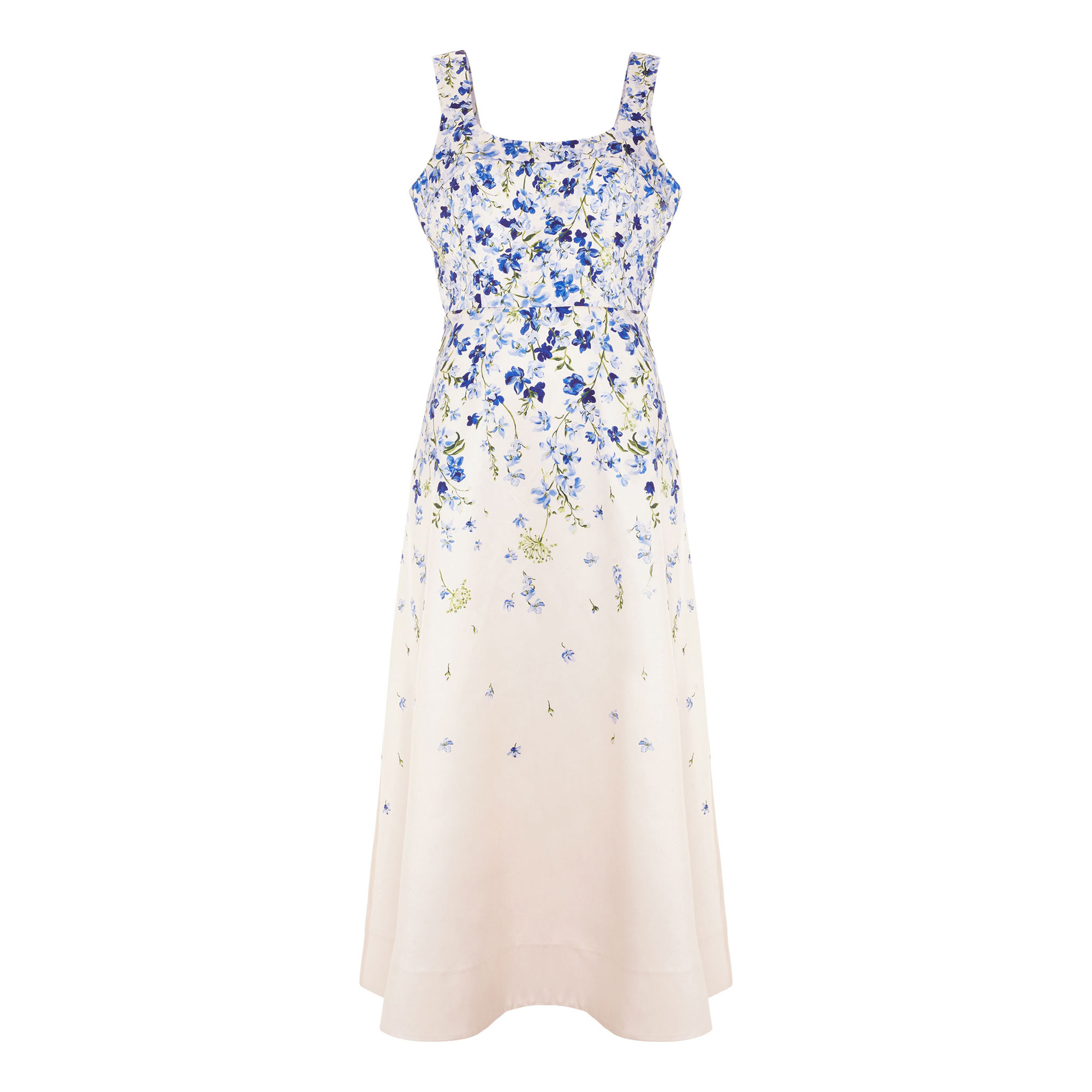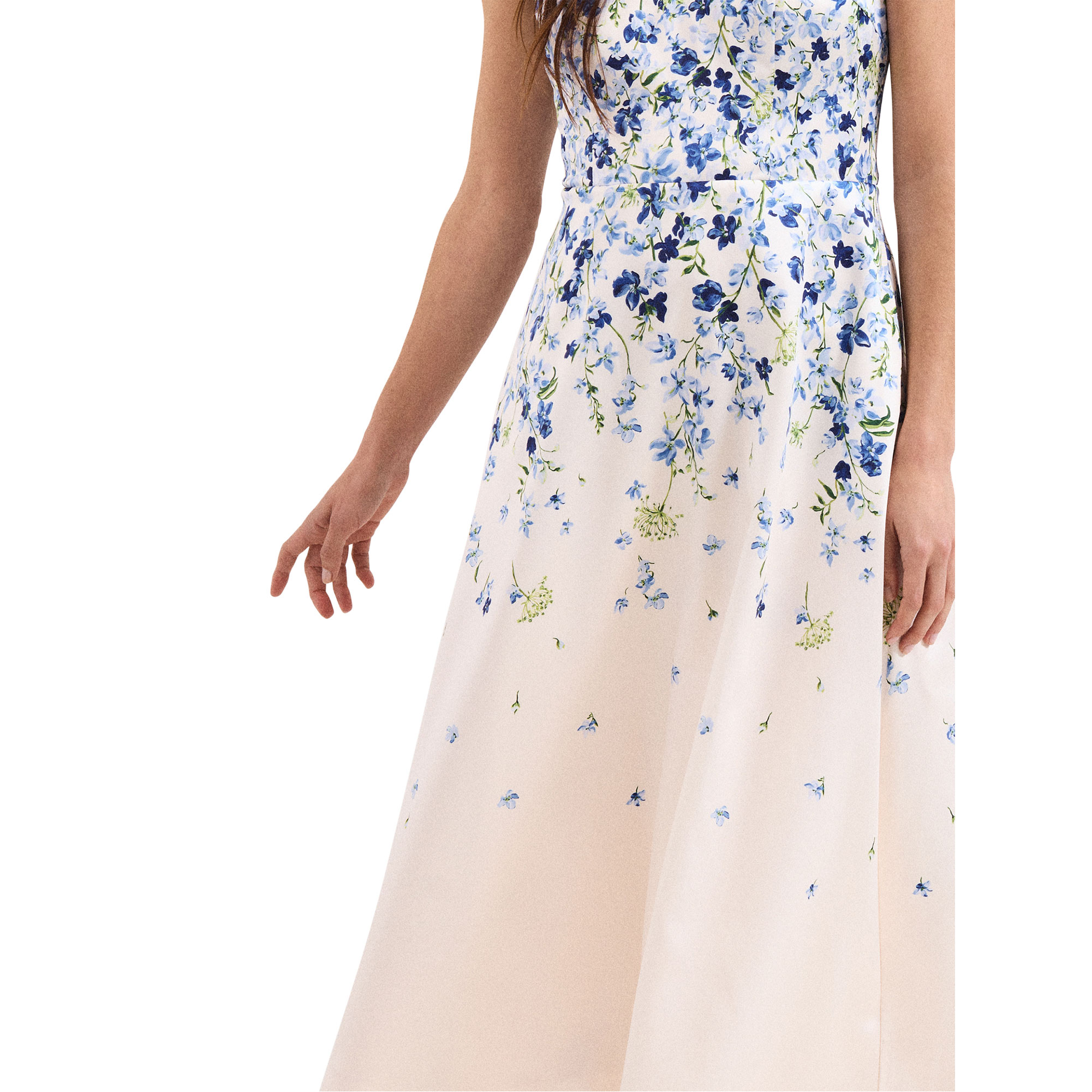 • Satin fabric, midi length, A-line silhouette, square neckline, scooped back, floral print, concealed zip fastening, sleeveless