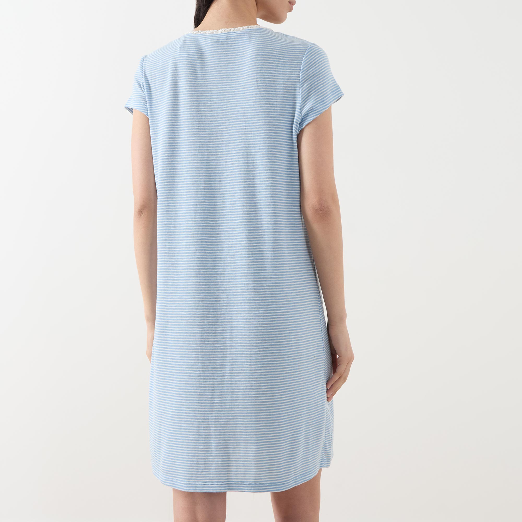 - Scoop neckline, with trim detailing, two-button placket, short sleeves, curved hem, monogram logo detail on the chest, striped pattern, mini length