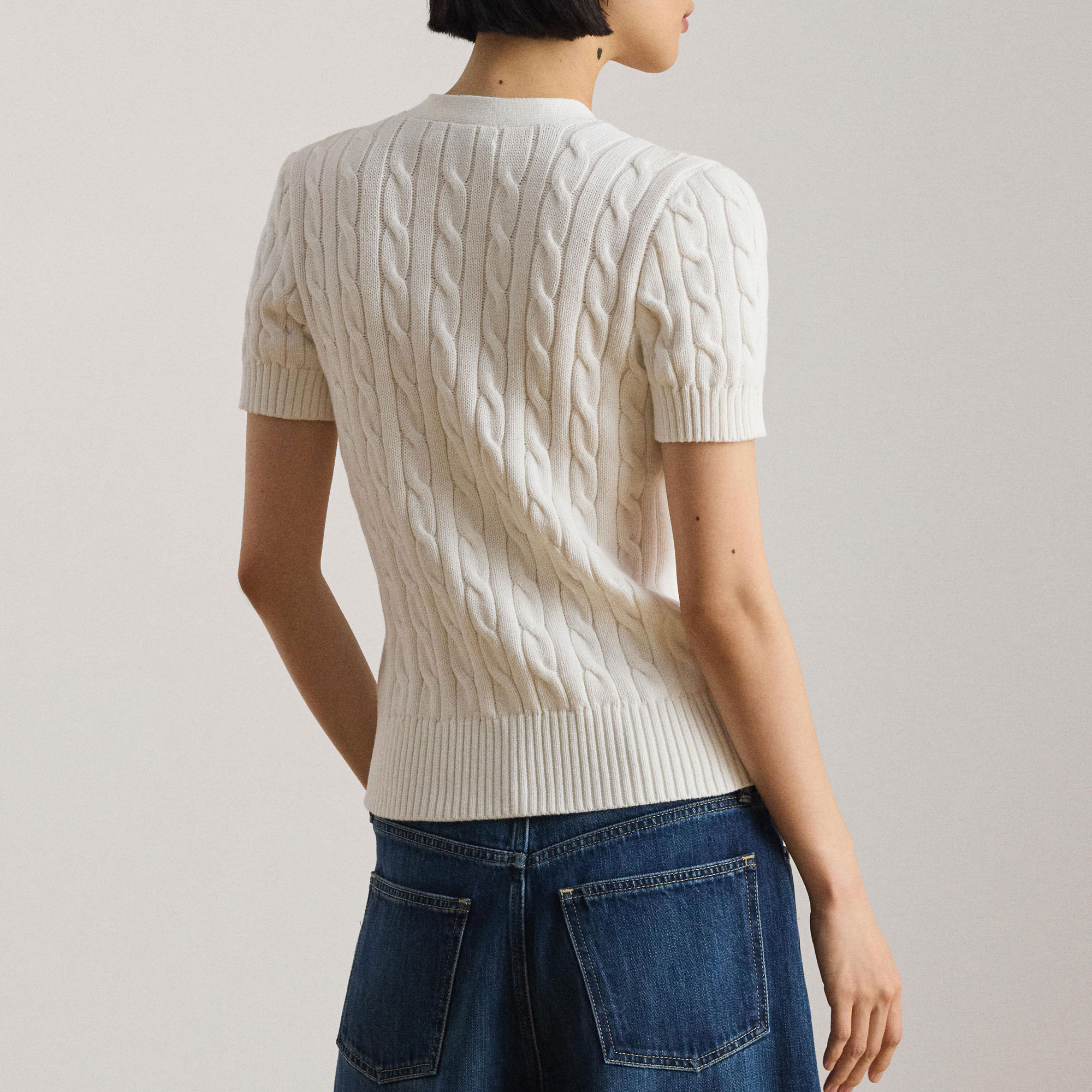 - Short sleeves, cable-knit pattern, soft feel, combed finish, embroidered script logo, V-neckline, buttoned placket, logo-engraved buttons, ribbed trims