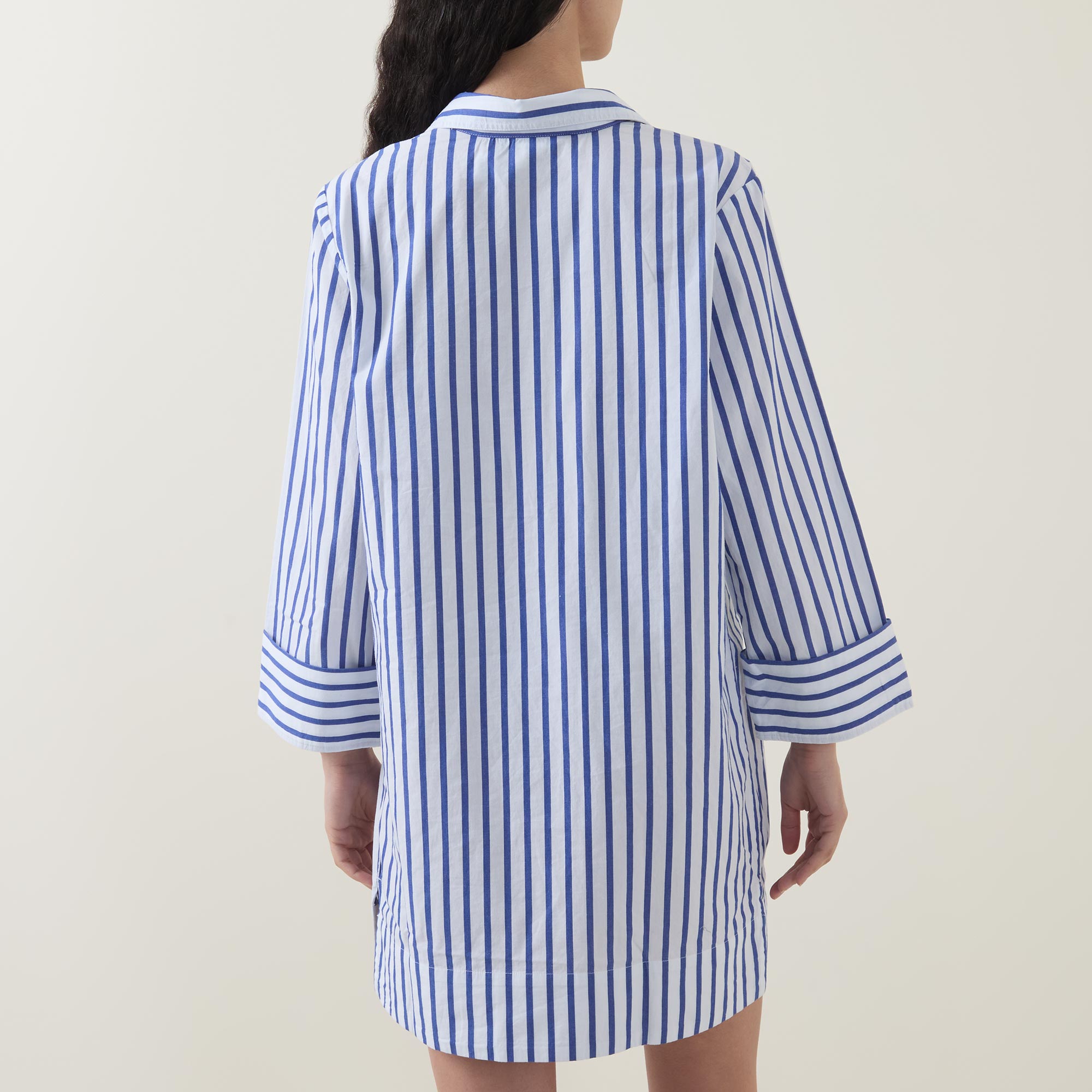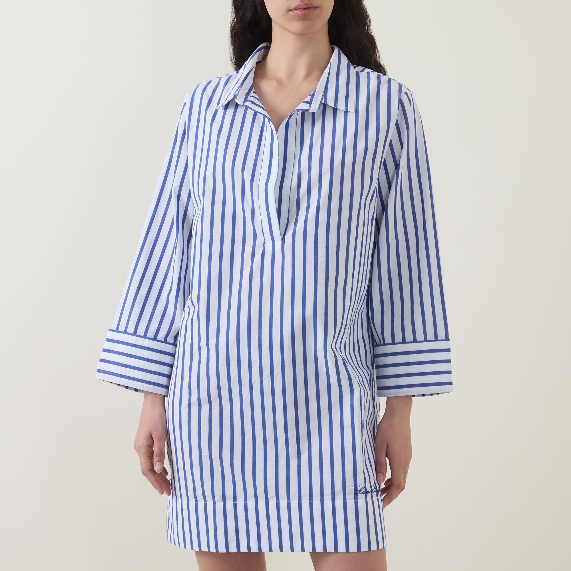 - Shirt collar, V-neckline, bracelet-length sleeves, turn-up cuffs, curved hem, embroidered logo detail, striped pattern, mini length