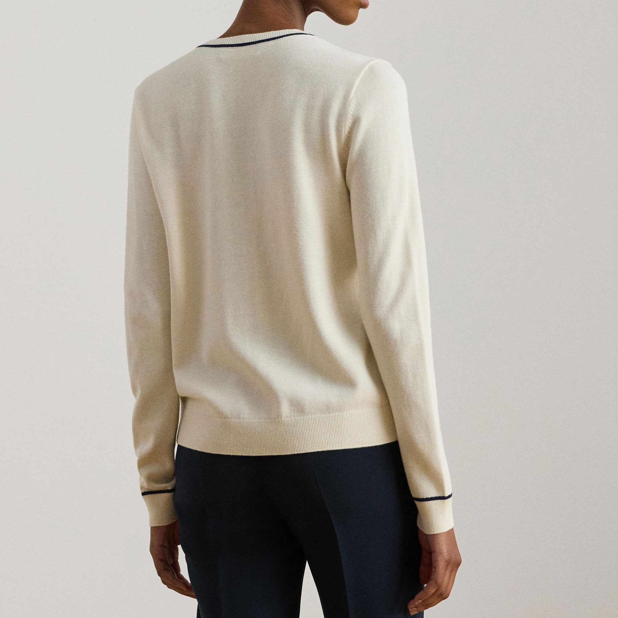 • Ribbed crew neckline, buttoned placket, logo buttons, long sleeves, ribbed cuffs, script logo embroidery, ribbed hem, knitted, striped trim