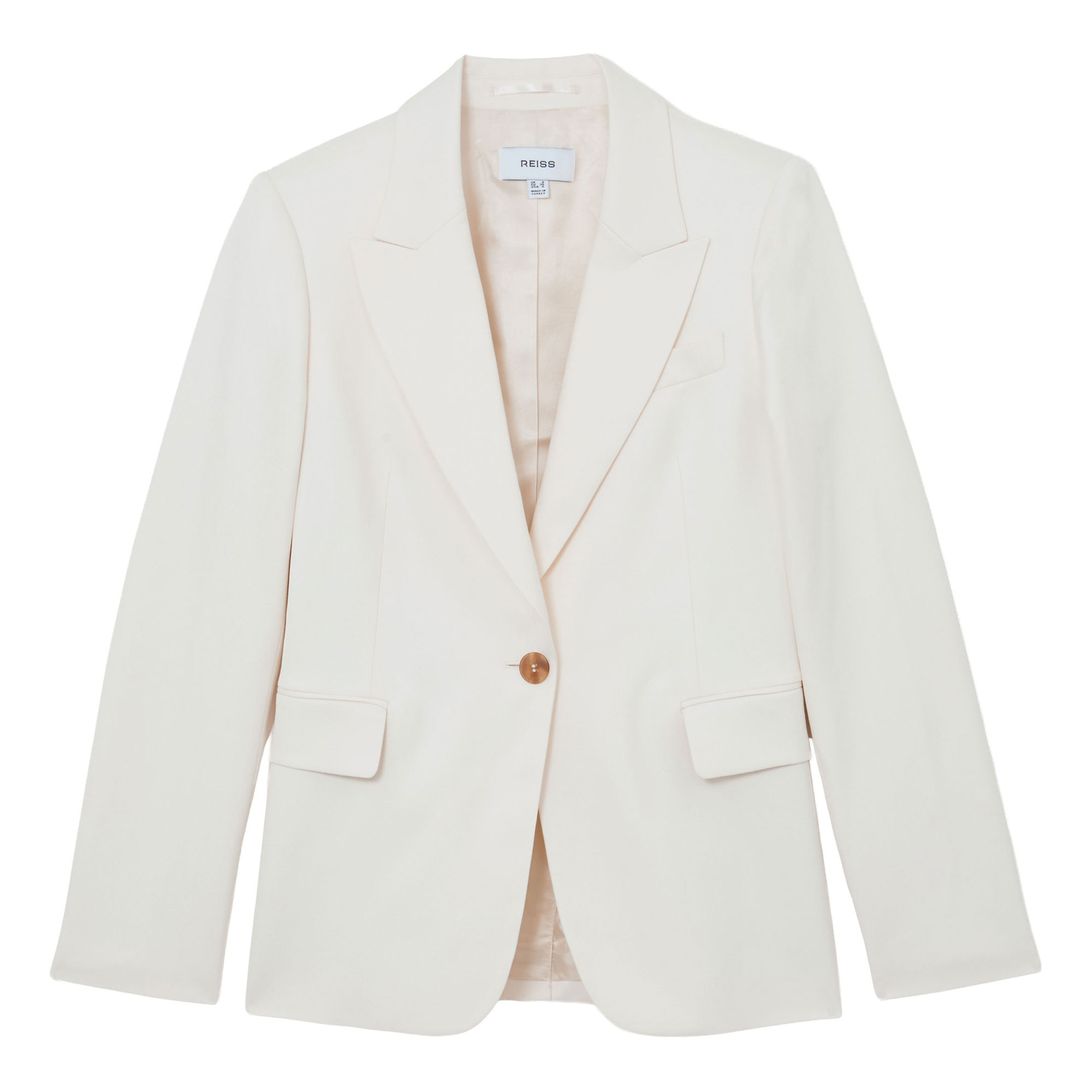 • Single-breasted silhouette, peak lapels, flap welt pockets, buttons, woven fabrication, chest welt pocket, full lining, button cuffs