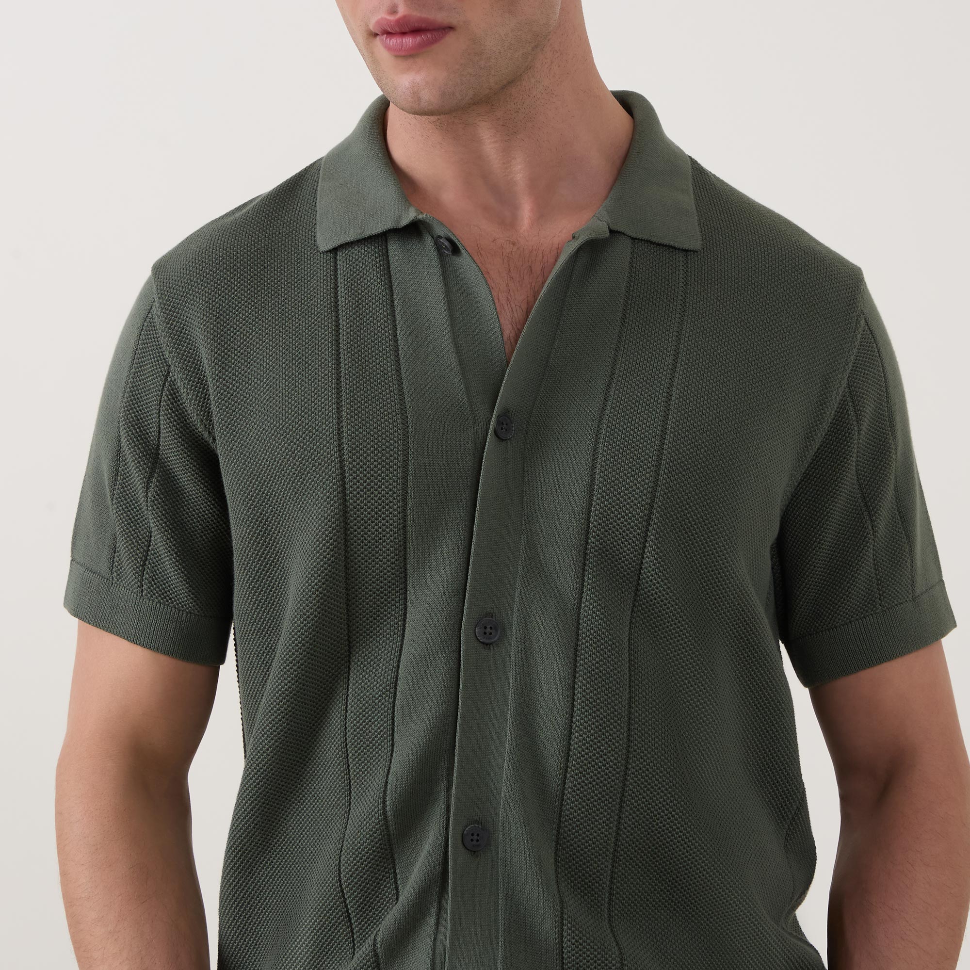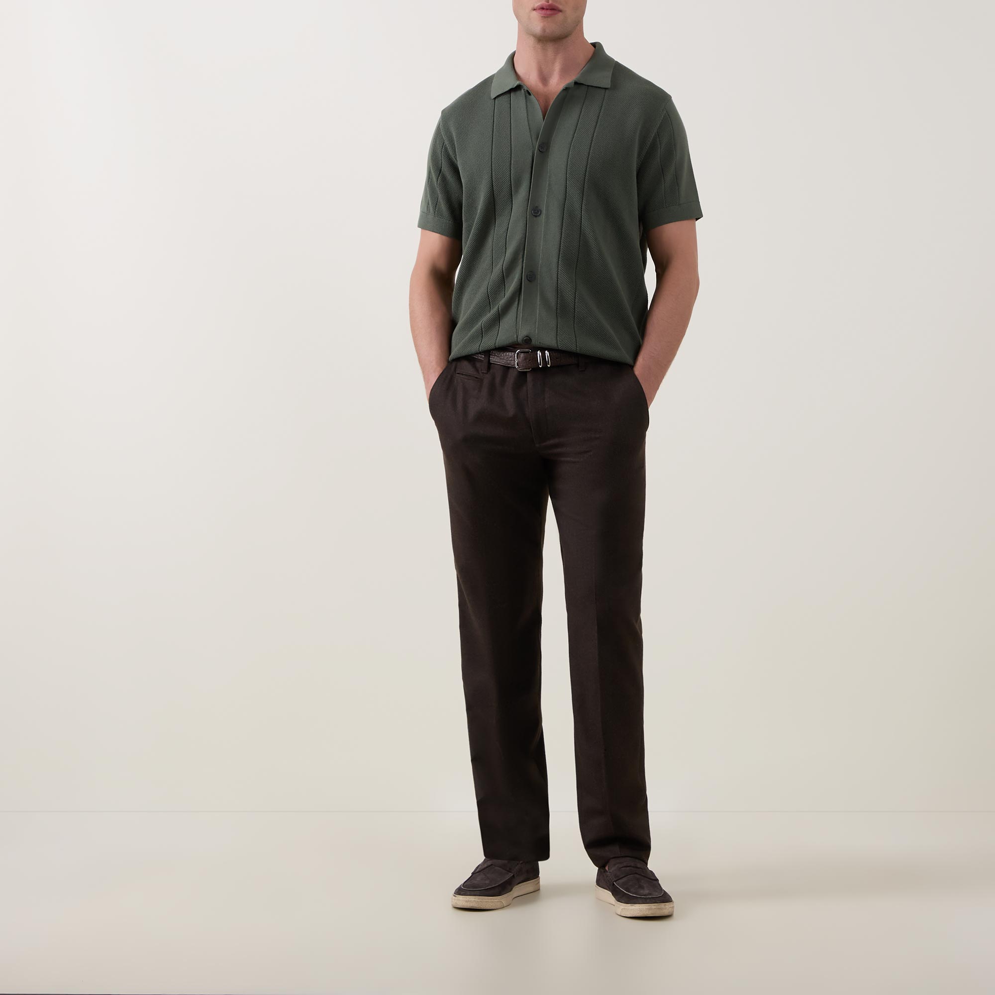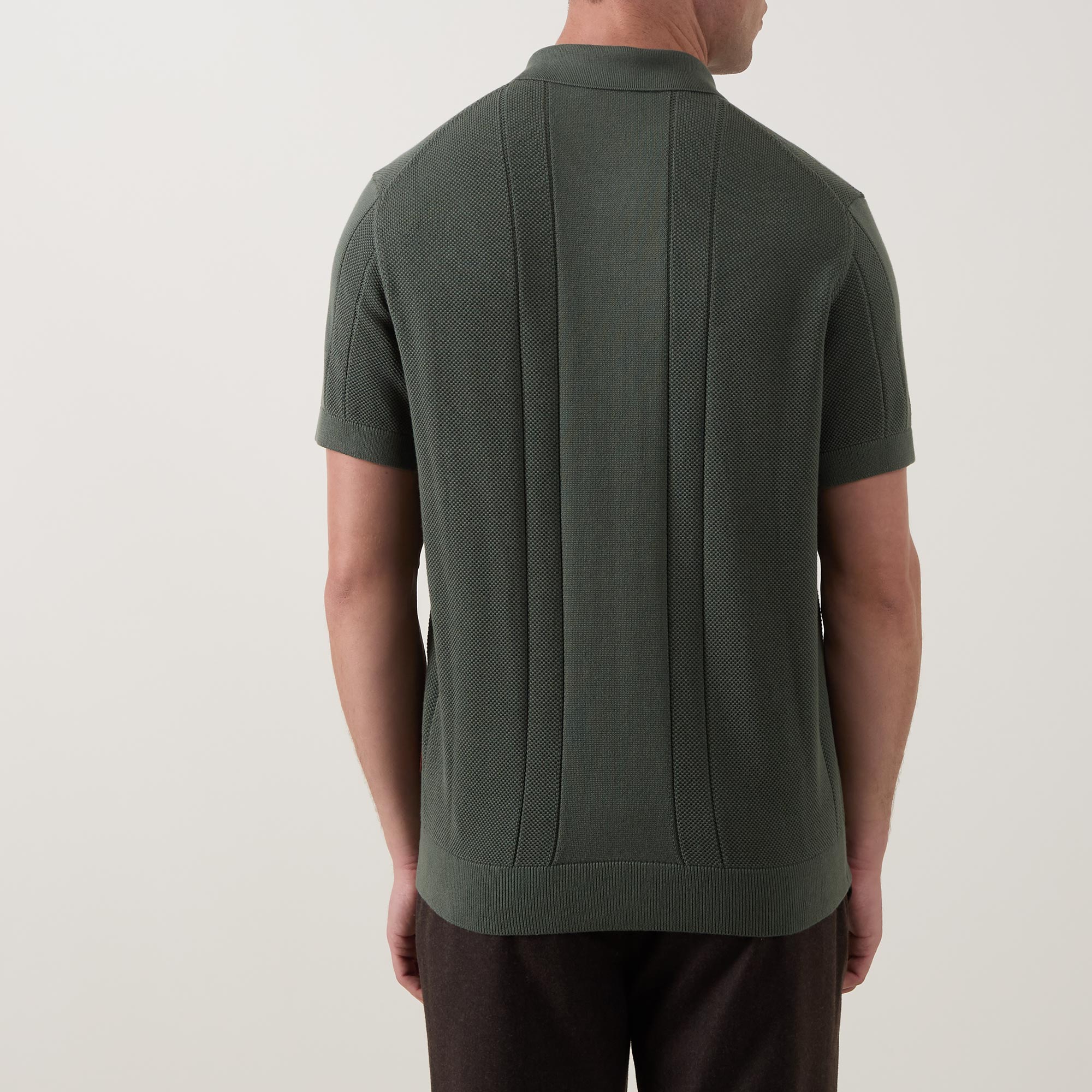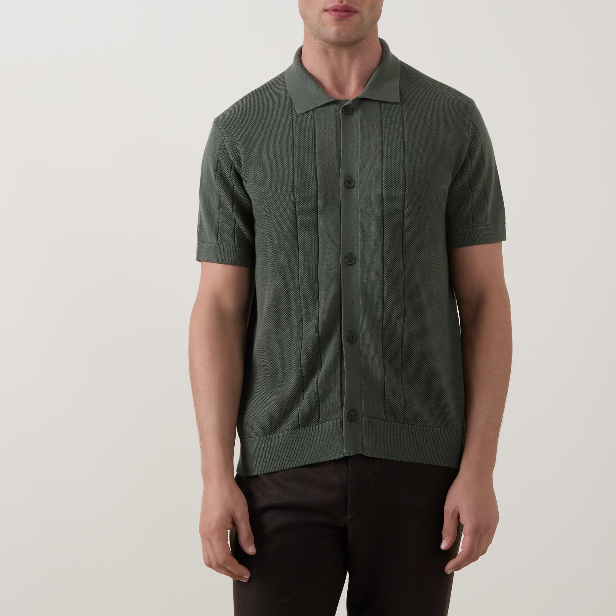 - Polo collar, short sleeves, button fastenings, straight hemline, knitted