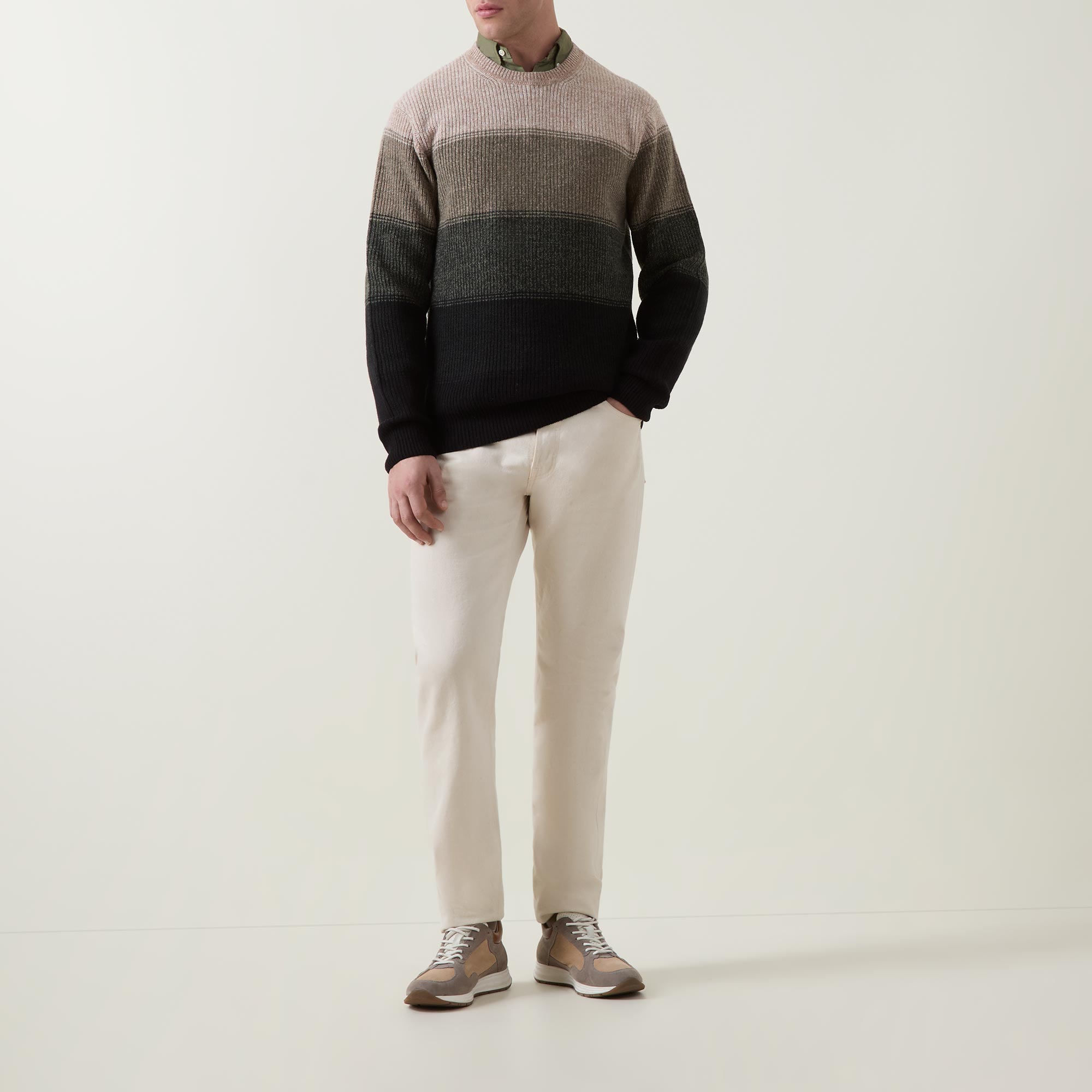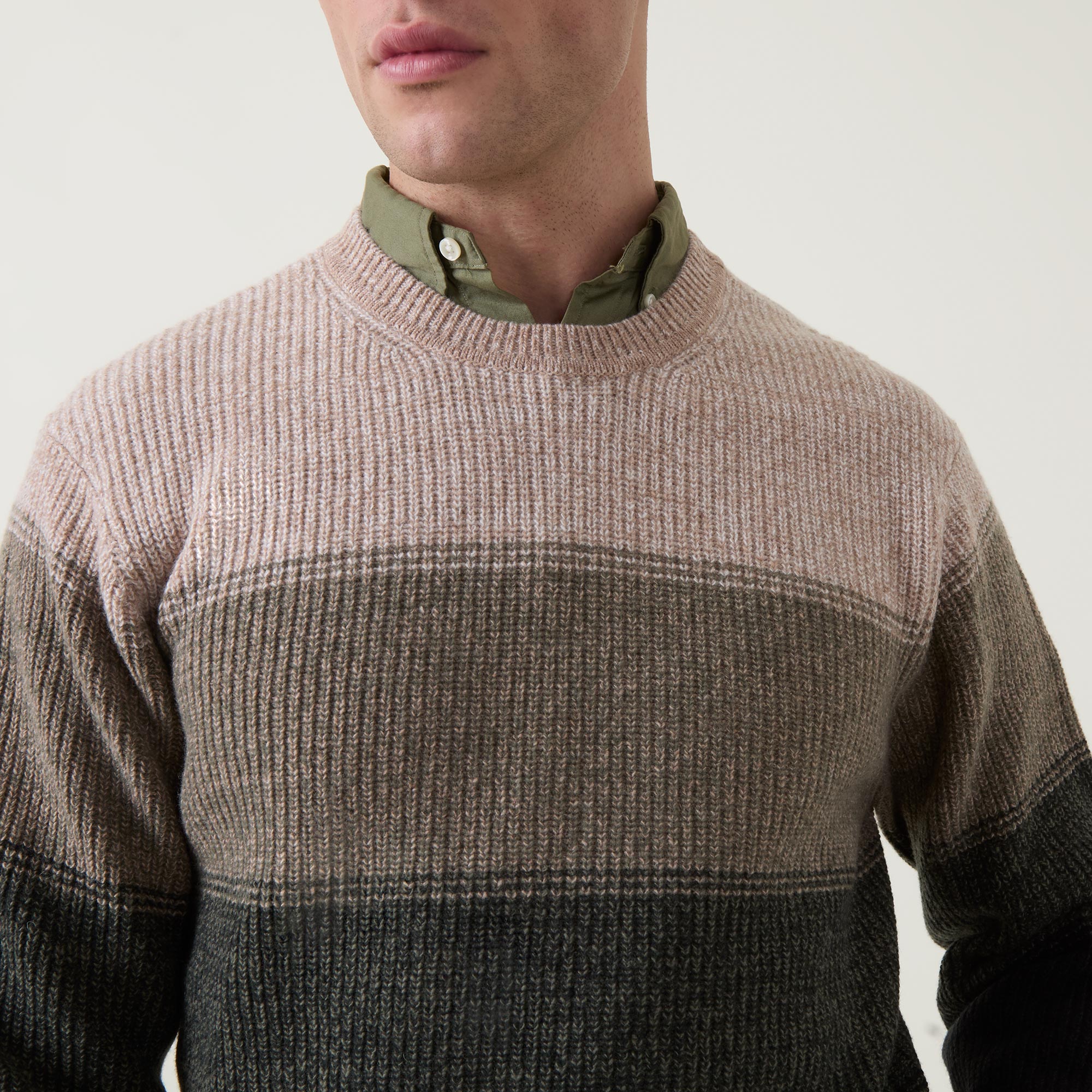 - Crew neck, dropped shoulders, long sleeves, straight hem, elasticated trims, chunky knit construction, ribbed design, colour-blocked pattern, soft finish