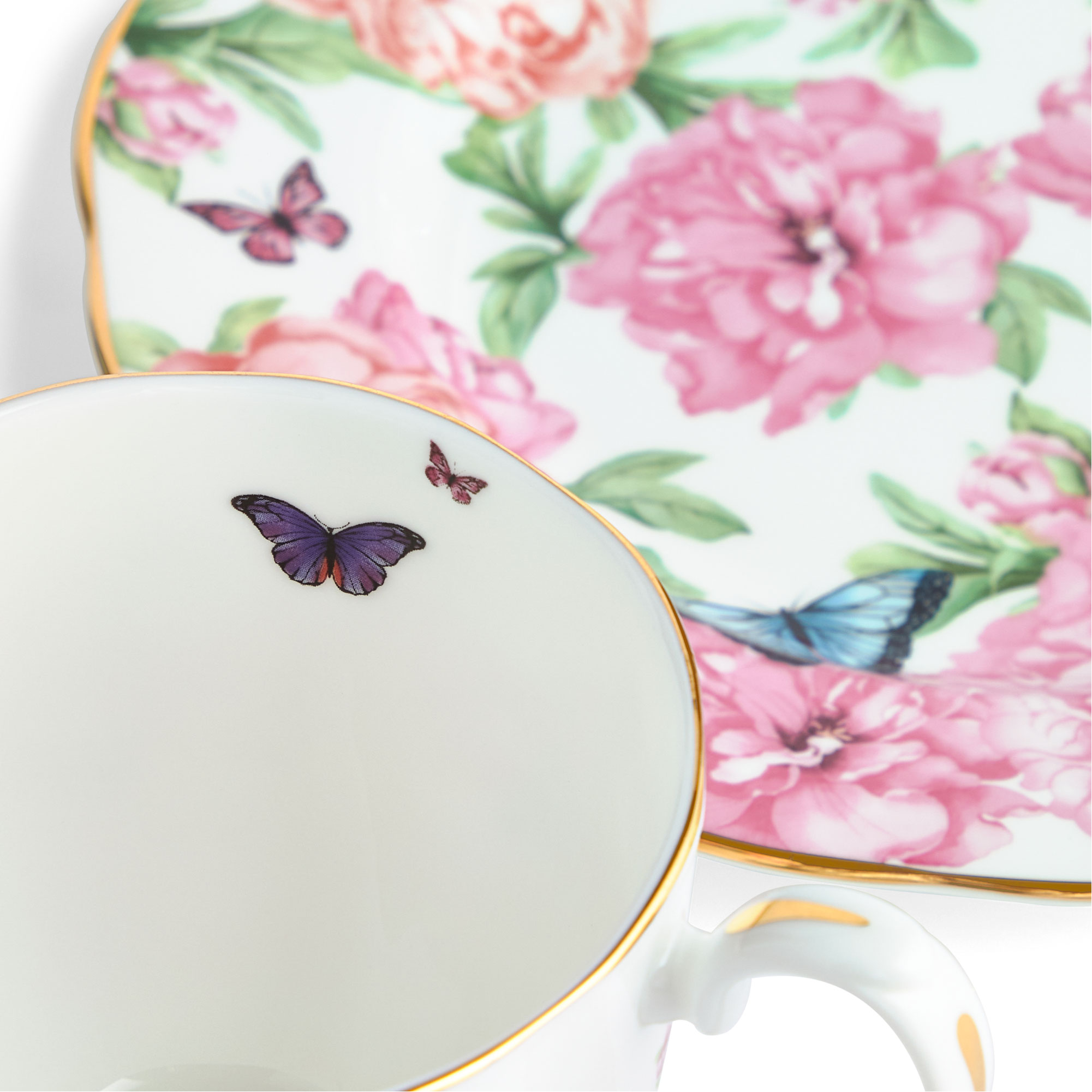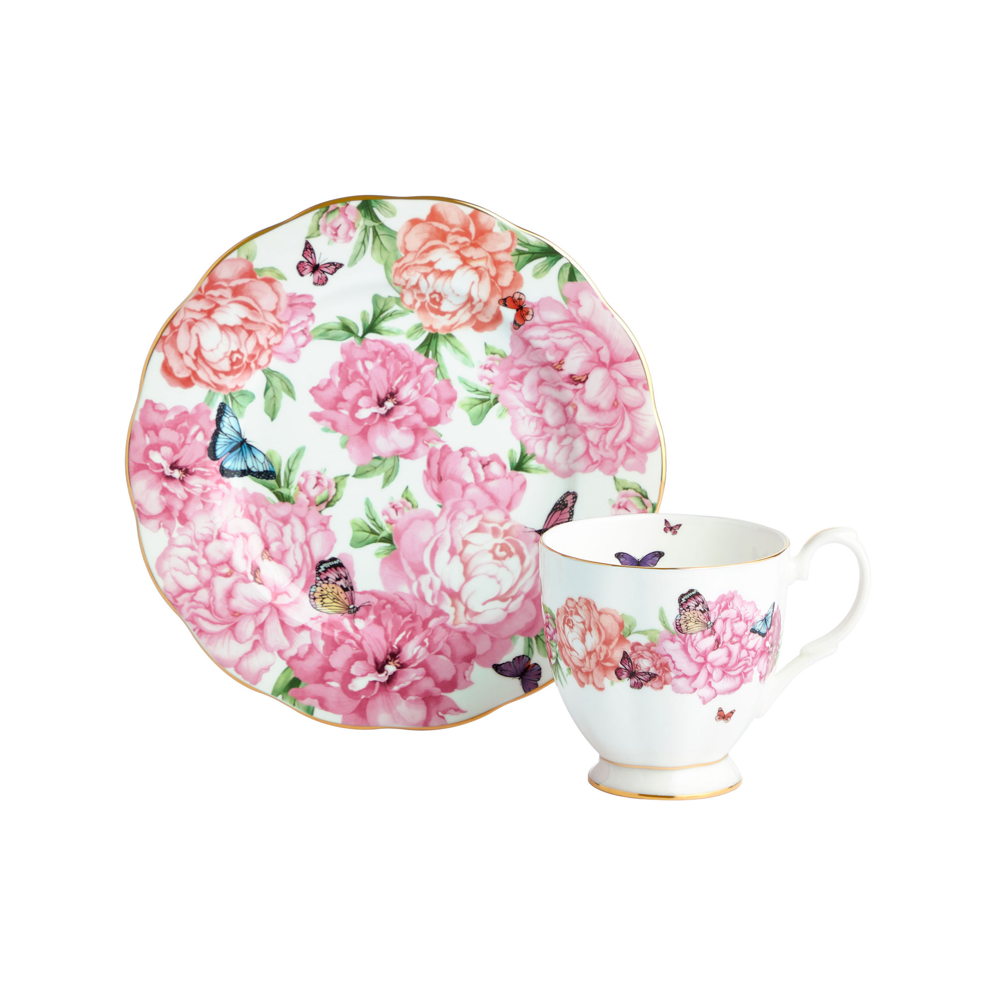- Mug and plate set, fine bone china, gold-tone lining, floral pattern