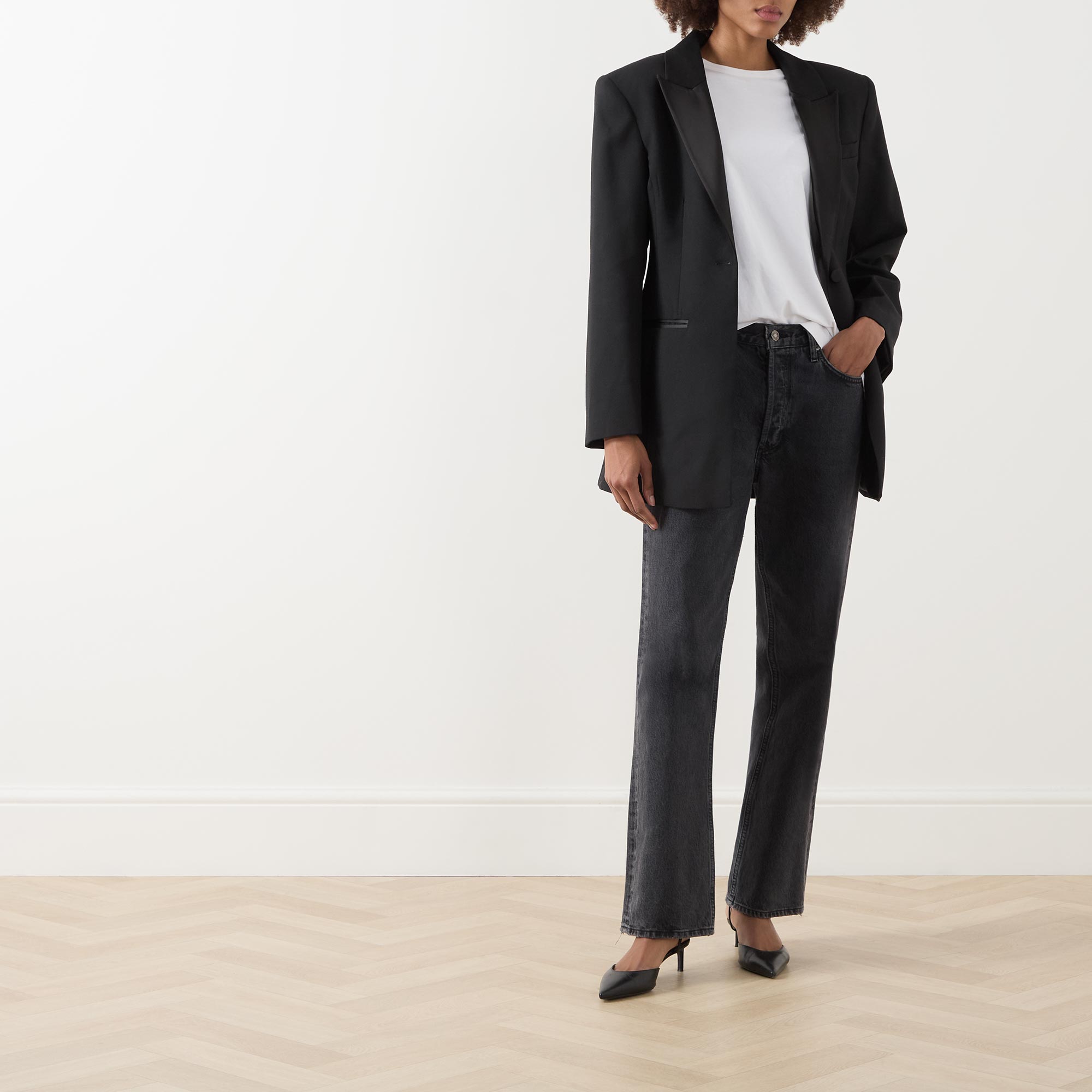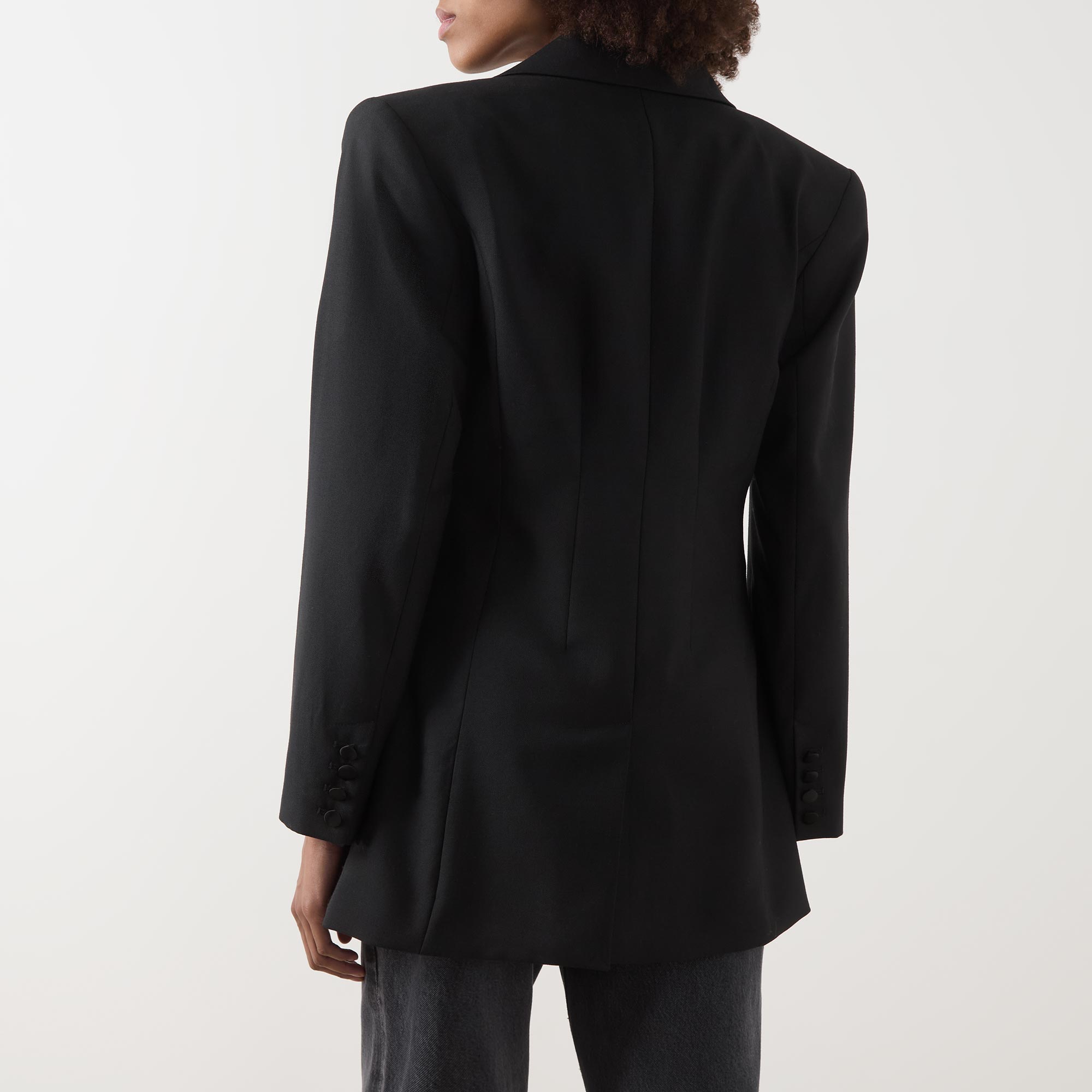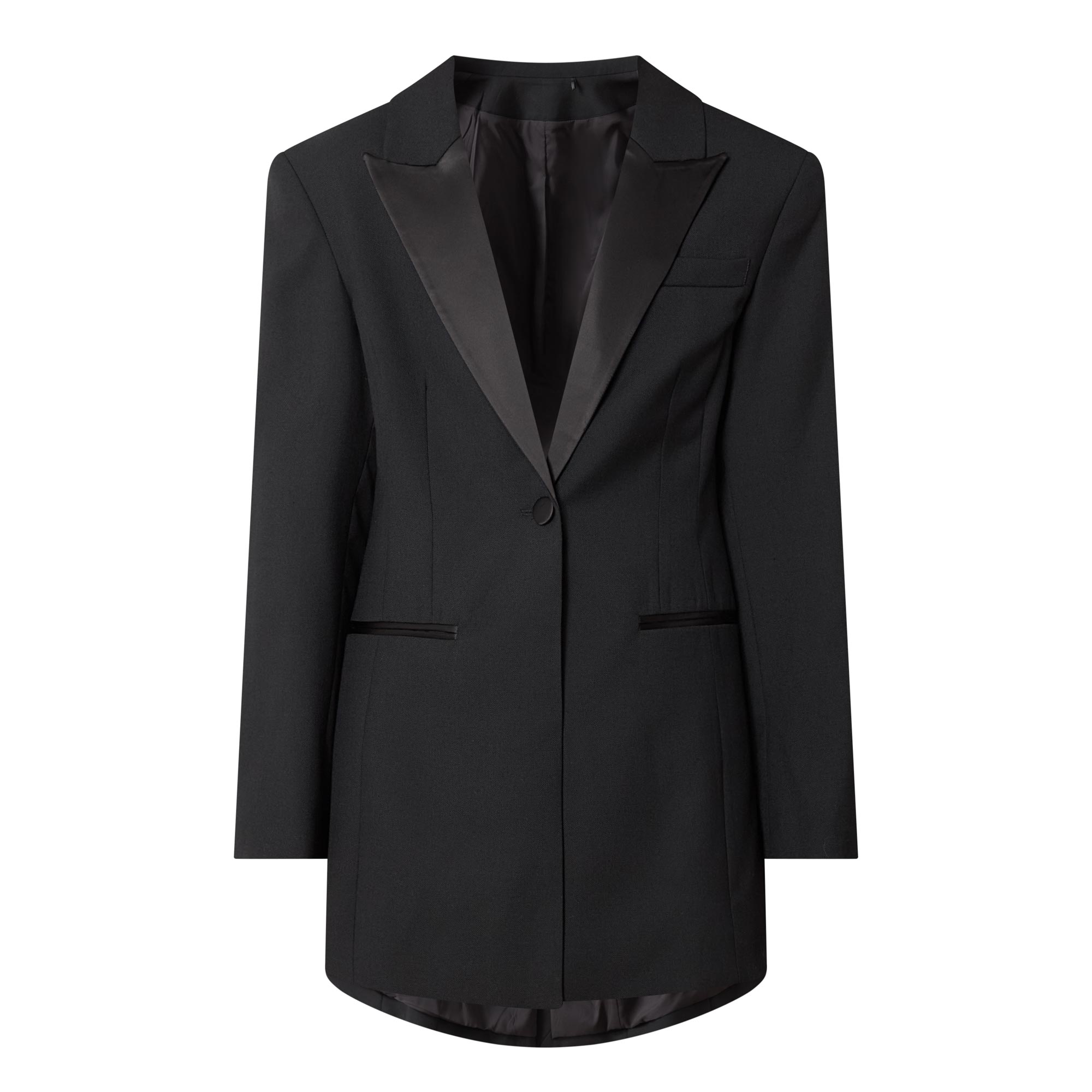 - Single breasted, peak lapel collar in a satin finish, long sleeves, buttoned cuffs, front button fastening, two front welt pockets, darting throughout, straight hem