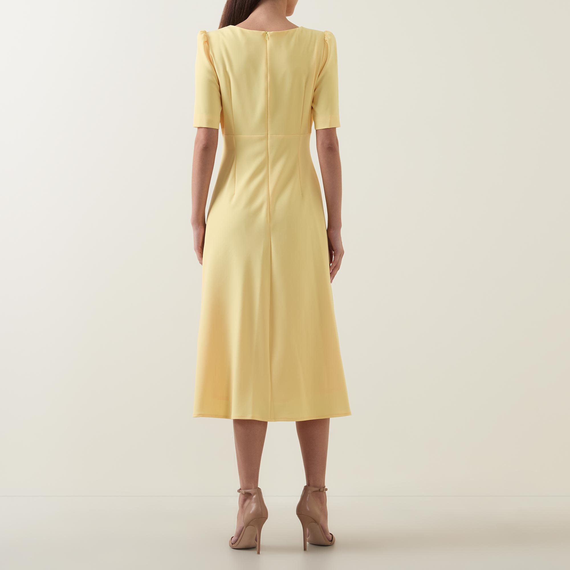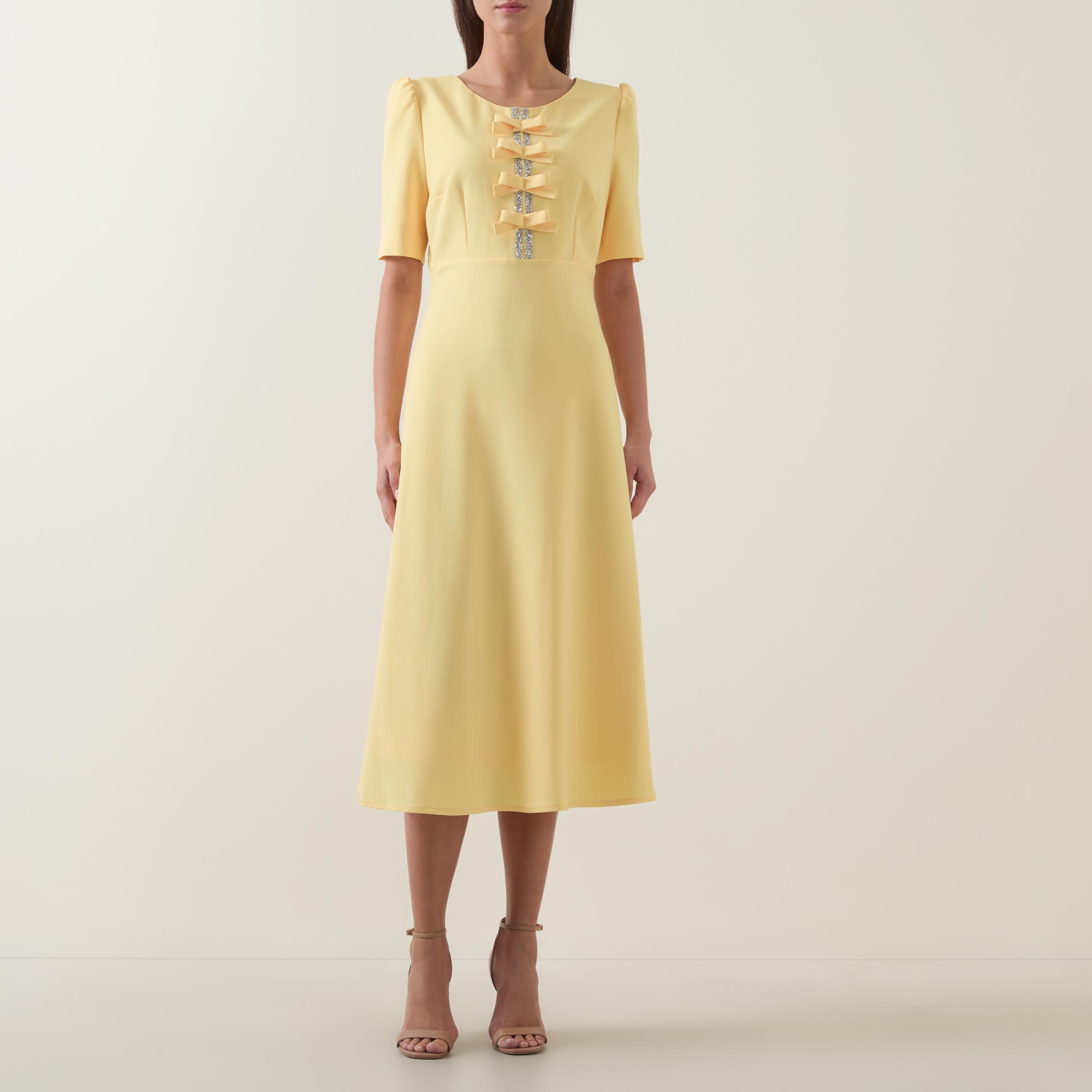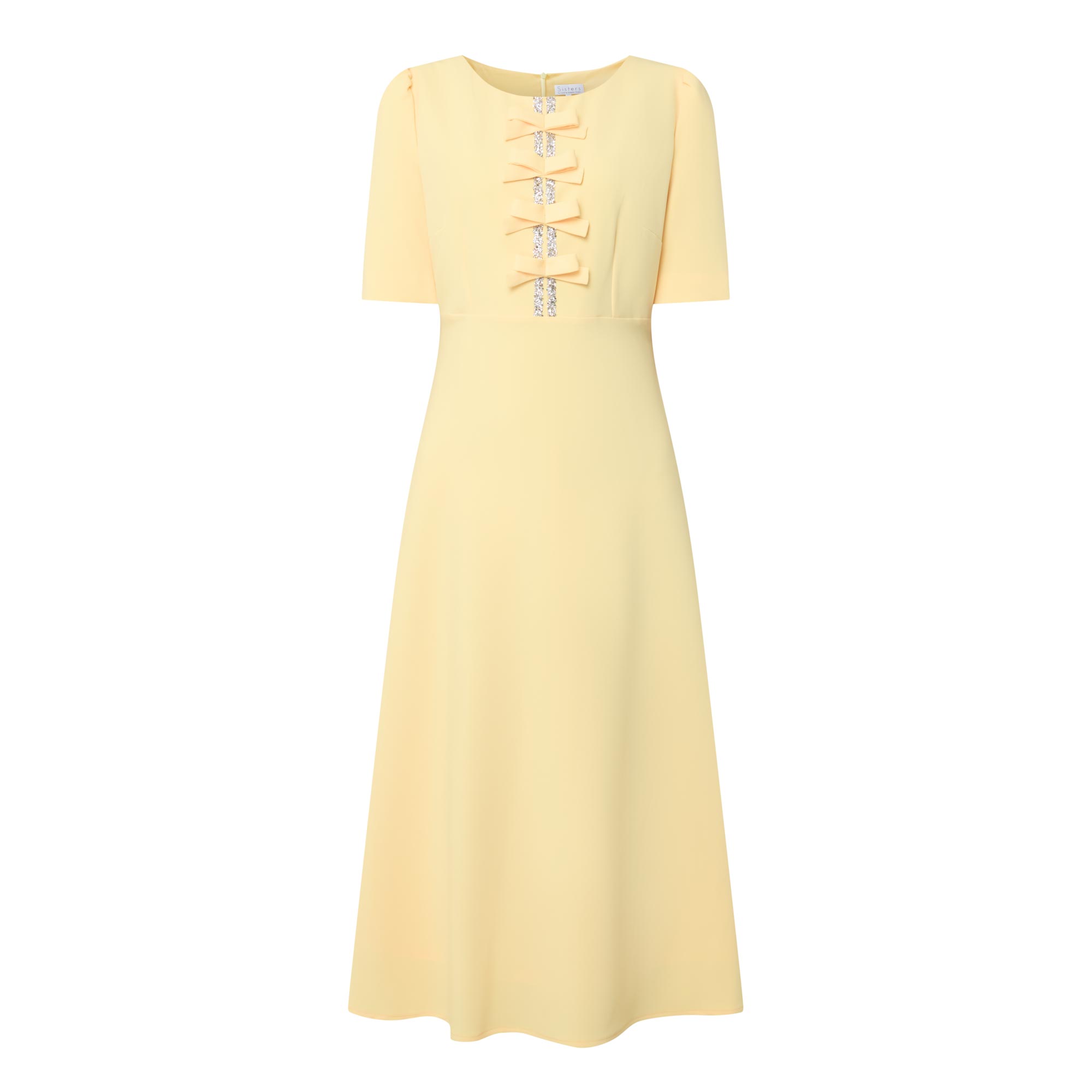 - Crew neck, puff shoulders, short sleeves, concealed rear zip fastening, bow detailing along the front, fitted through the waist, flared skirt, straight hem, lined, midi length